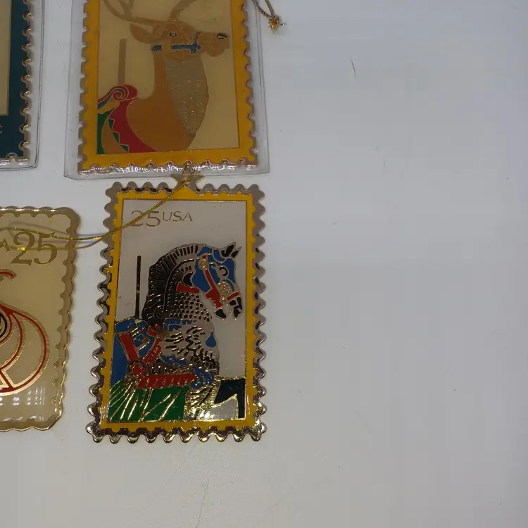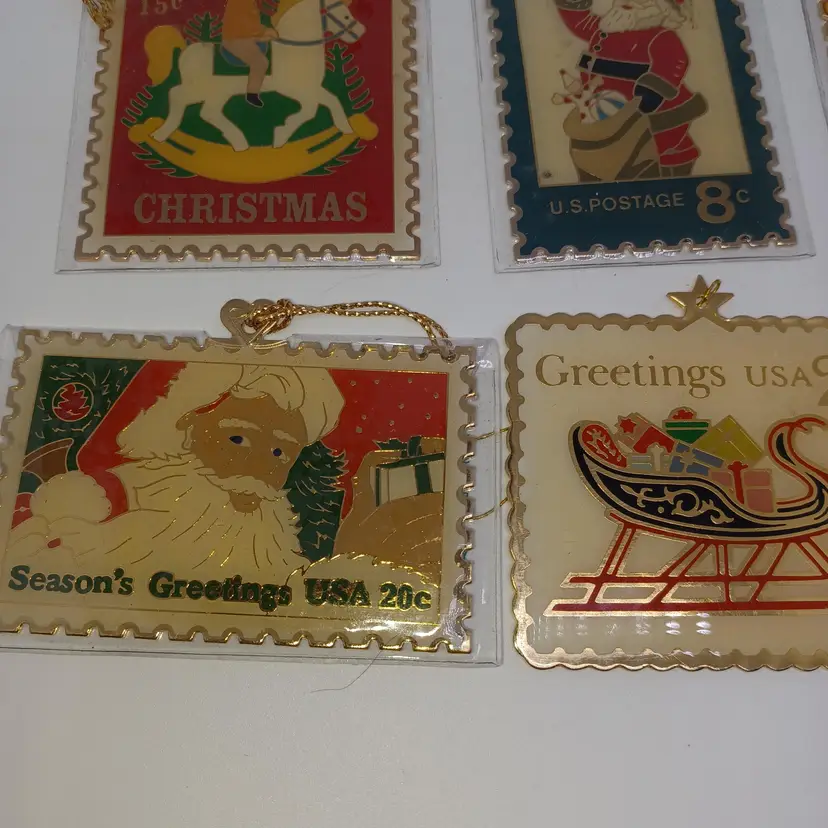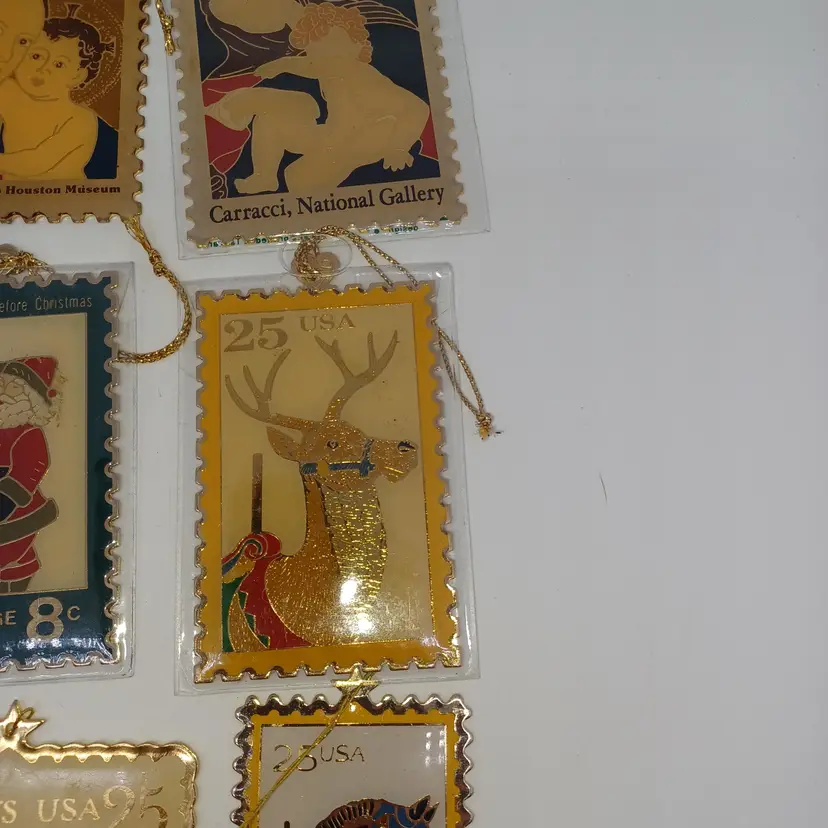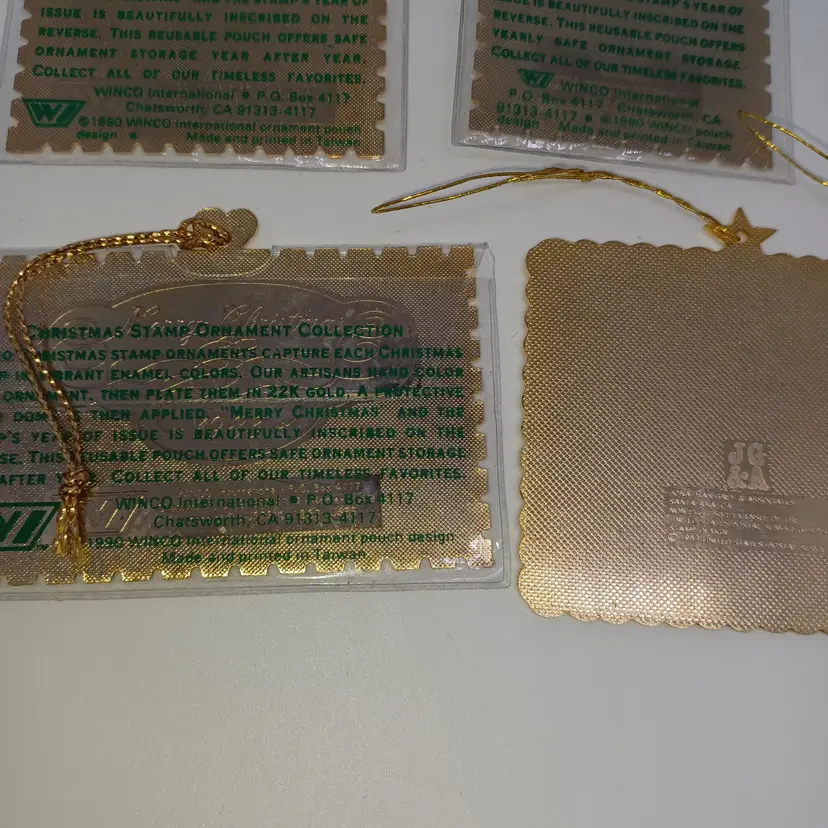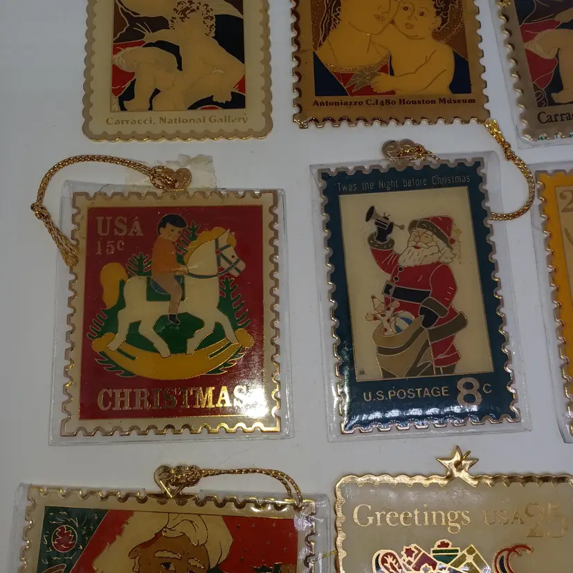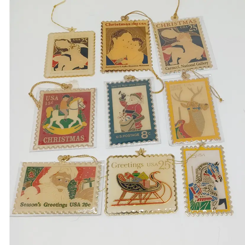 9 Piece 22 karat gold Place Christmas stamp ornament collection made by Winco in 1990 in great vintage condition a few may have some slight scratches but most are in their original plastic coverings please see all pictures as they are the best description all items from a smoke-free home with pets experienced shipper