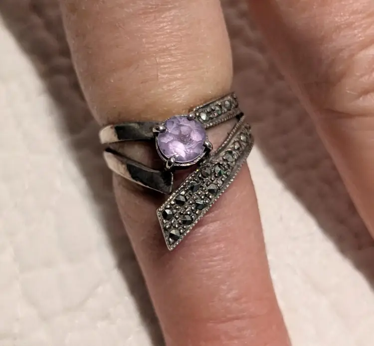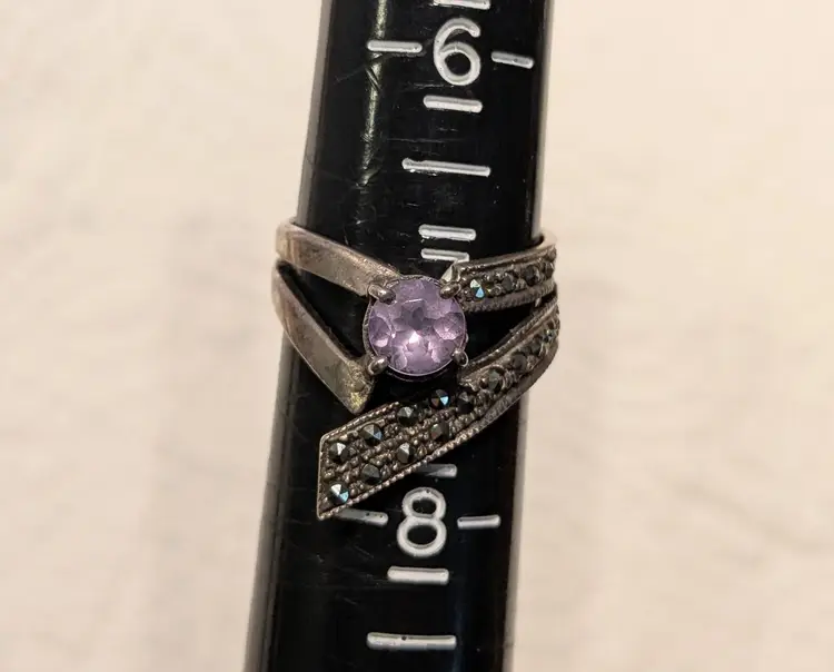 The front face of this ring is 3/4" long. All marcasite are present. Marked 925