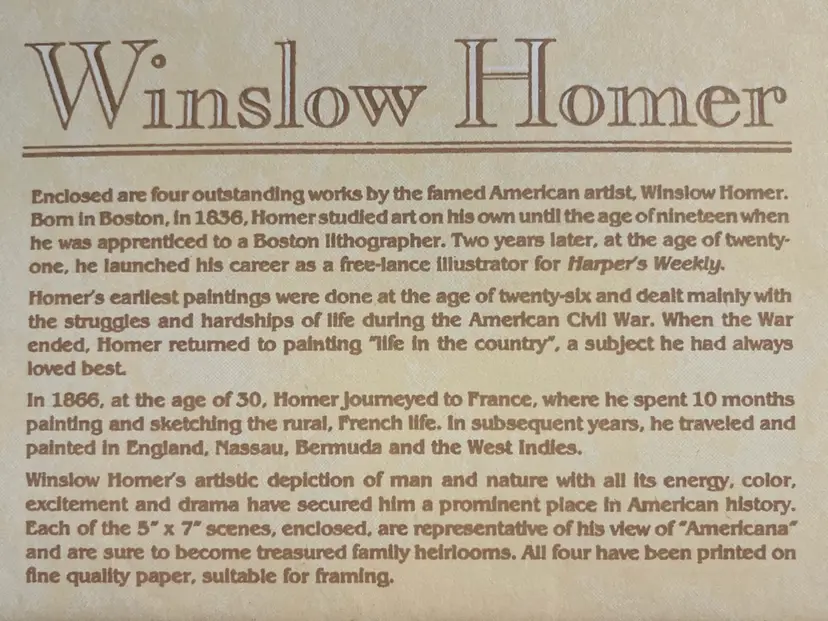 Grab this gorgeous set of 4 Winslow Homer prints! These 5x7s are the ultimate "instant collection"—classic, high-energy American history in a perfectly giftable vintage envelope.