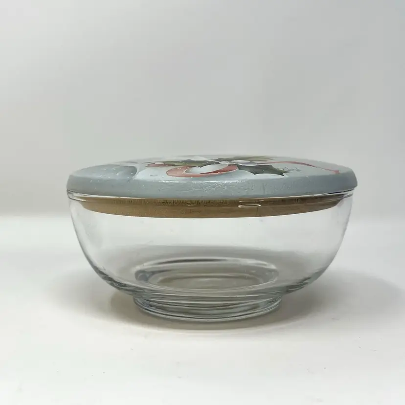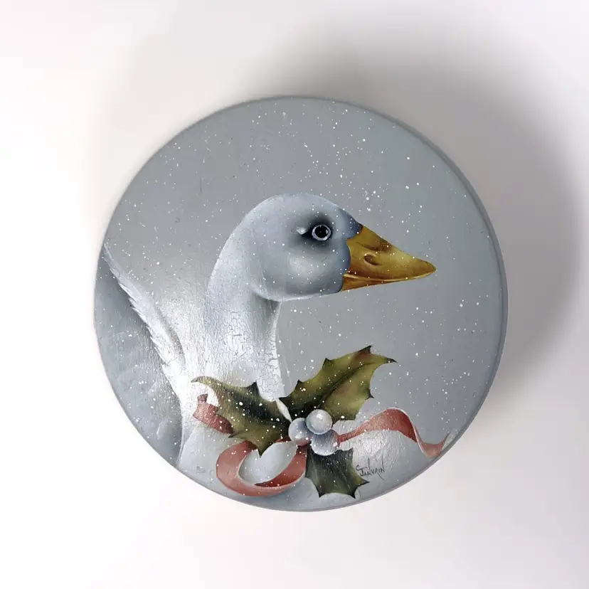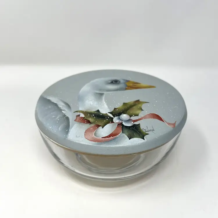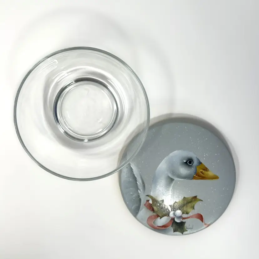 Relive the magic of a 1980s holiday season with this classic winter goose candy bowl / trinket dish. The 4.75" clear glass bowl has a hand-painted wooden lid adorned with a charming Fitz and Floyd-style goose wearing holly and red flowing ribbon on a gray and snowy background. Fill with candy or nuts, use for a holiday hostess gift, or just place it anywhere in your home for a nostalgic touch of 80s goose décor.