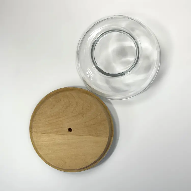 DETAILS: • Dimensions: Height: 2.25", Diameter: 4.75", Weight: 10oz • Markings: Artist Signature on Lid • Date of Manufacture: c1980s-1990s • Materials: Glass Bowl, Wood Lid • Color(s): Clear Bowl; Gray, White, Red, Green Lid