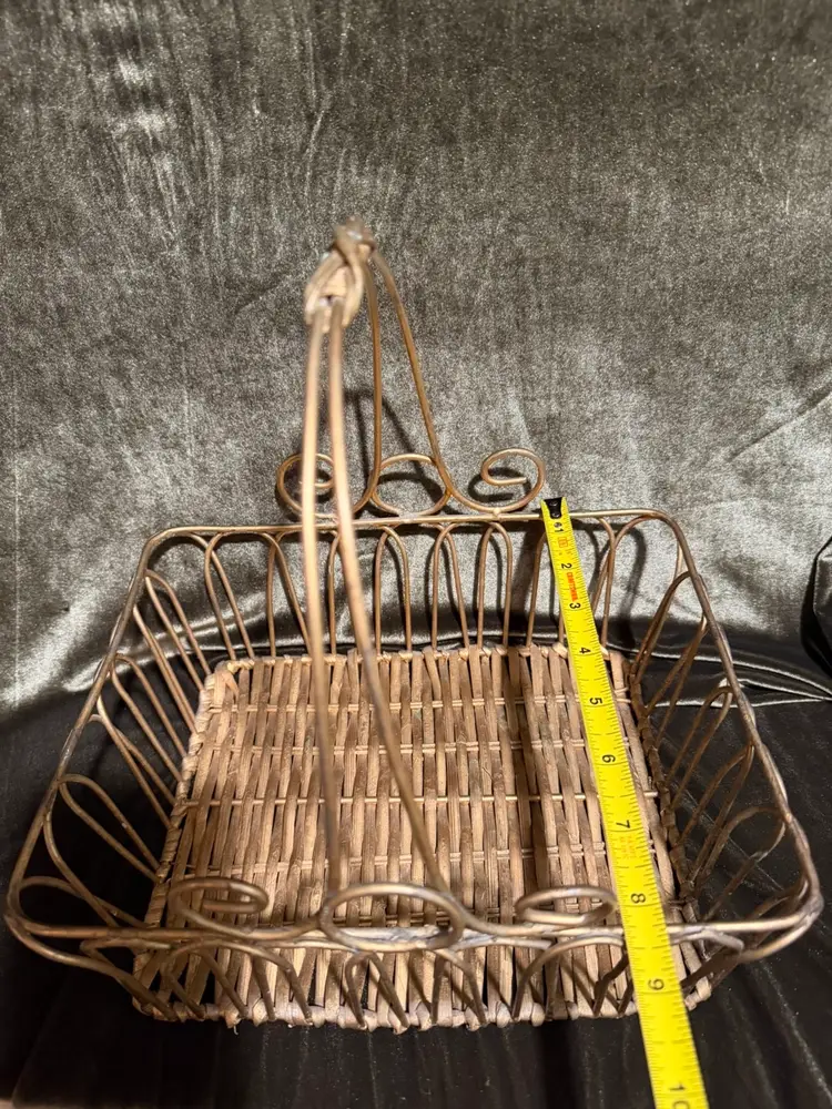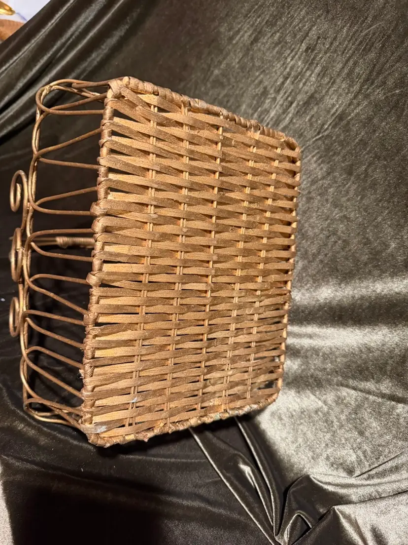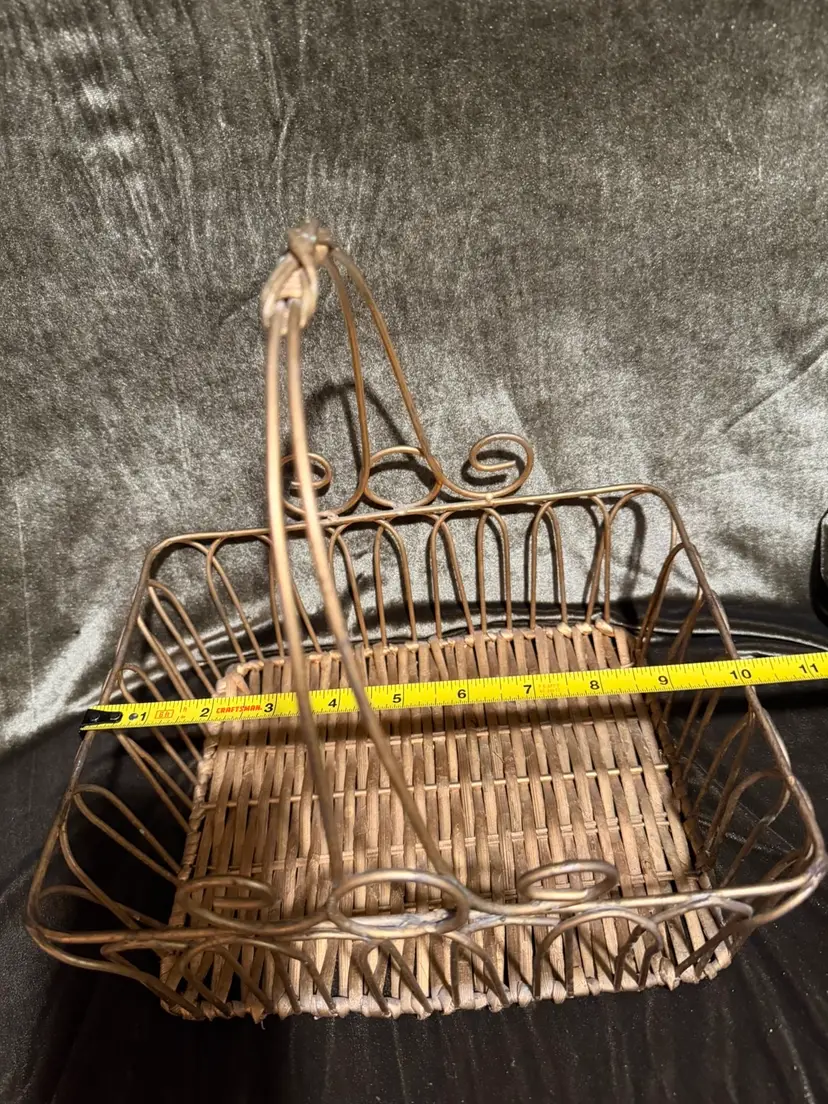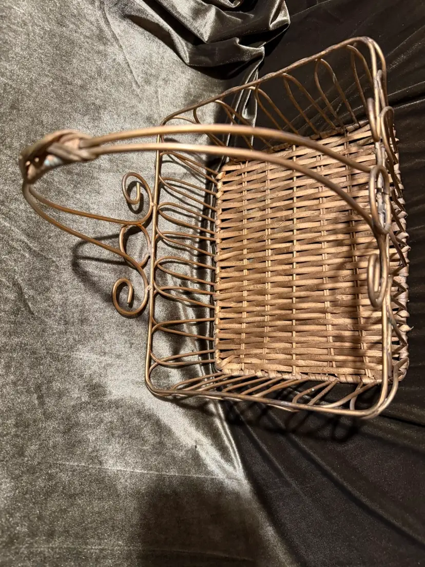 A decorative rectangular basket featuring a gold-toned metal wire frame with elegant scrollwork accents and a woven natural fiber base, complete with a high-arched handle. Perfect for an Easter basket or Gift basket!