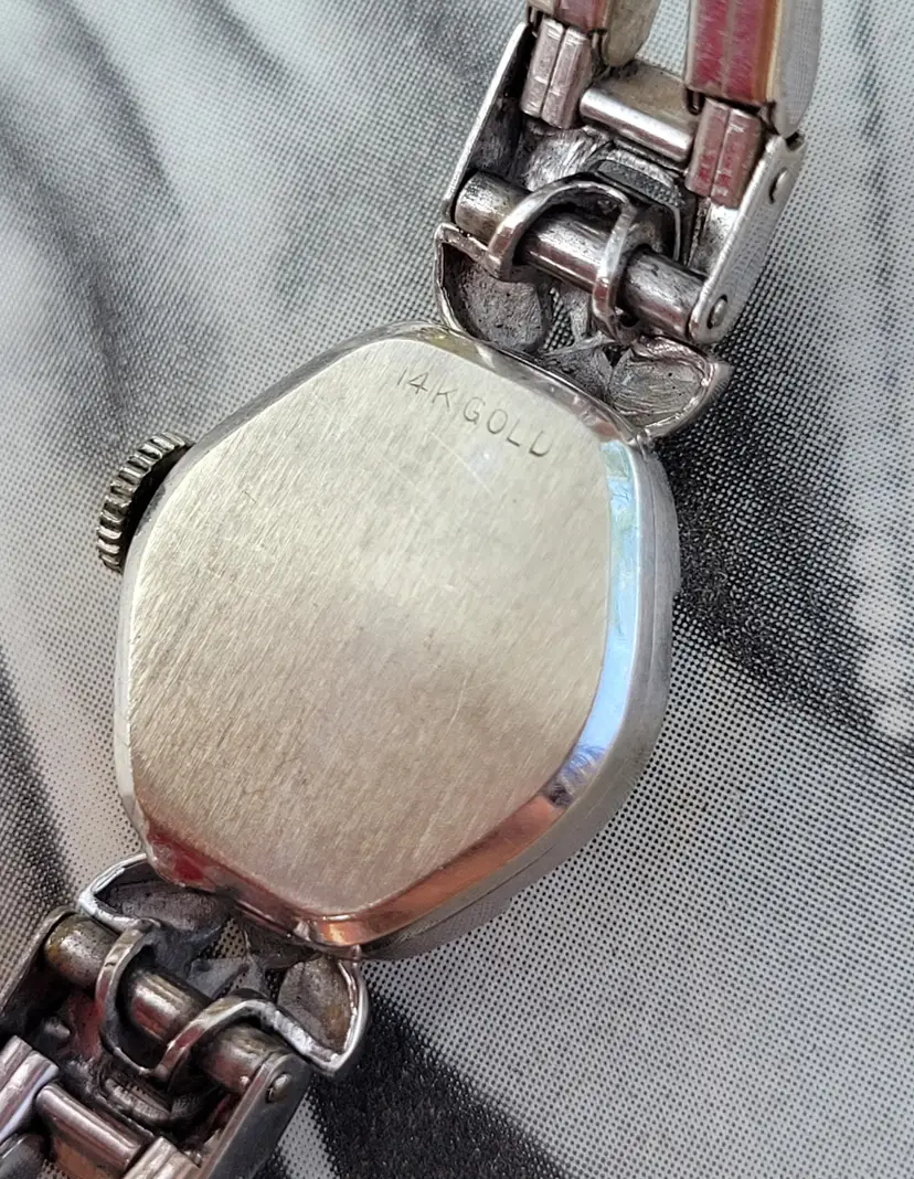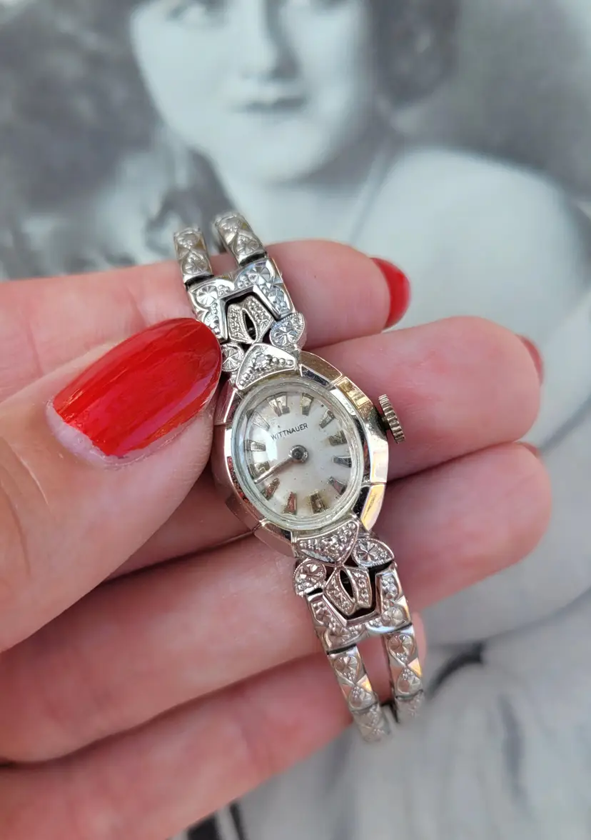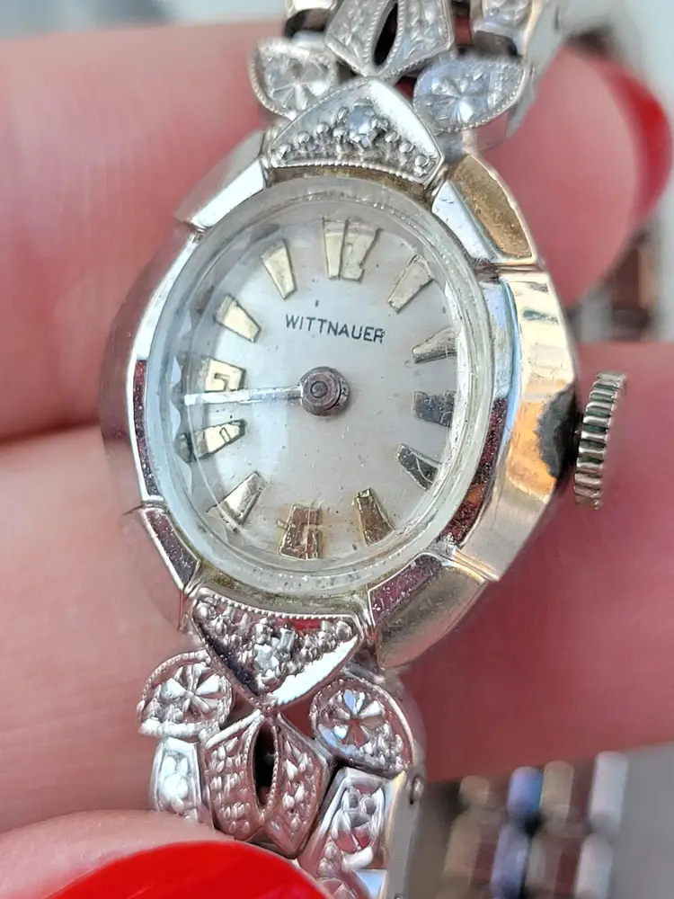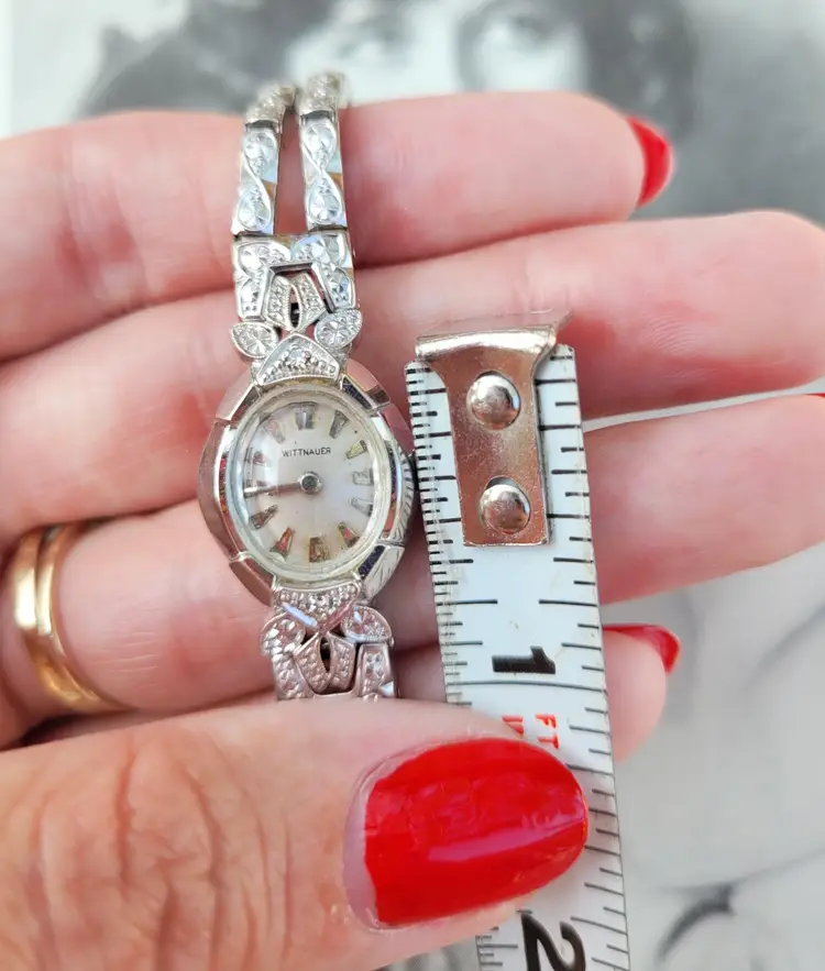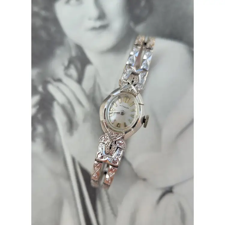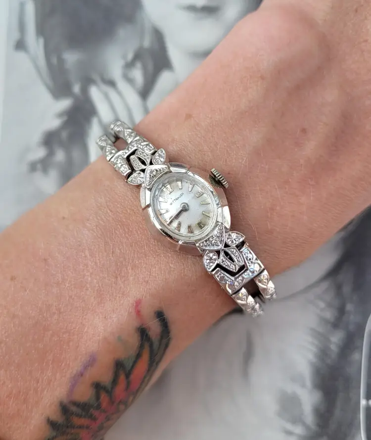 Gorgeous 1960s Wittnauer by Longines ladies wristwatch, in solid 14k white gold with two genuine diamonds. The gemstones have been verified via Presidium tester, and the expandable band appears to be gold filled. The watch was tested over 24 hours and works well. Please see pictures for details and measurements. Thanks for looking!