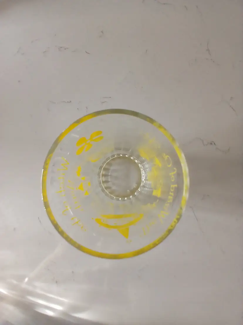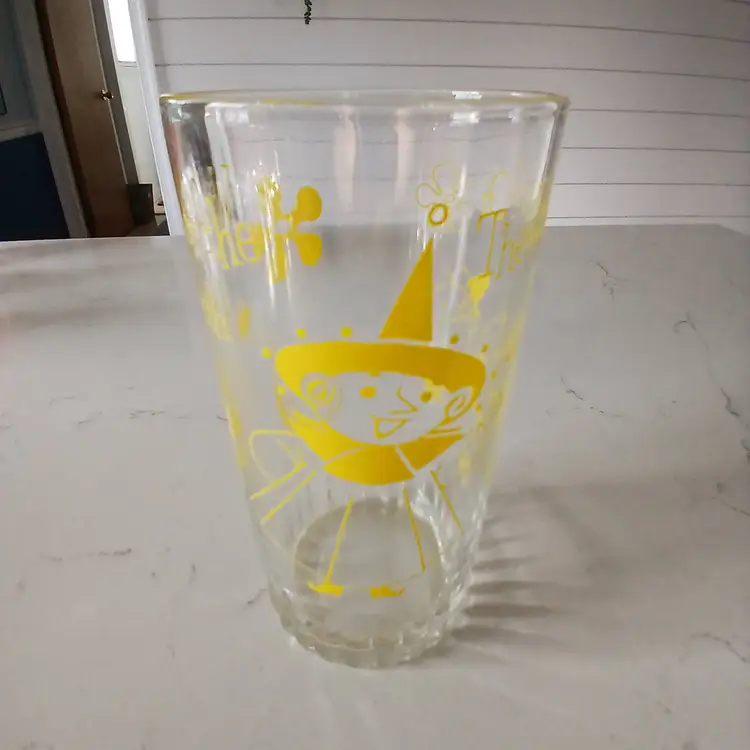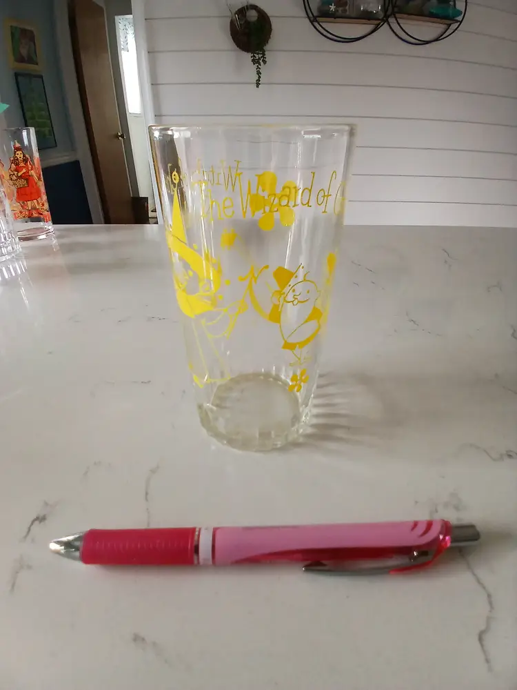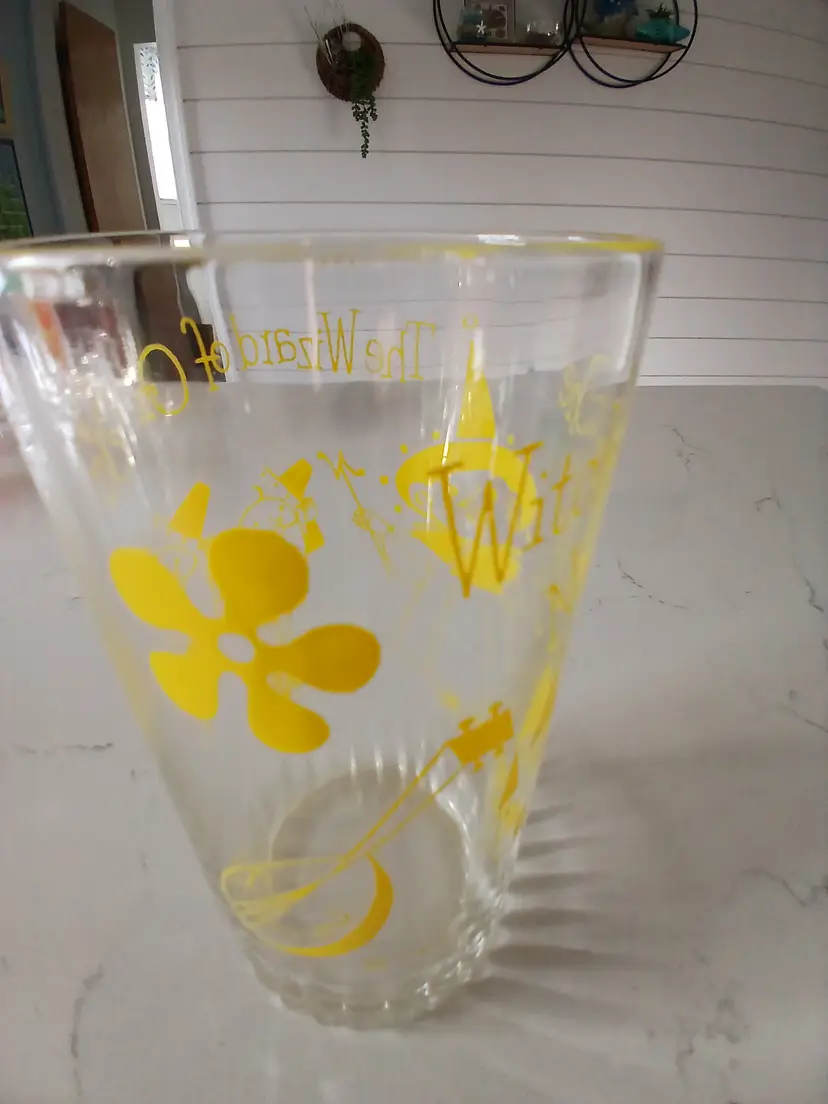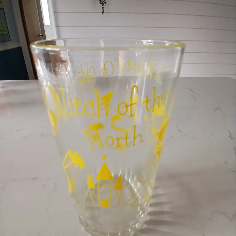 This vintage glass tumbler features charming yellow graphics from the classic Wizard of Oz. It's in great condition with no chips or cracks. Perfect for collectors or fans of the iconic movie. This glass has the Witch of the North.This is a rare glass.Has a ribbed bottom but looks nice with the other glasses I have.