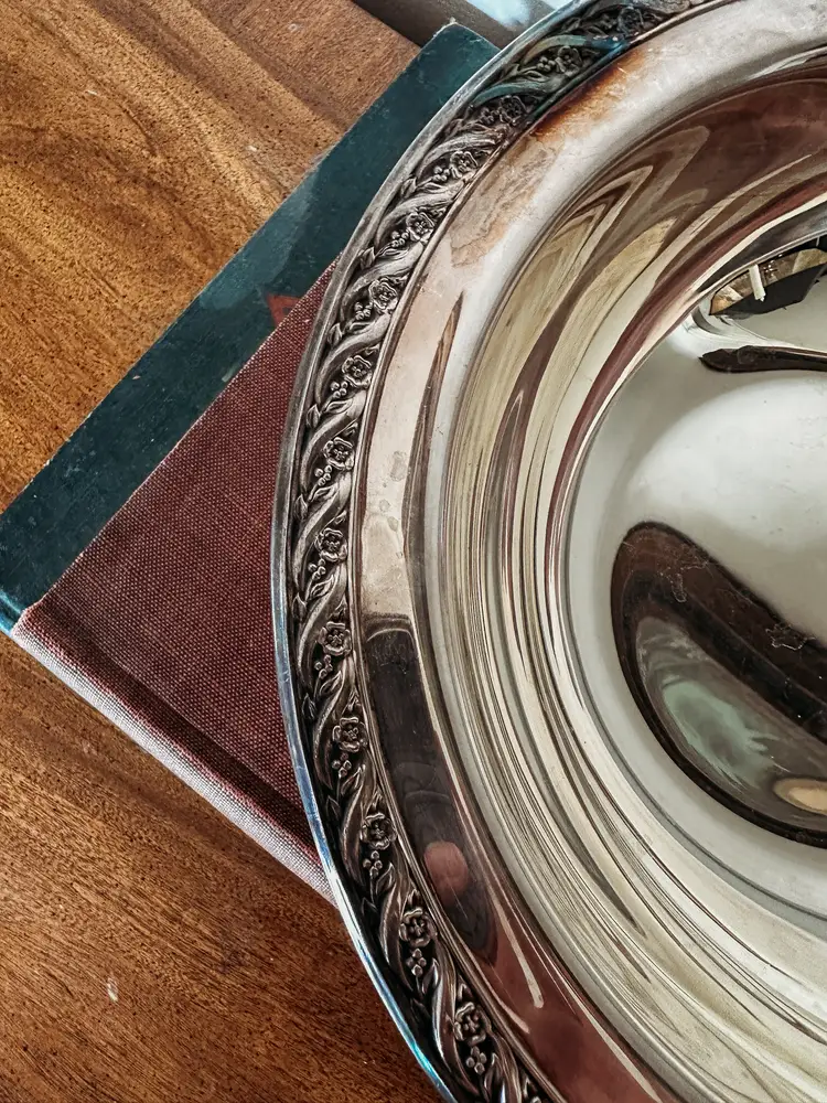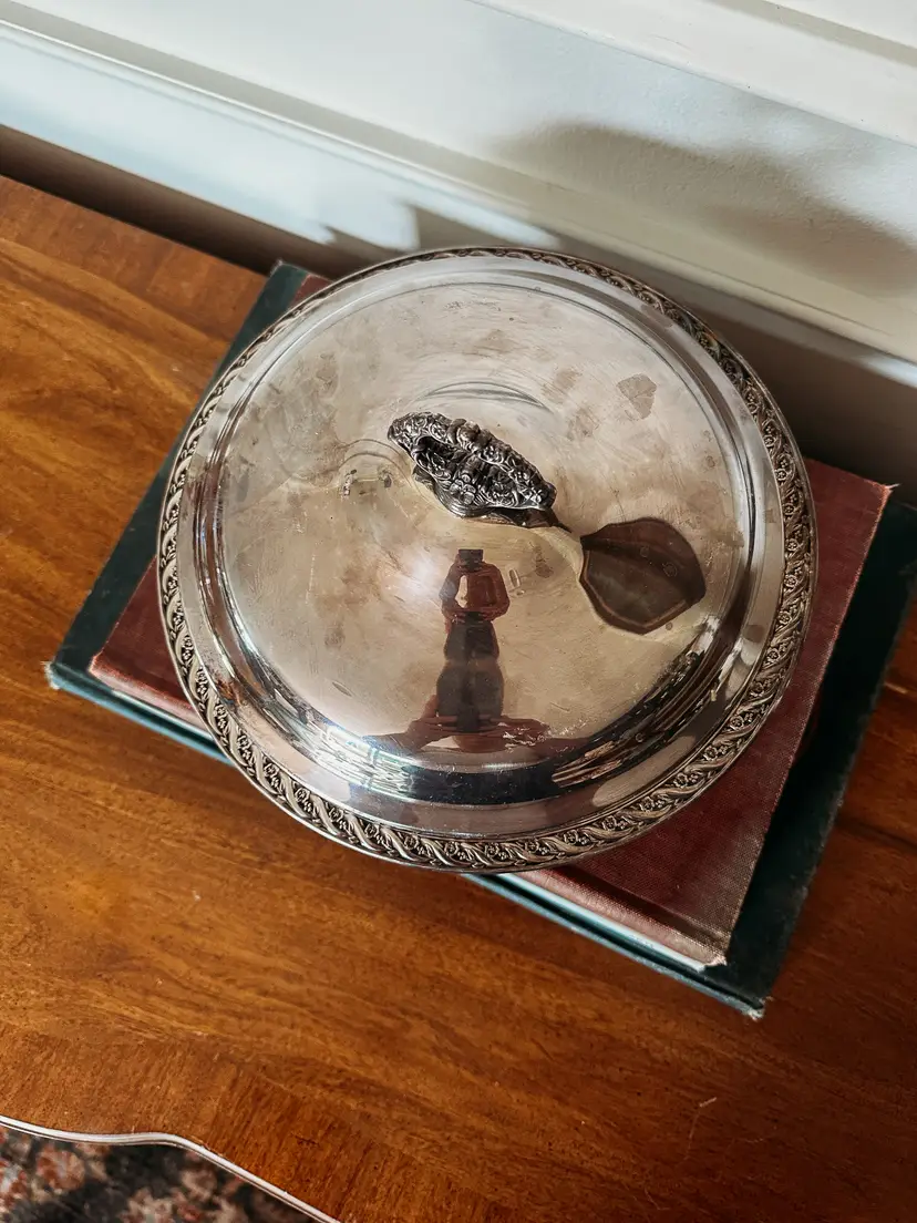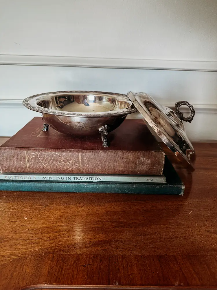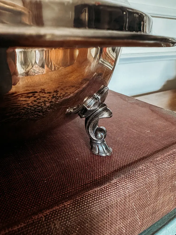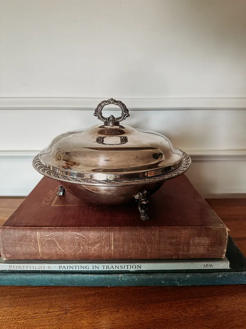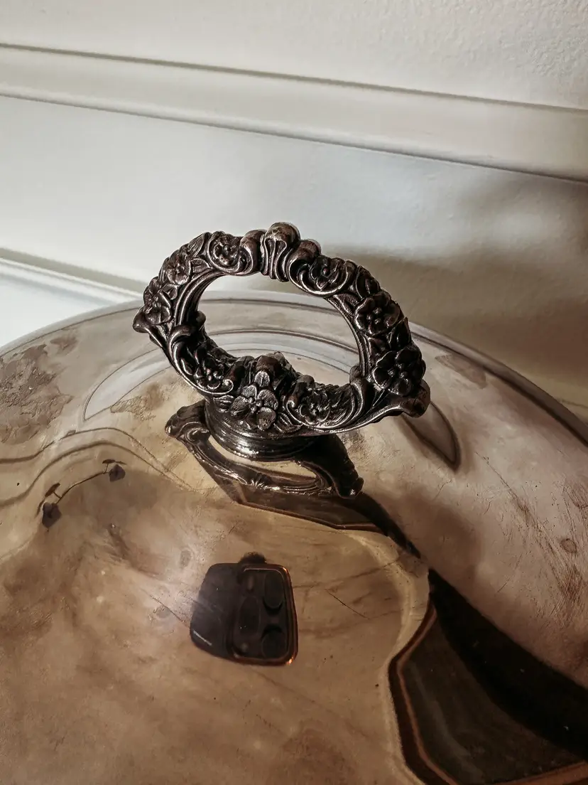 This vintage WM Rogers & Son silverplate covered serving dish with lid features a Victorian style. This is the "Spring Floral" pattern. Originally this held a glass bowl which unfortunately is not included in this beautiful set. The footed design adds a touch of elegance to this piece, making it perfect for serving dishes at special occasions or gatherings. The silverplate material adds a classic and timeless appeal to this item, ideal for collectors or those looking to add a touch of vintage charm to their table setting.