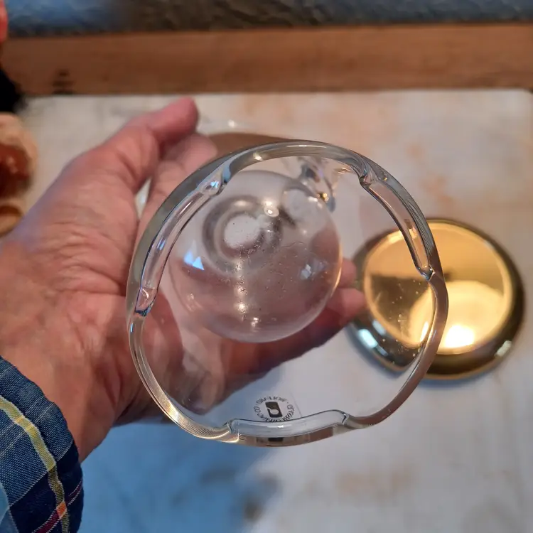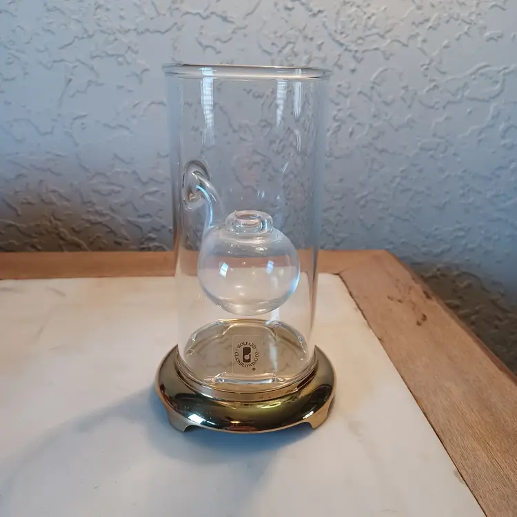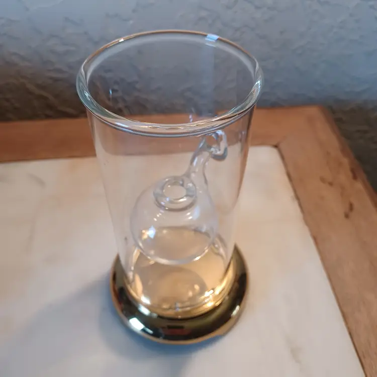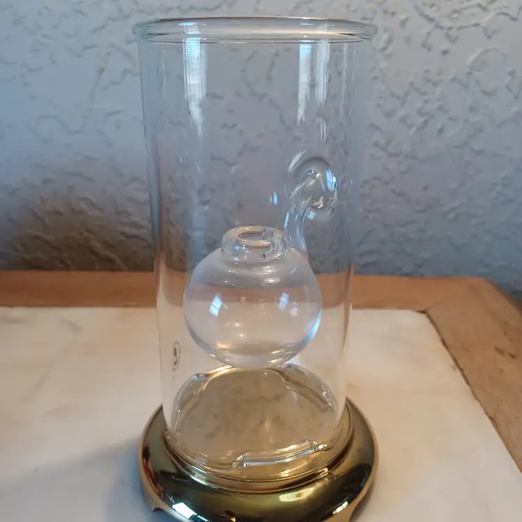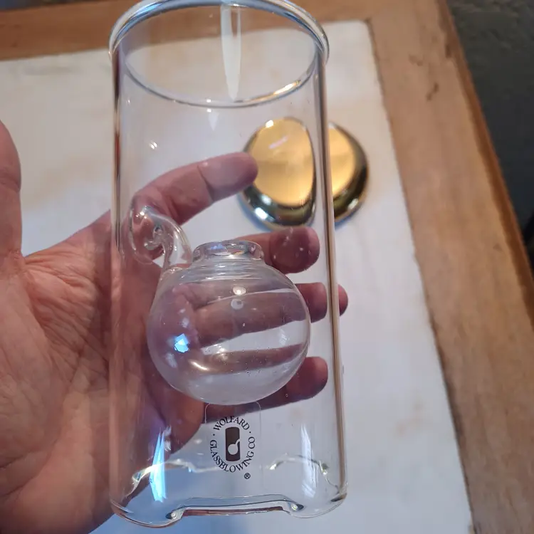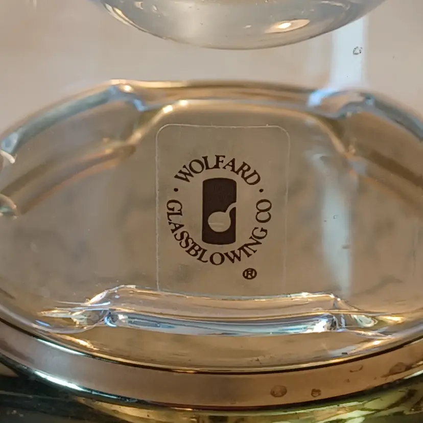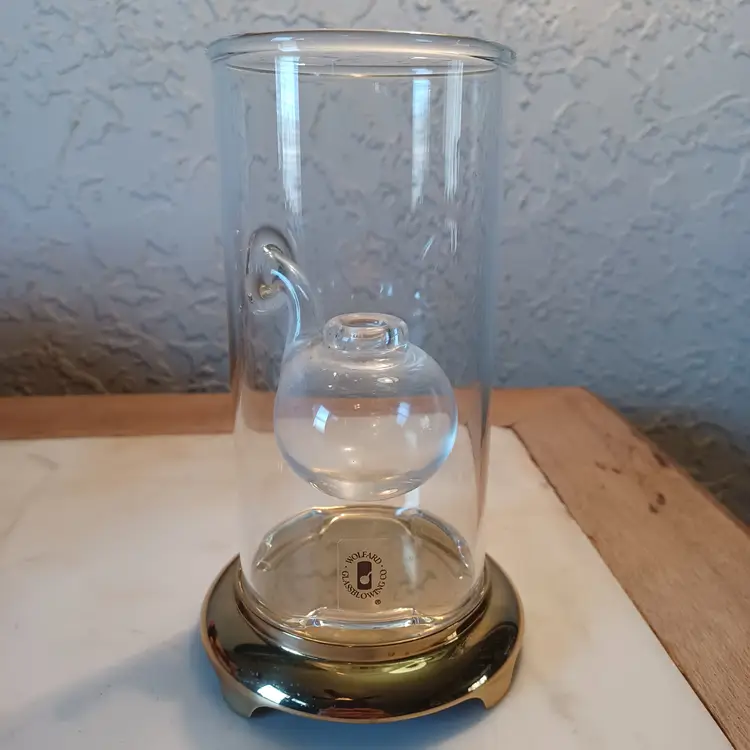 This vintage Wolfard Glass Blowing Co. oil lamp features the company’s signature minimalist design with clear hand-blown glass and a solid brass base. Standing approximately 7 inches tall, it offers a timeless aesthetic that works beautifully in modern, farmhouse, or traditional décor settings.