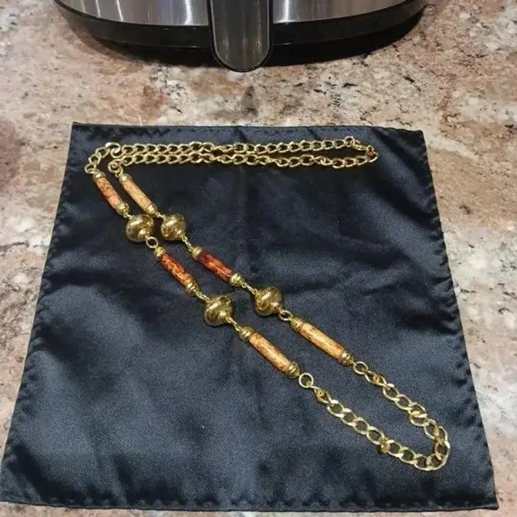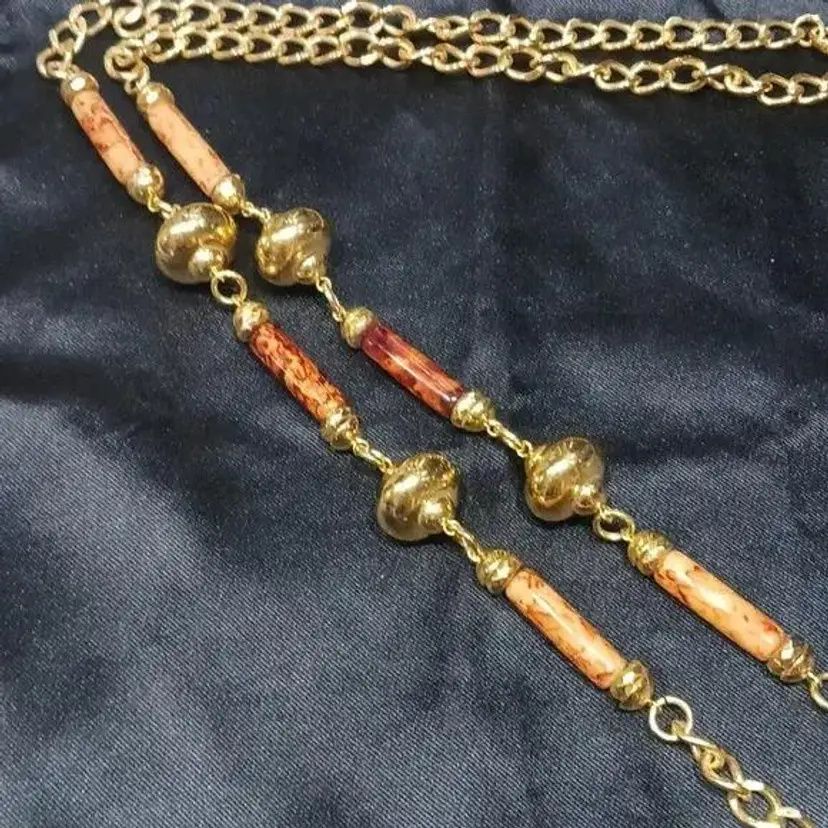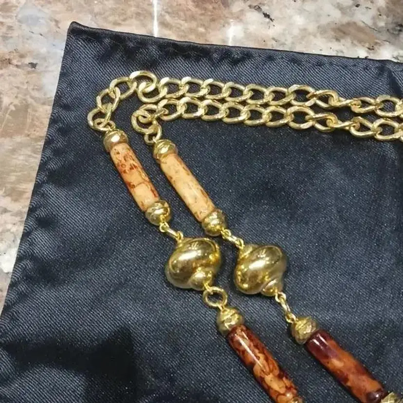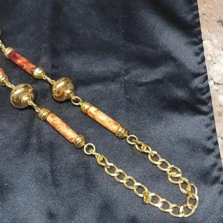 Vintage Women's 36” Faux Burl Wood Beads Goldtone Flapper Style Necklace. Pre-owned, Great condition.