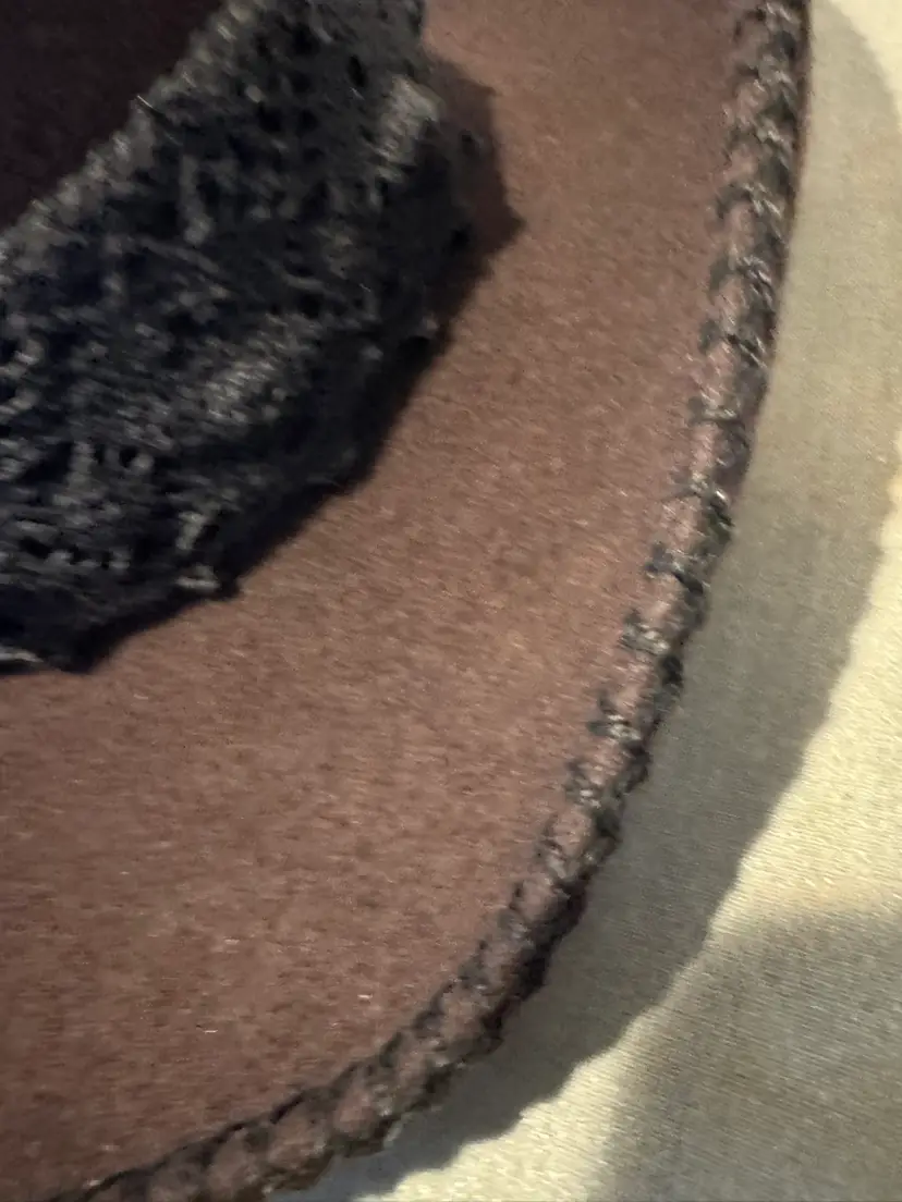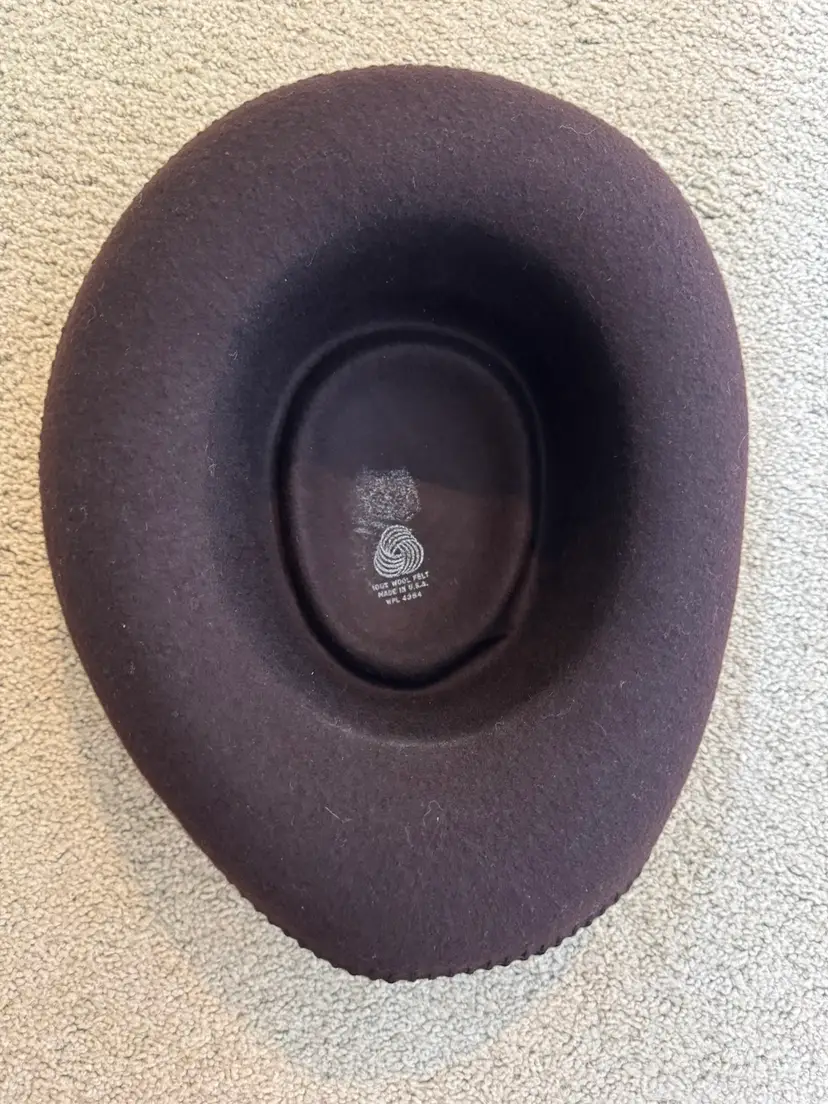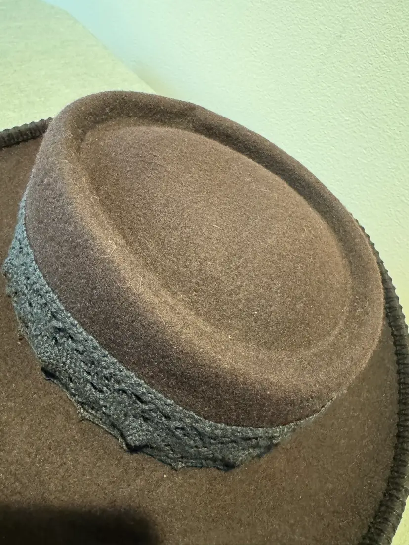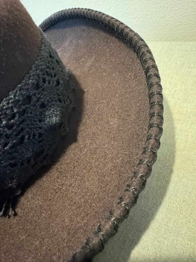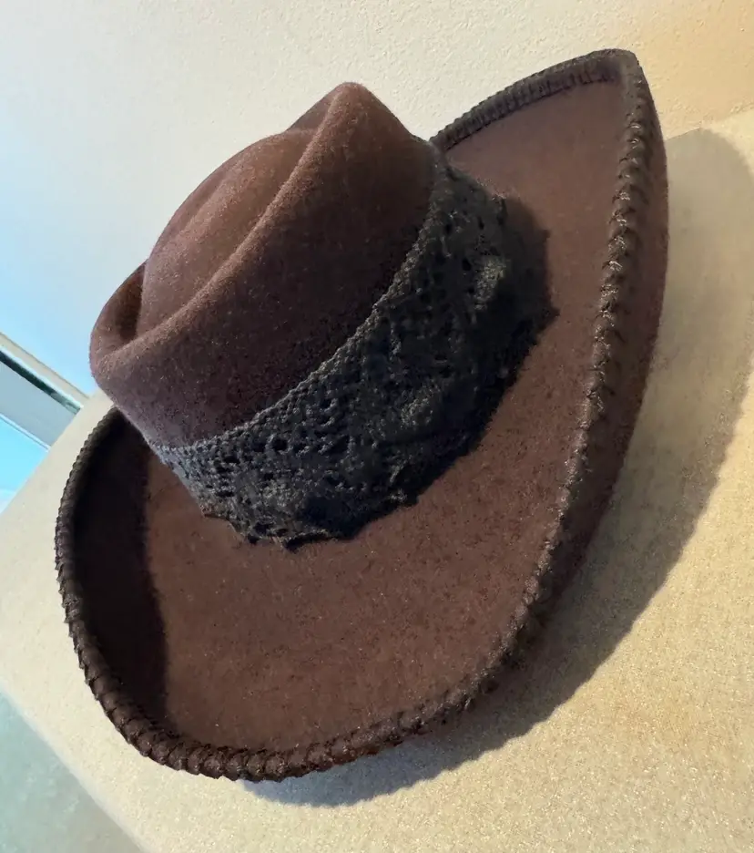 Vintage women’s brown cowboys hat from the 90s With black rim trim and black lace around brim From the store “Hats In The Belfry” 100% wool felt Made in the USA In excellent condition