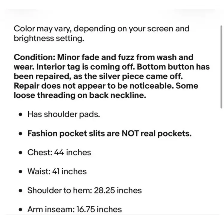 Condition: Minor fade and fuzz from wash and wear. Interior tag is coming off. Bottom button has been repaired, as the silver piece came off. Repair does not appear to be noticeable. Some