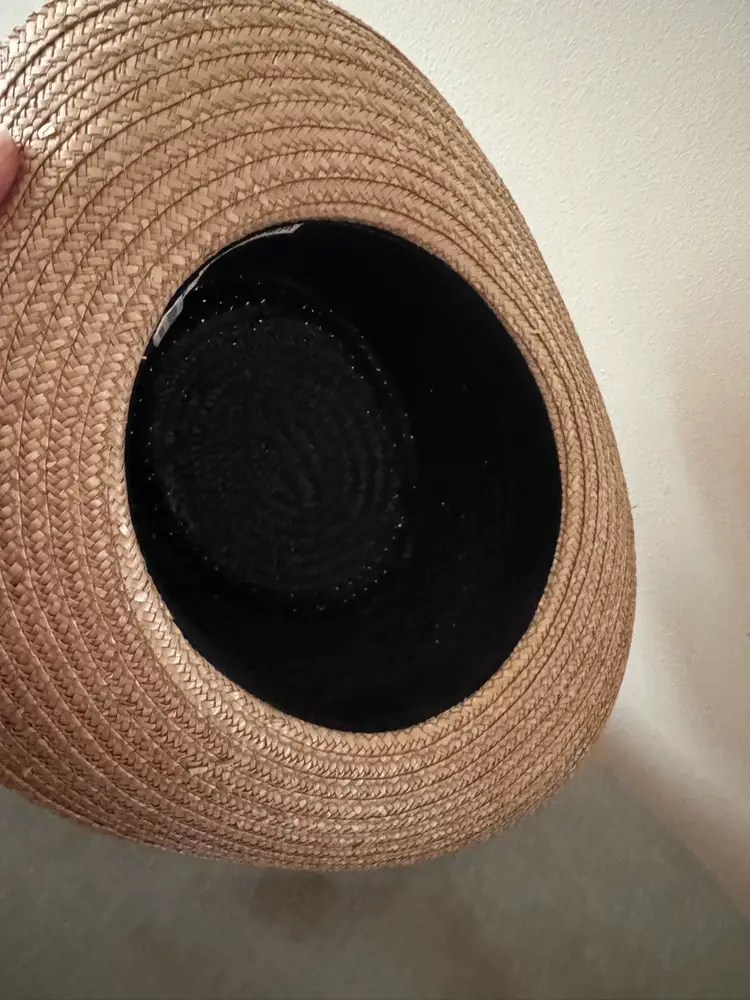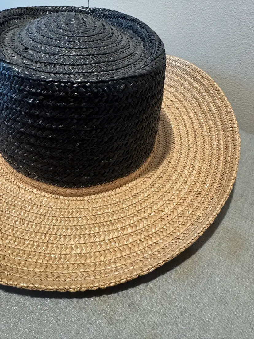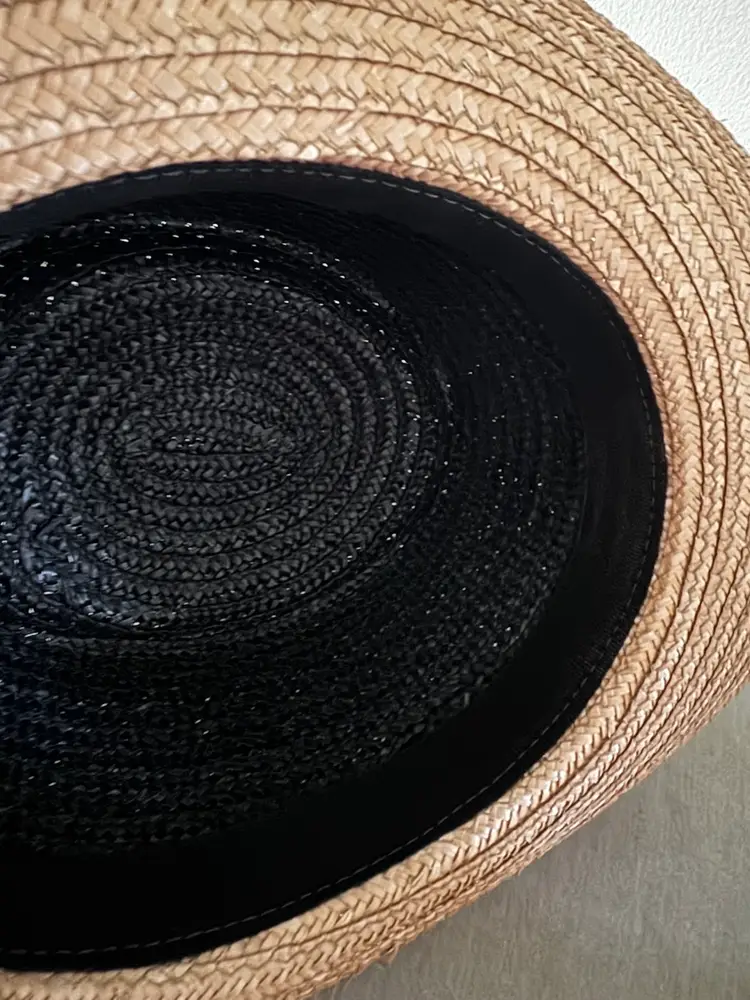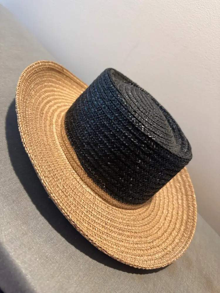 Stylish two-tone straw hat in black and tan. Perfect for adding a touch of elegance to any outfit.