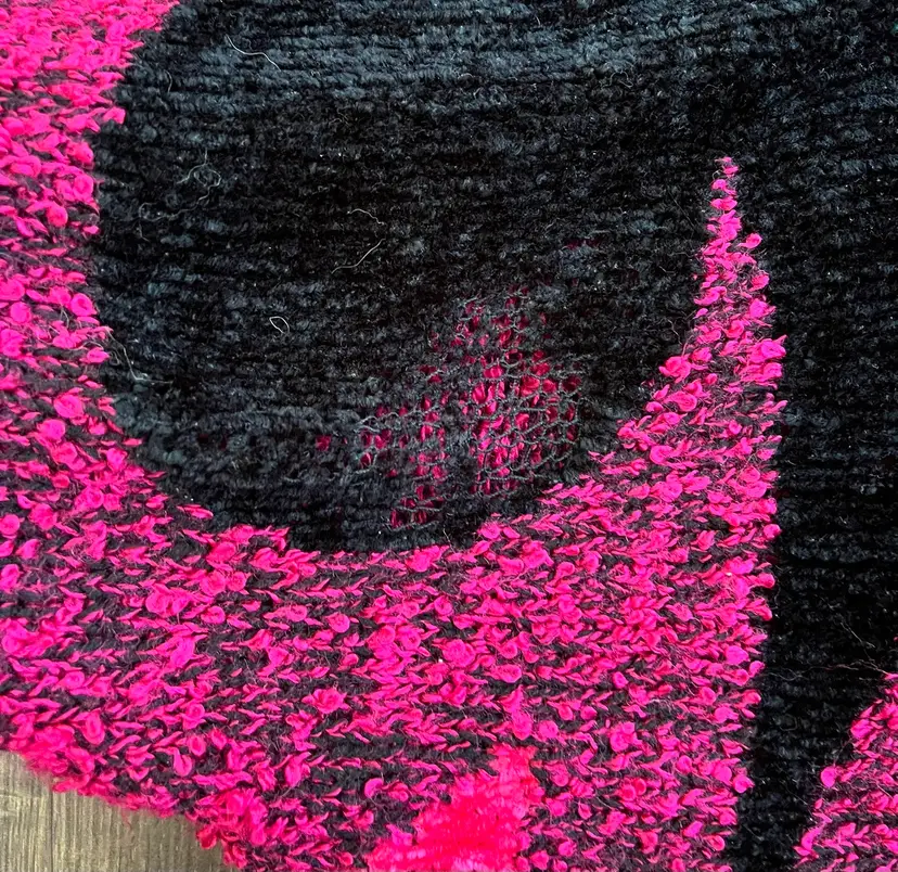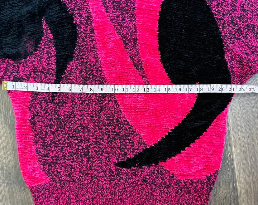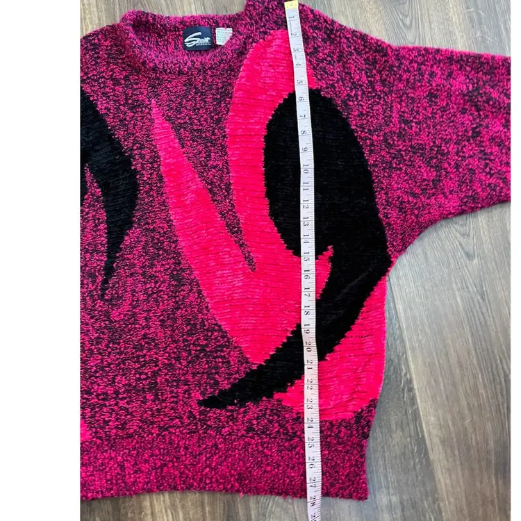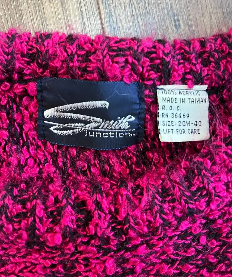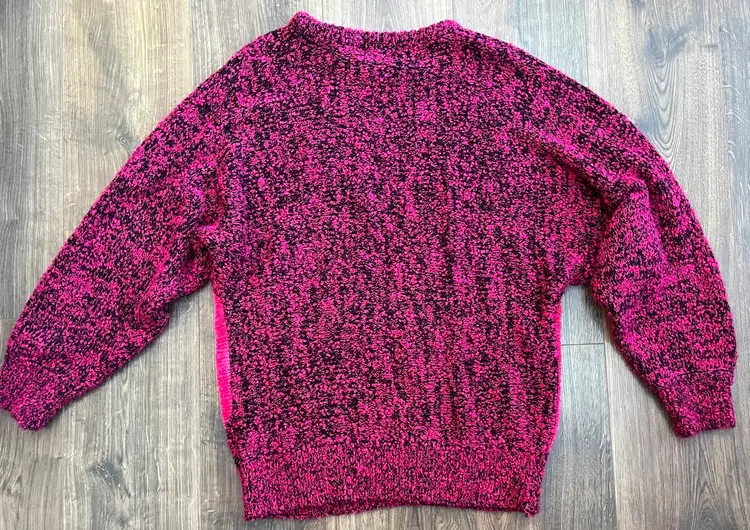 Vivid hot pink and black geometric desige vintage sweater! Very soft! I believe this is 1980s or early ‘90s. Size 20W which is estimated Large. Very nice condition, however one of the black apostrophe-type designs on the front is very thin in one area (see pics), so you may need to wear a tank or similar under this. Priced accordingly.