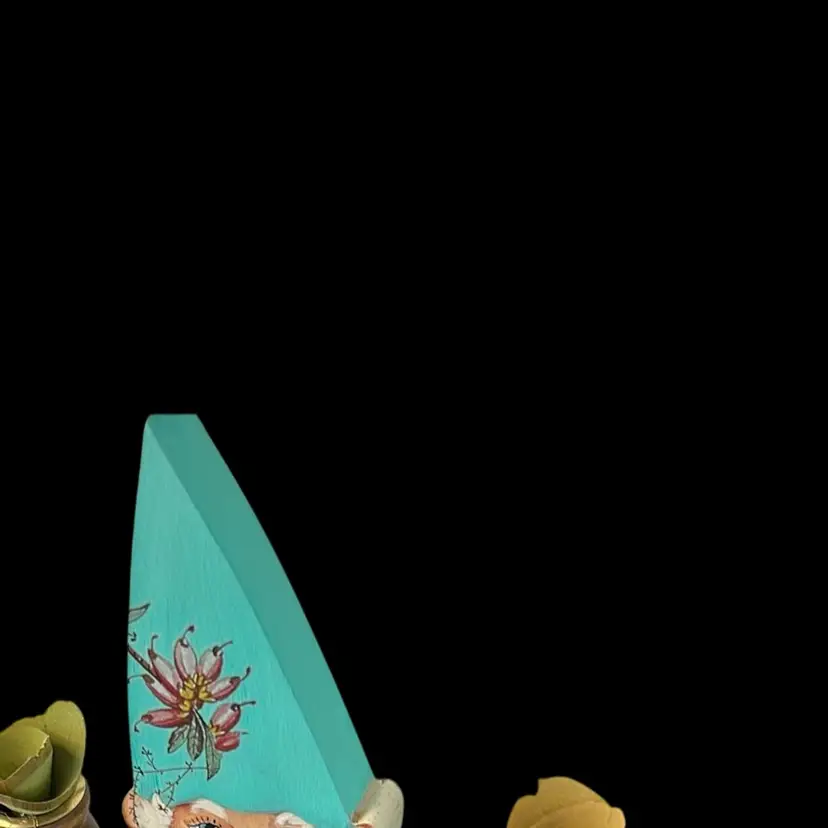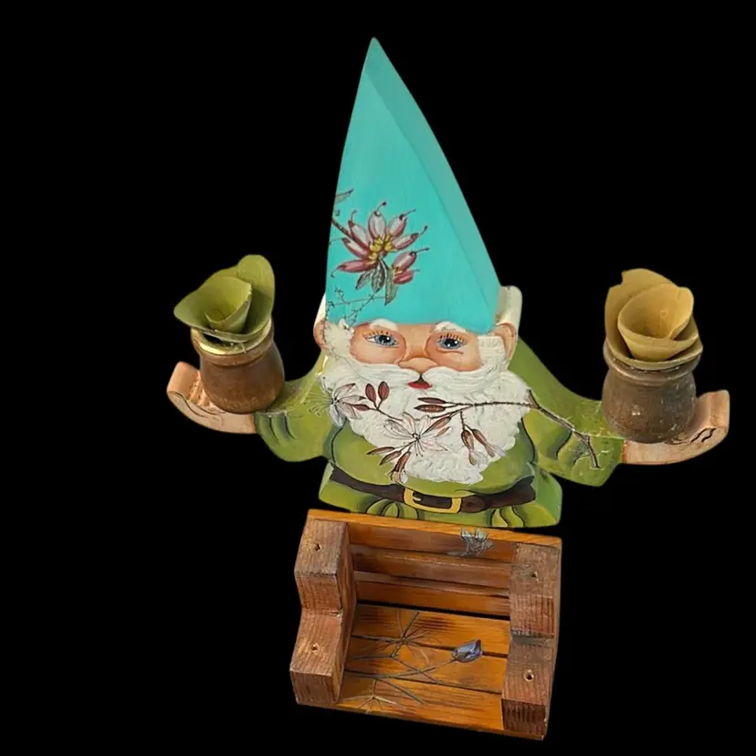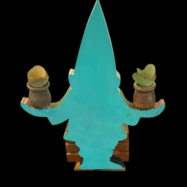 12 x 9" weighs 15ozs. Has a wood chair that sits in front of him for you to fill with faux succulents, plants, etc. Hand painted not by me but I repainted the hat and embellished. Stands alone.