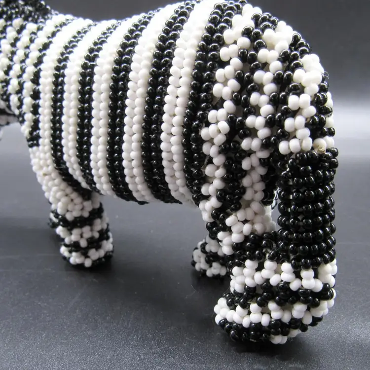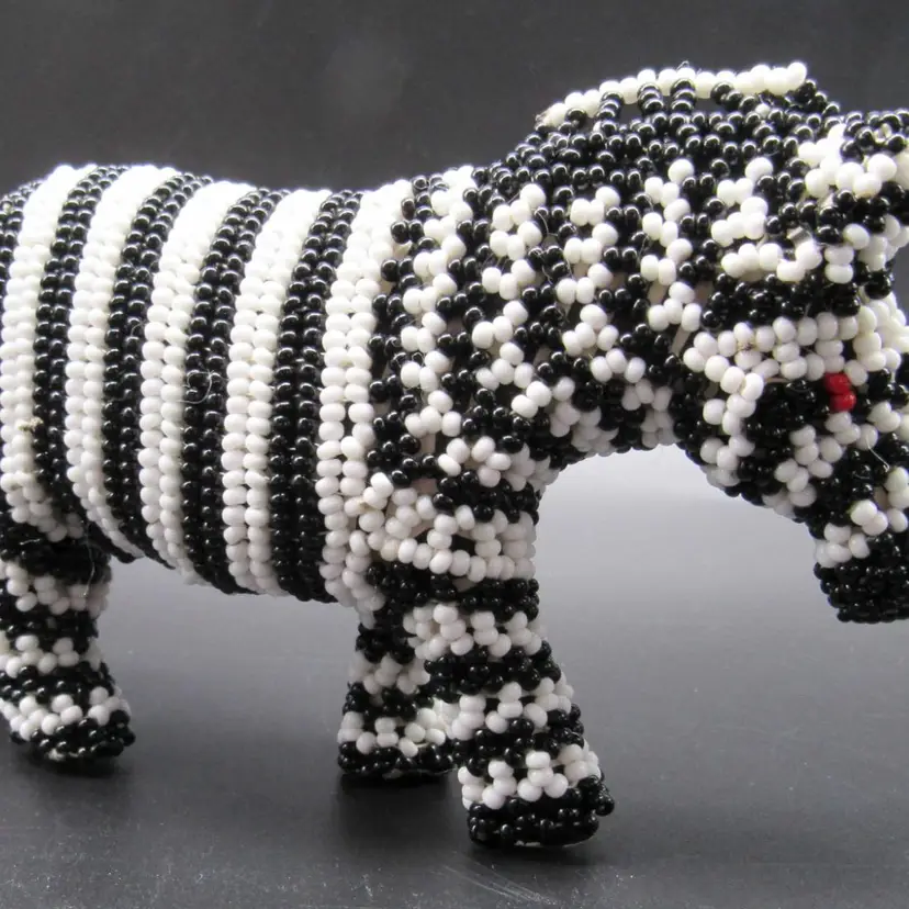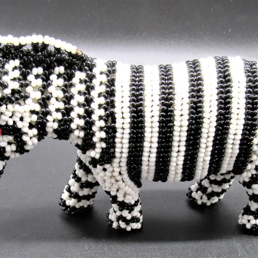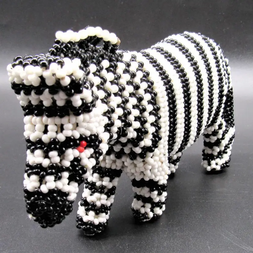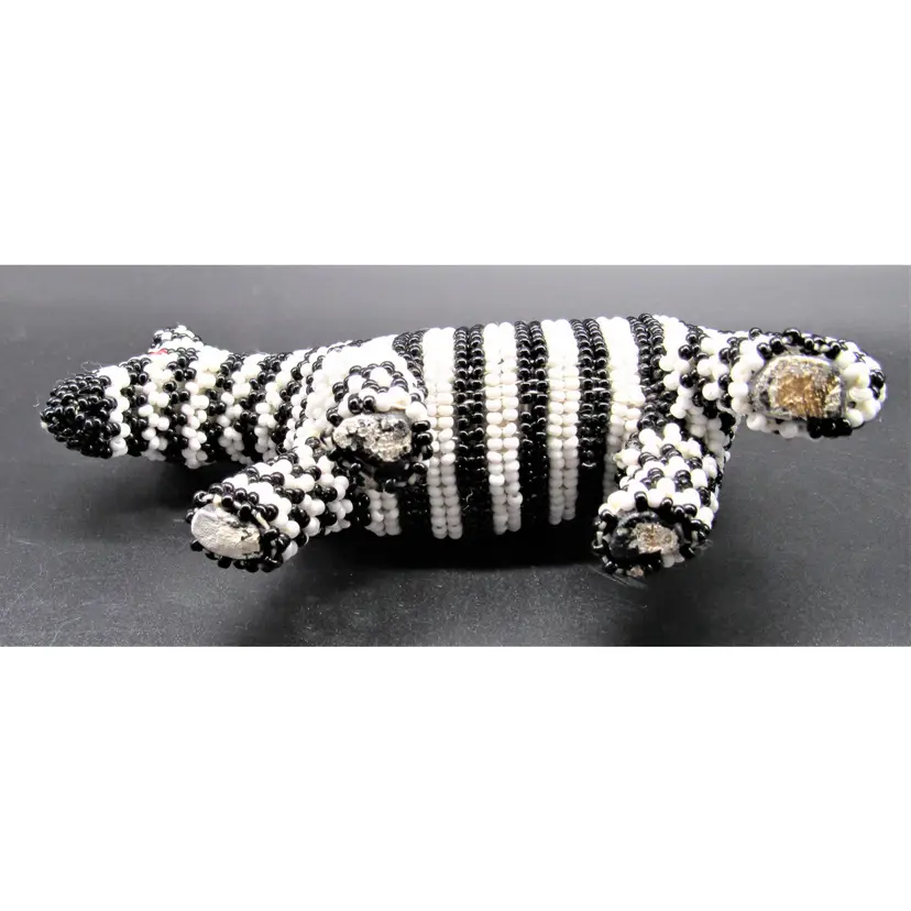 African zebra carved wooden figure embellished with black and white seed beads. Measures just over 3" tall, by 6" long, and a little less than 2" wide. He is in very good shape and weighs just over 6 ounces.