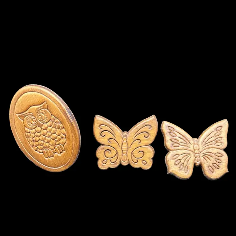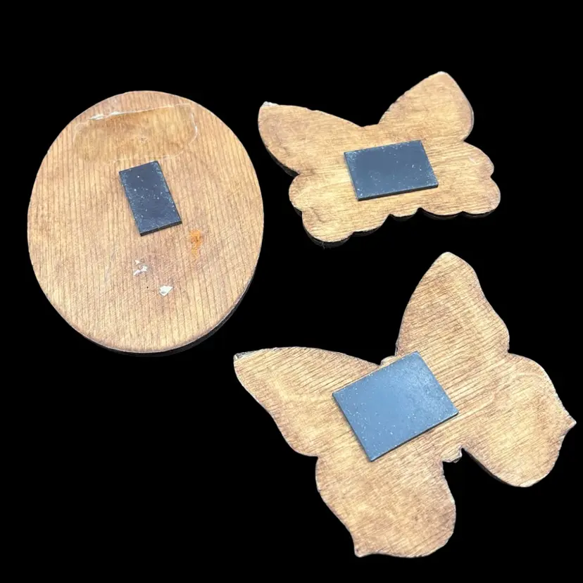 Fun vintage wood carved magnets, 2 butterflies and 1 owl. Butterflies measure 2 3/4” wide by 2 1/2” tall. The owl is oval shaped 4” tall and 2 3/4” wide. There is a rough spot in the wood on the owl, see last picture, they appear to be handmade so there are imperfections (on backs of the butterflies and side of the owl) but don’t detract from the beauty or function.