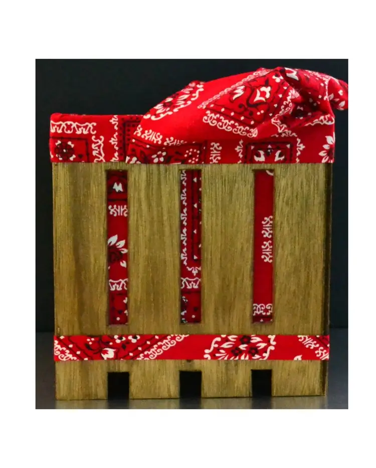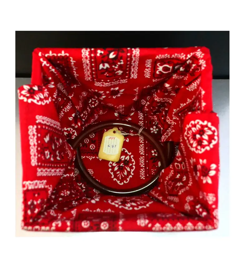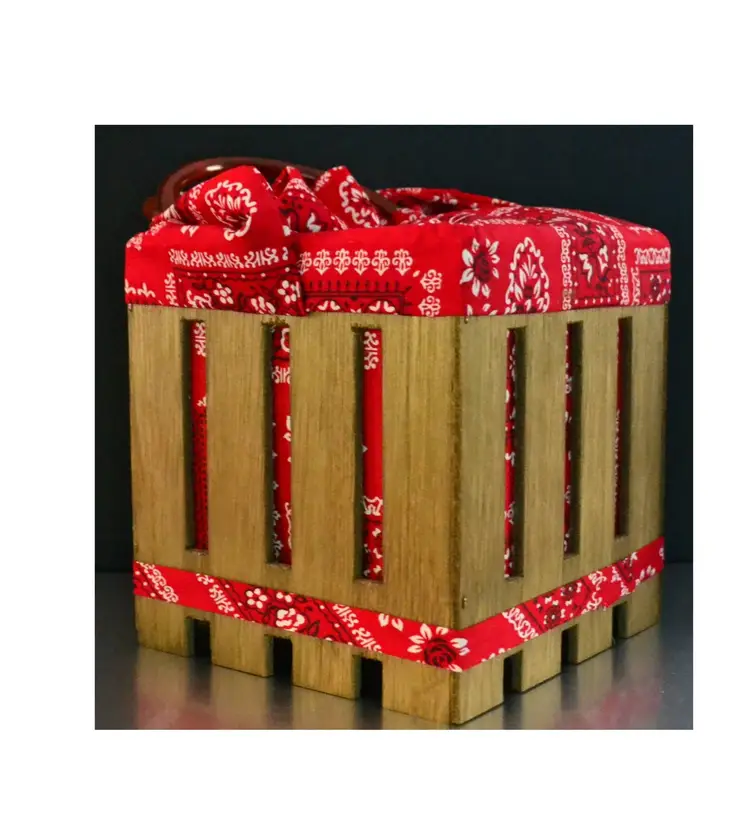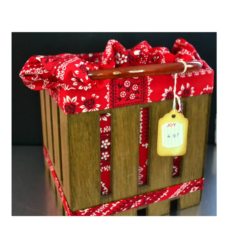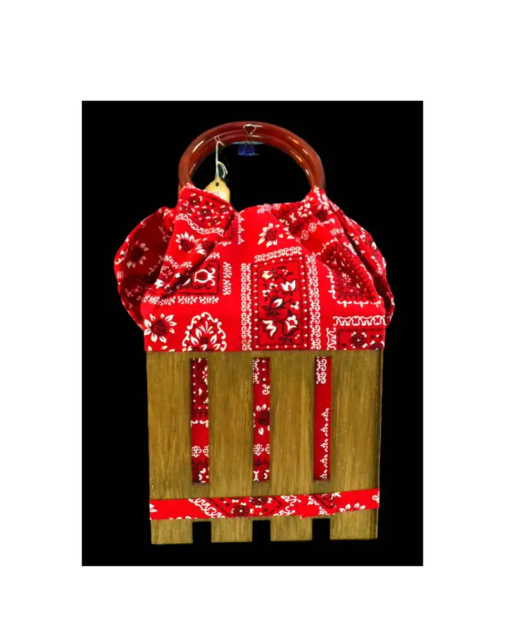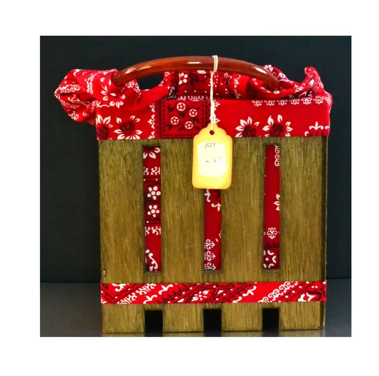 Vintage wood crate and bandana with plastic handles pocketbook or tote bag. Has store tag attached saying Joy 4 97.