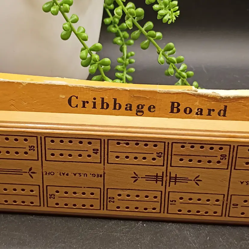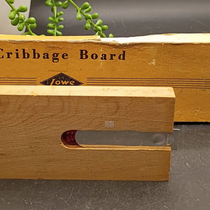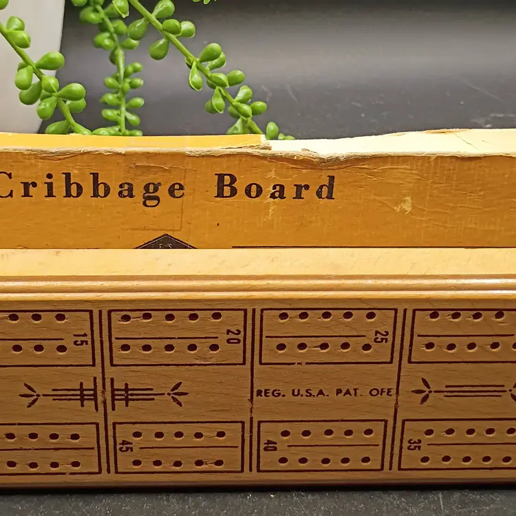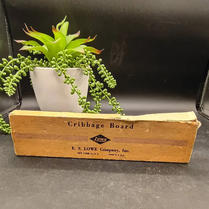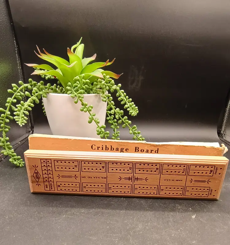This vintage wood cribbage board by ES Lowe Company, made in the USA, is a classic card game with a strategic theme. Designed for 2 players, this set includes original box pegs and is perfect for enjoying a traditional game of cribbage.