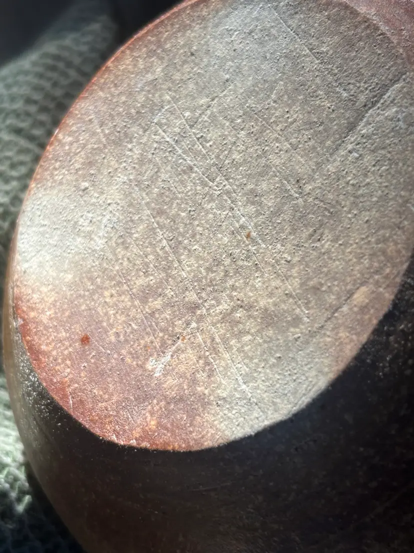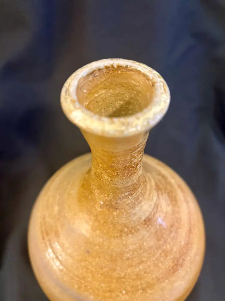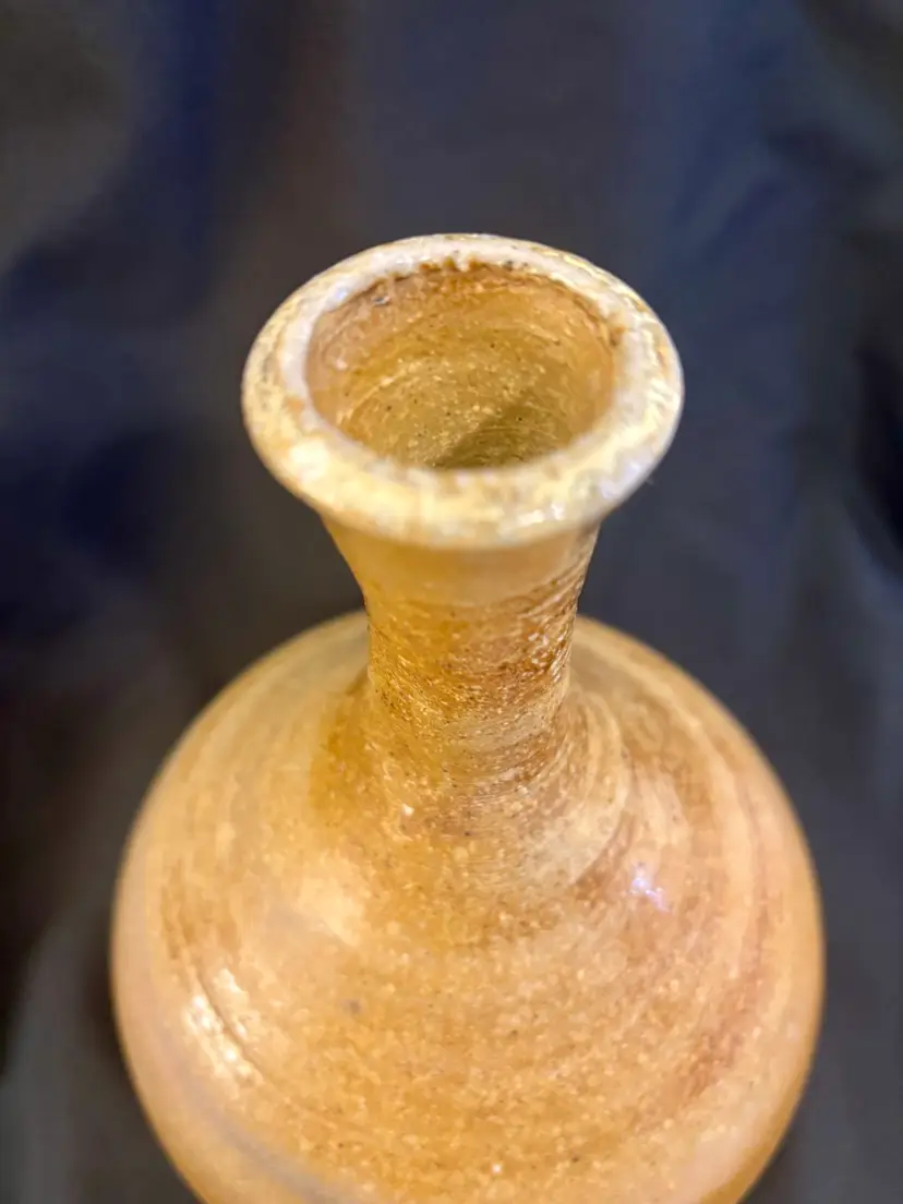 This is a really cool item, it’s a vintage brown wood-fired glazed, 9“ x 5.5“ Japanese sake decanter.