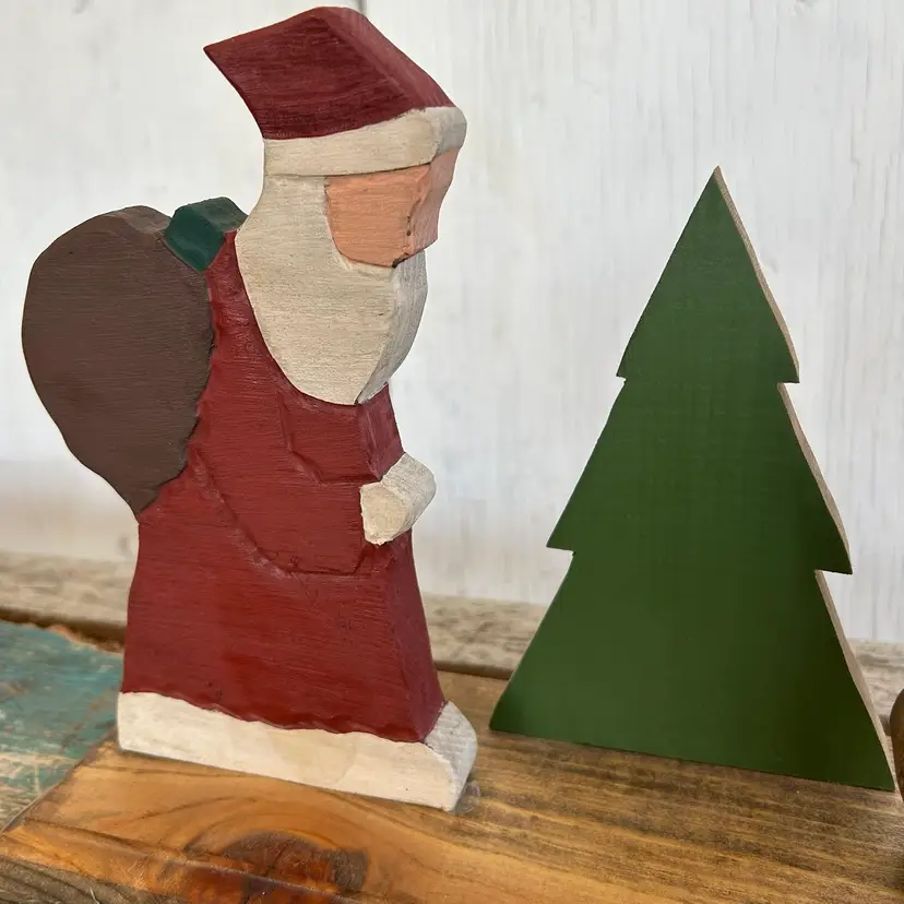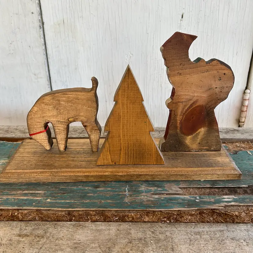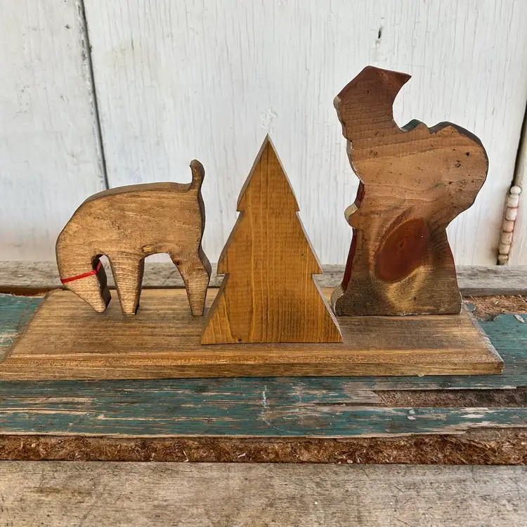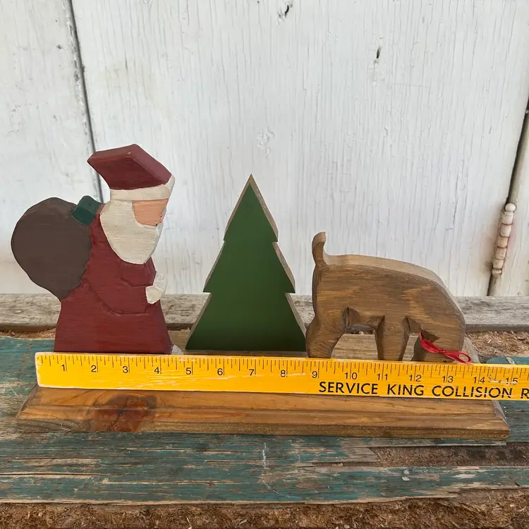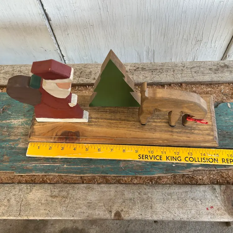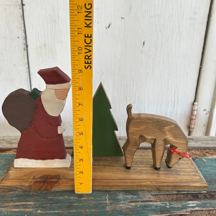 Unmarked, hand carved wood. The reindeer has missing antlers. See photos for details. 15 inches long, 9 inches tall.