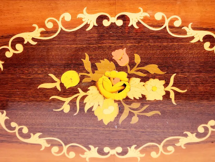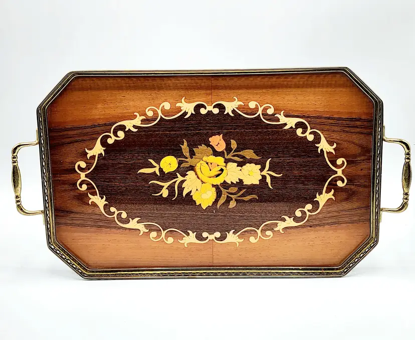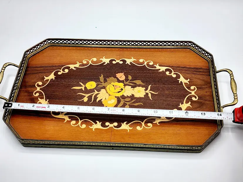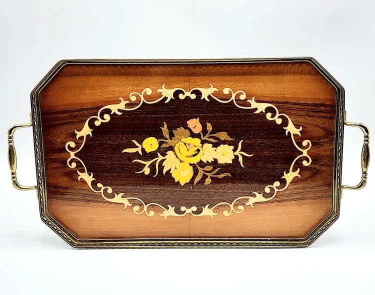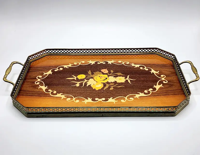 Serving tray - Veneer on wood with inlay flower pattern, brass frame. Unmarked, possibly made in Italy. Condition: very good used condition. One spot with raised veneer, on the back. See photo. Measurement: 14" long x 9" wide.
