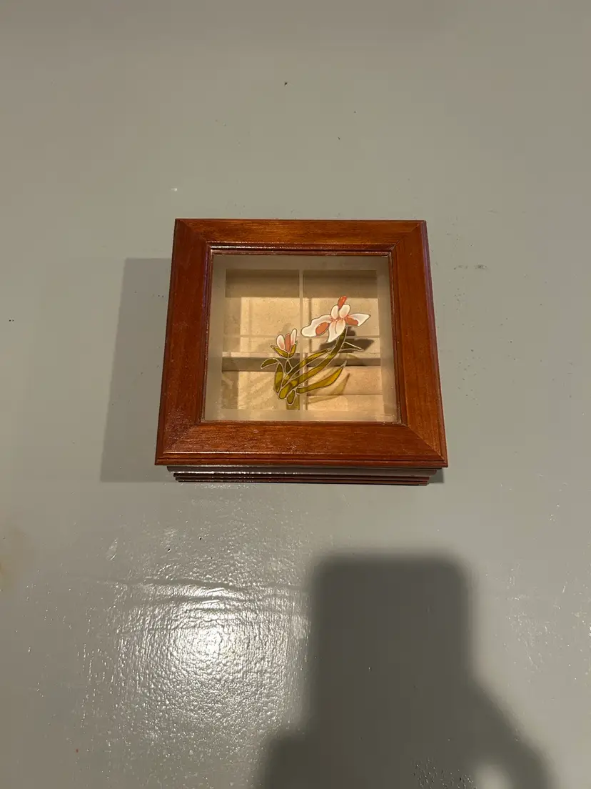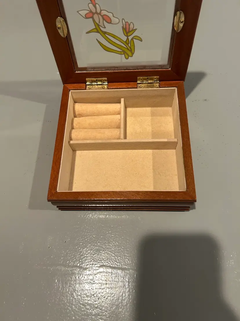 This elegant vintage wooden jewelry organizer features a beautiful floral design, perfect for keeping your accessories neatly stored. The rich brown finish adds a touch of sophistication to any room.