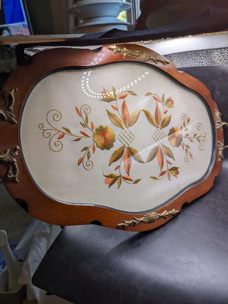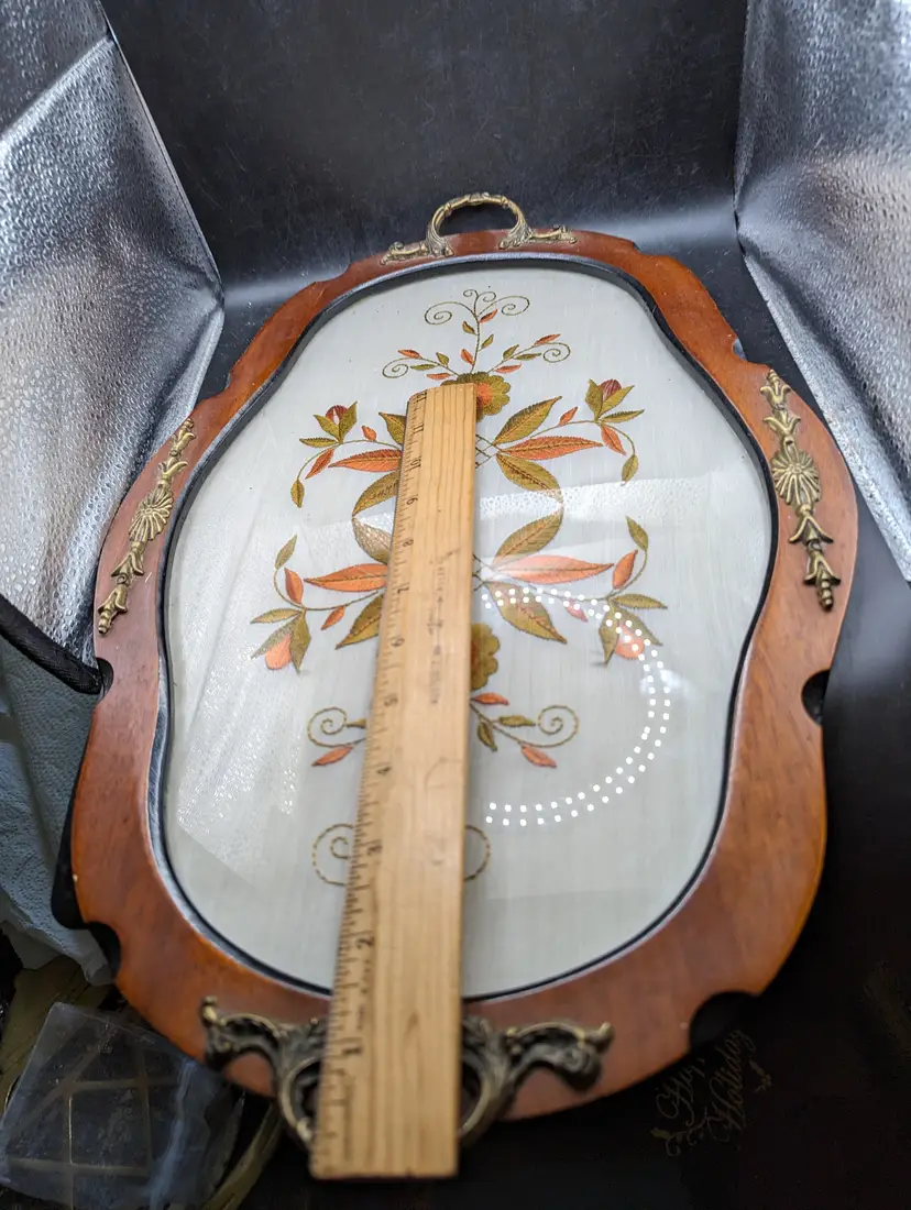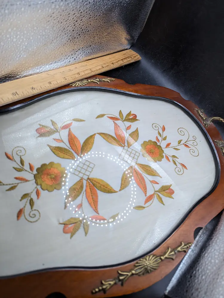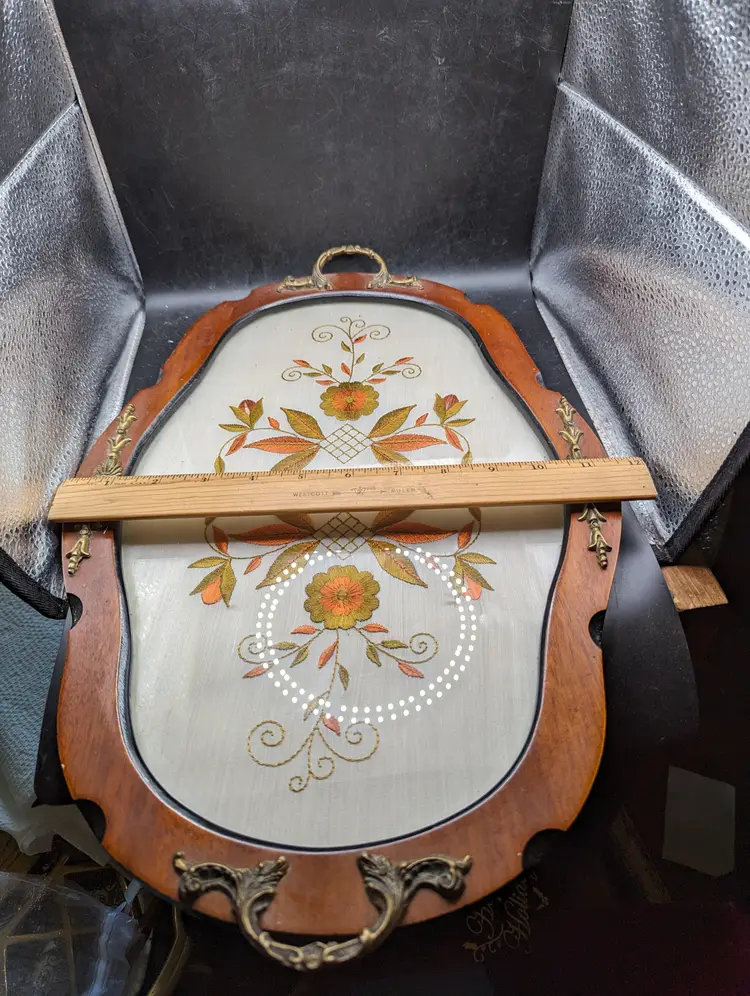 This is a lovely Vintage Wood Orange Gold Flowers Embroidered Linen Brass Handled Vanity Tray 18”x 12”. Please see all pictures for condition and measurements.