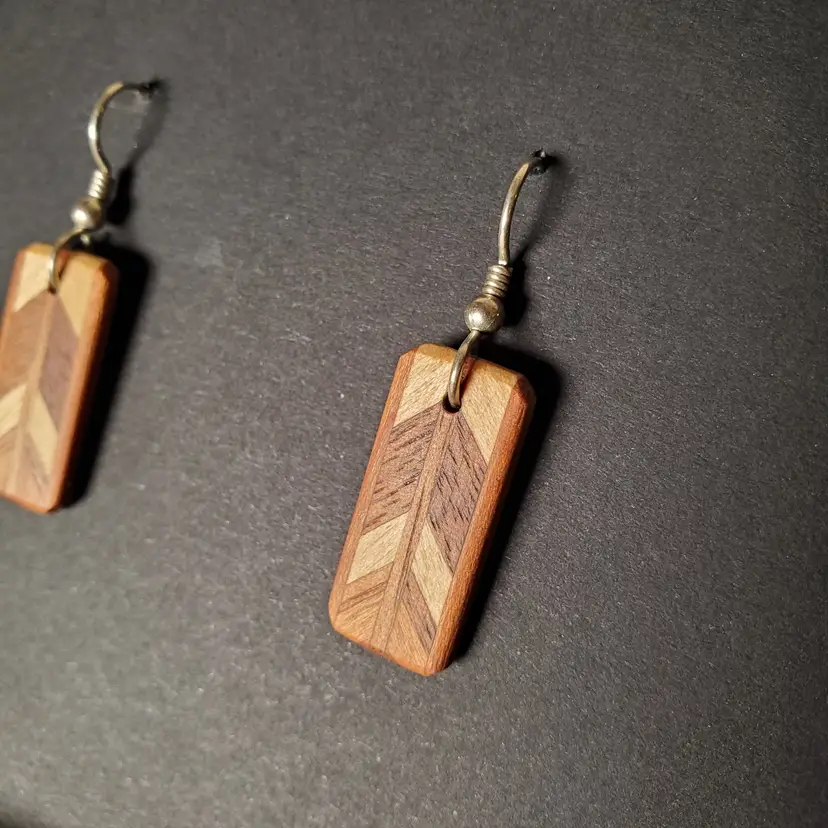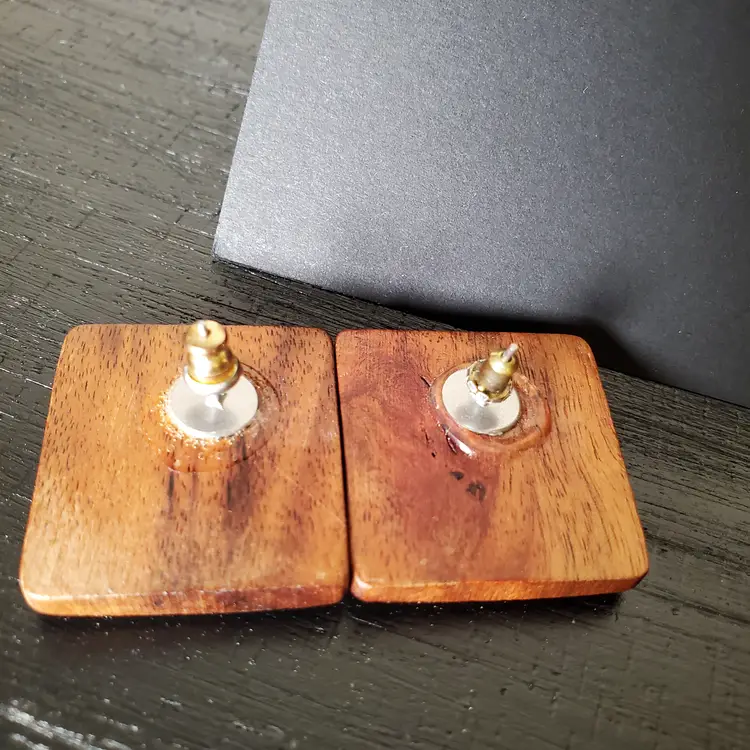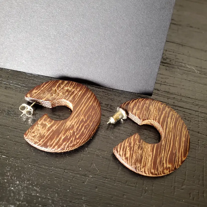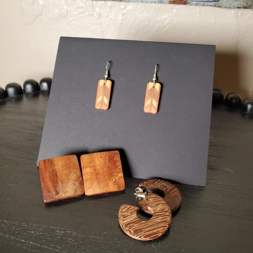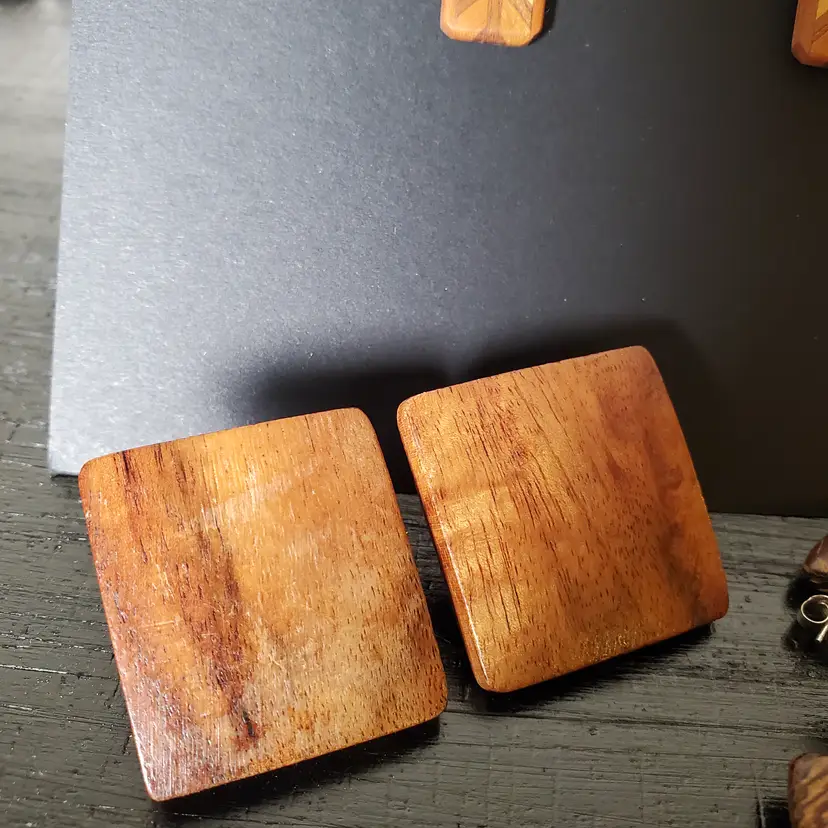 Very cute curation of vintage wood pierced earrings. 7/8" x 3/8' 1" x 1 1/8" 1 1/8"