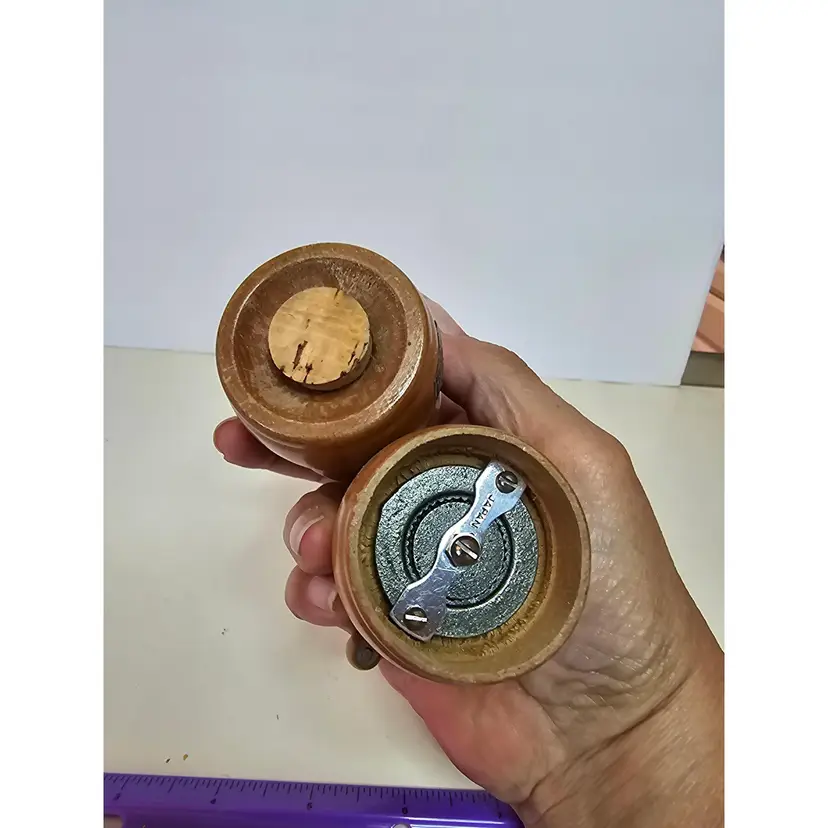 Vintage Shaker set. Pepper is a grinder. Marked Norcrest fine china Japan. Salt is 2.25 inches tall and pepper is just over 3 inches tall.