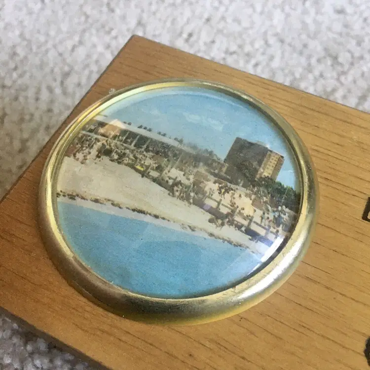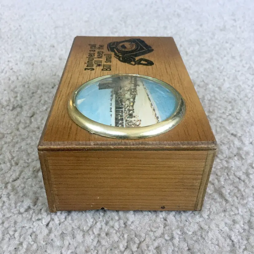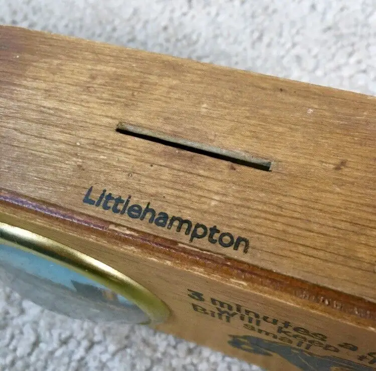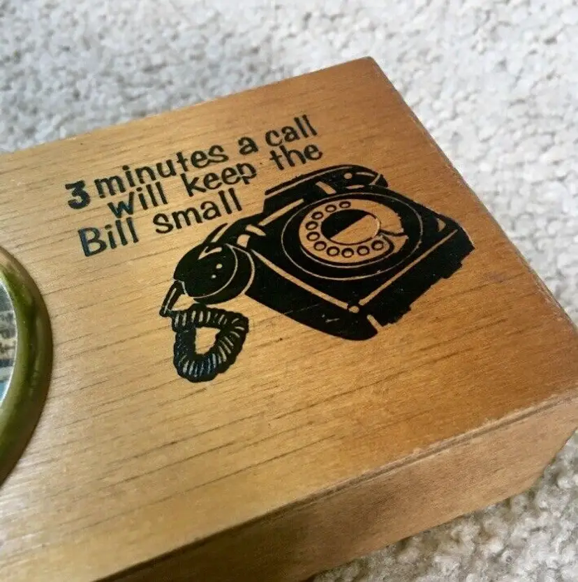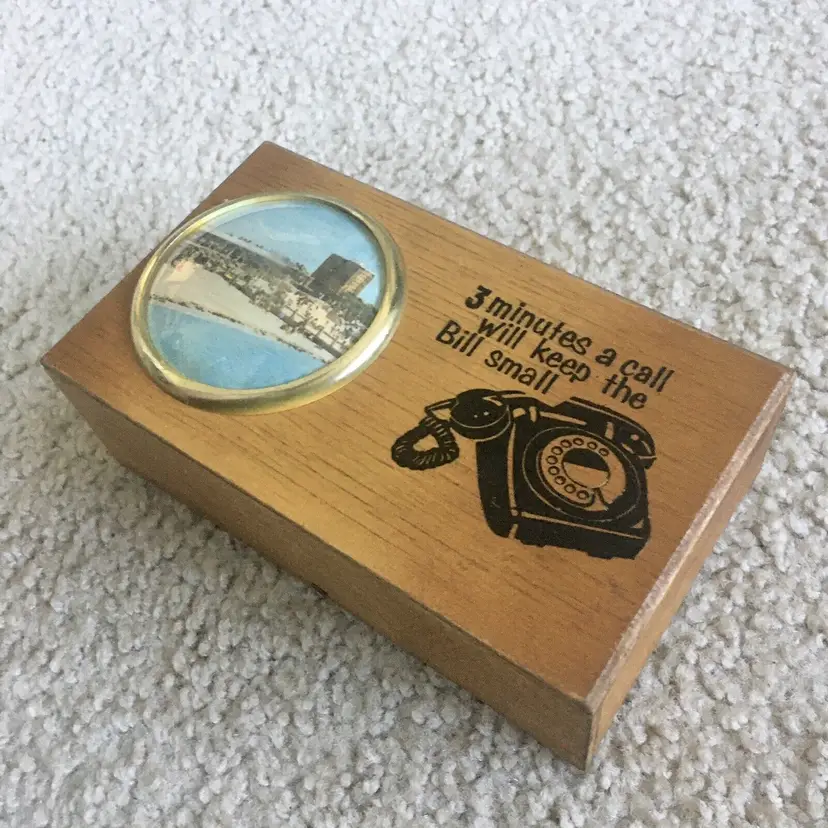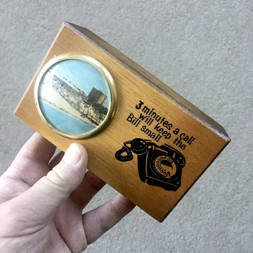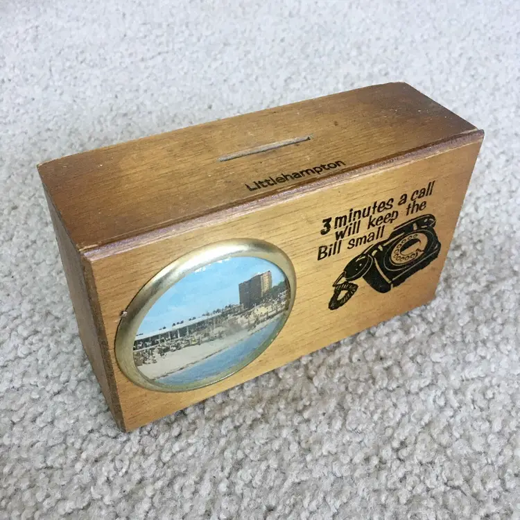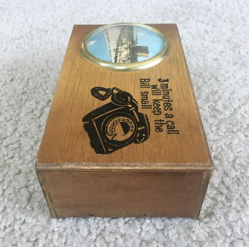 intage wood telephone money box from Littlehampton, England. Features an old style black dial telephone and color pic of a Littlehampton waterfront scene. Littlehampton is a resort town and lies on the shore of the English Channel. Box reads… 3 MINUTES A CALL WILL KEEP THE BILL SMALL. Very good overall condition. Displays Beautifully!! Small wood chip along back edge as shown. Measures about 5 3/4” x 3 3/8”. See pics for more details.