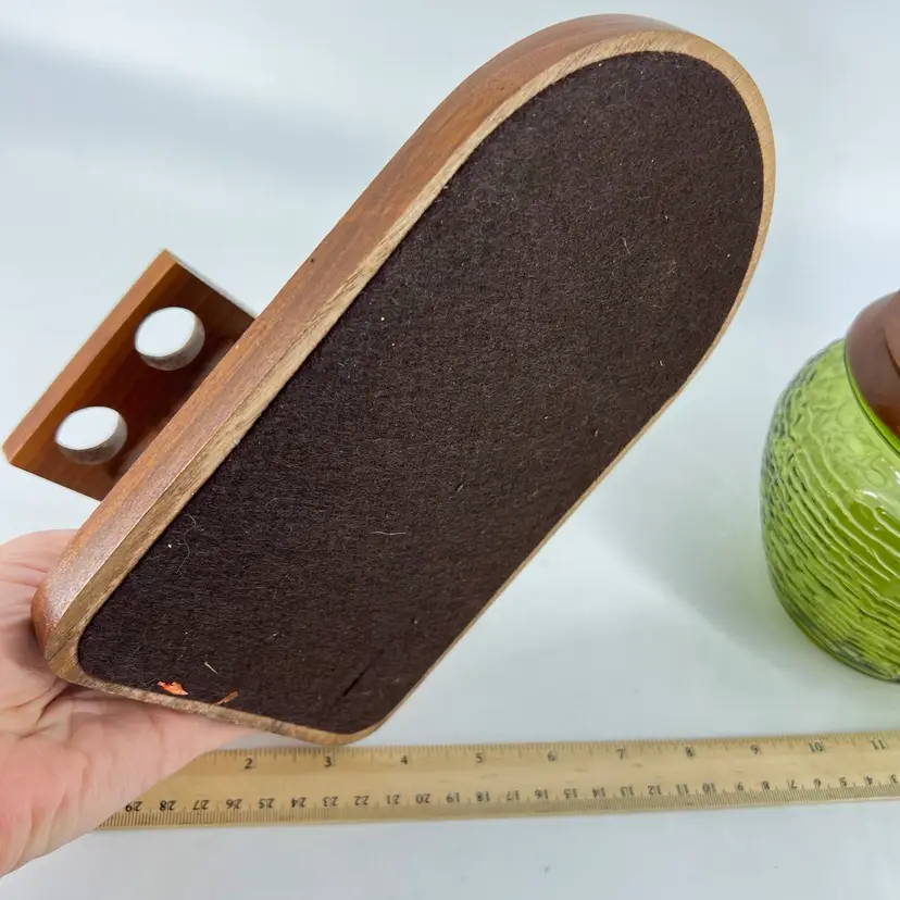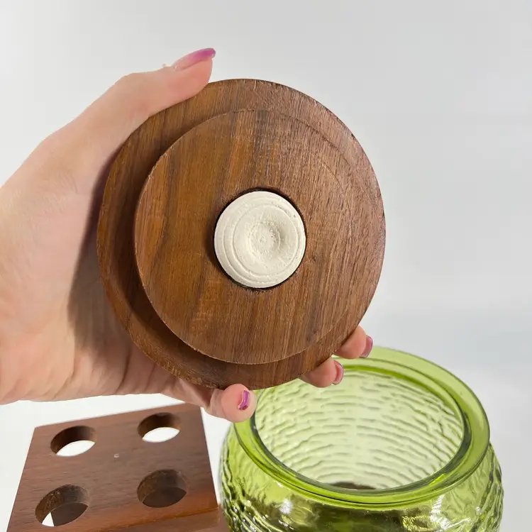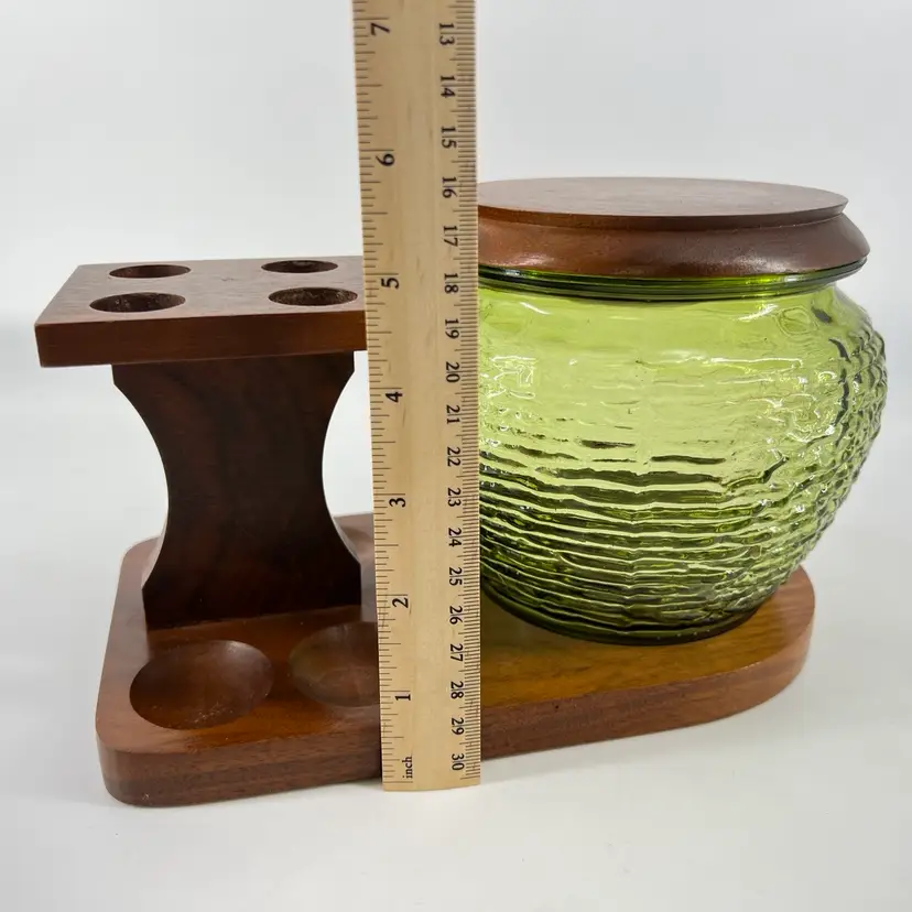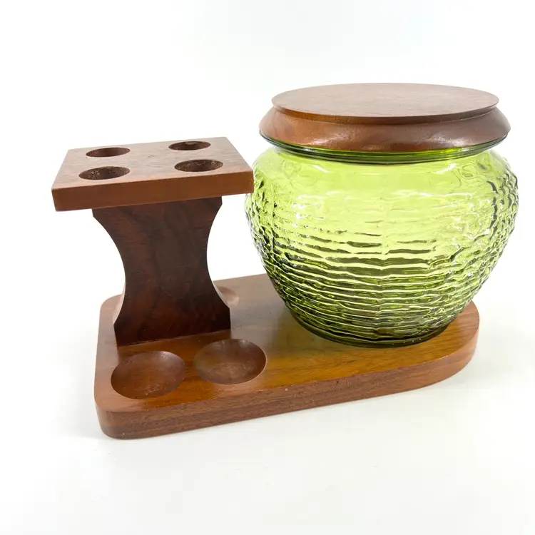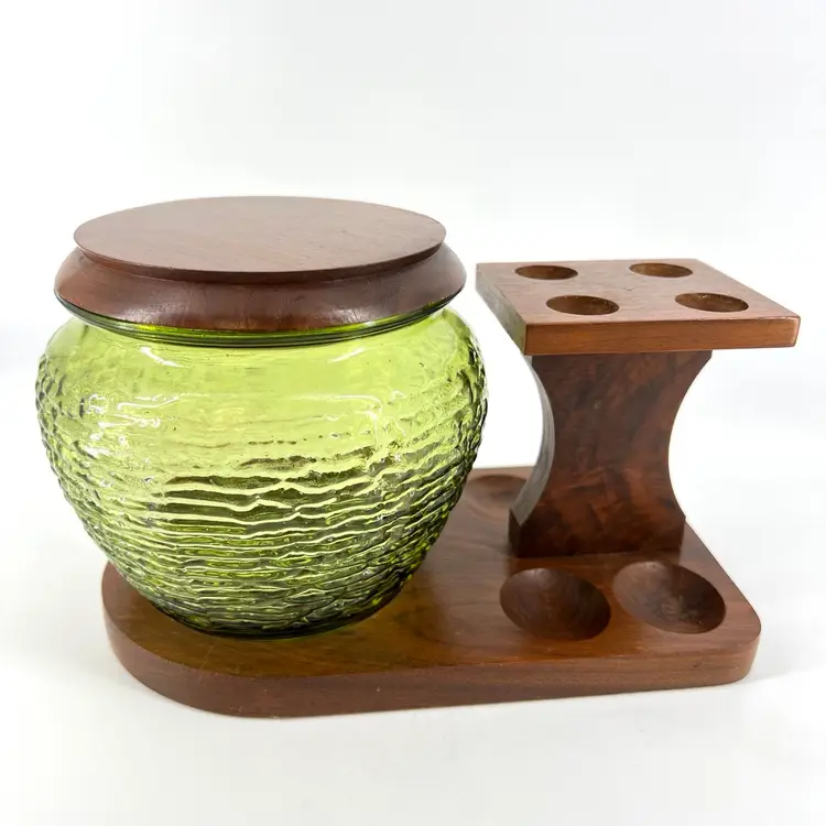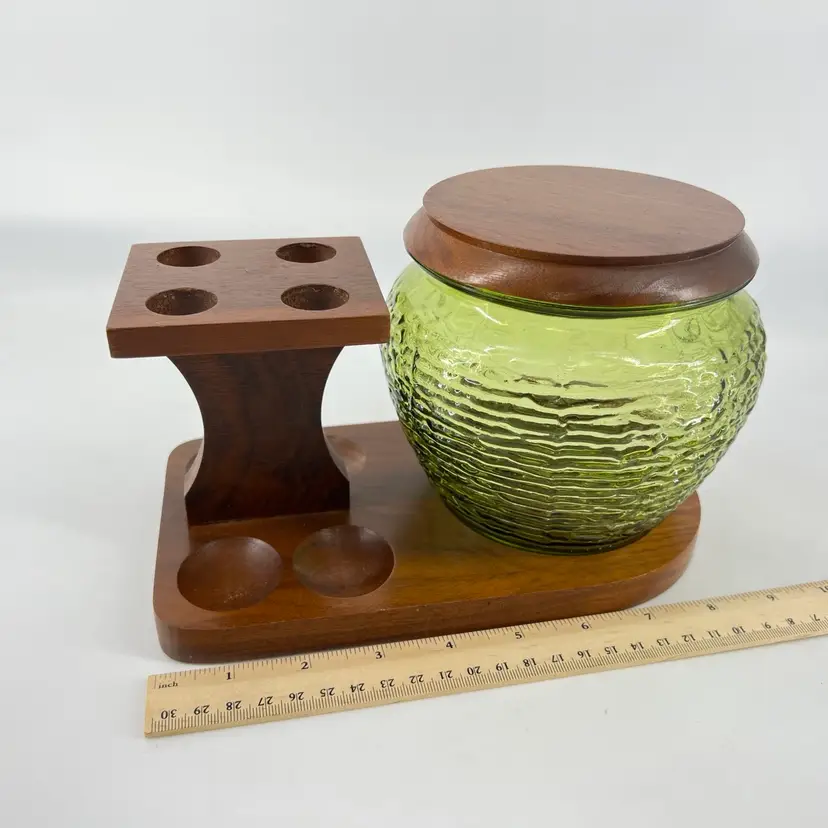 This listing includes a green glass humidor and wooden holder. The holder accommodates four pipes. The wood piece is slightly loose and does pivot. It measures approx 5.5” tall and 9” wide.