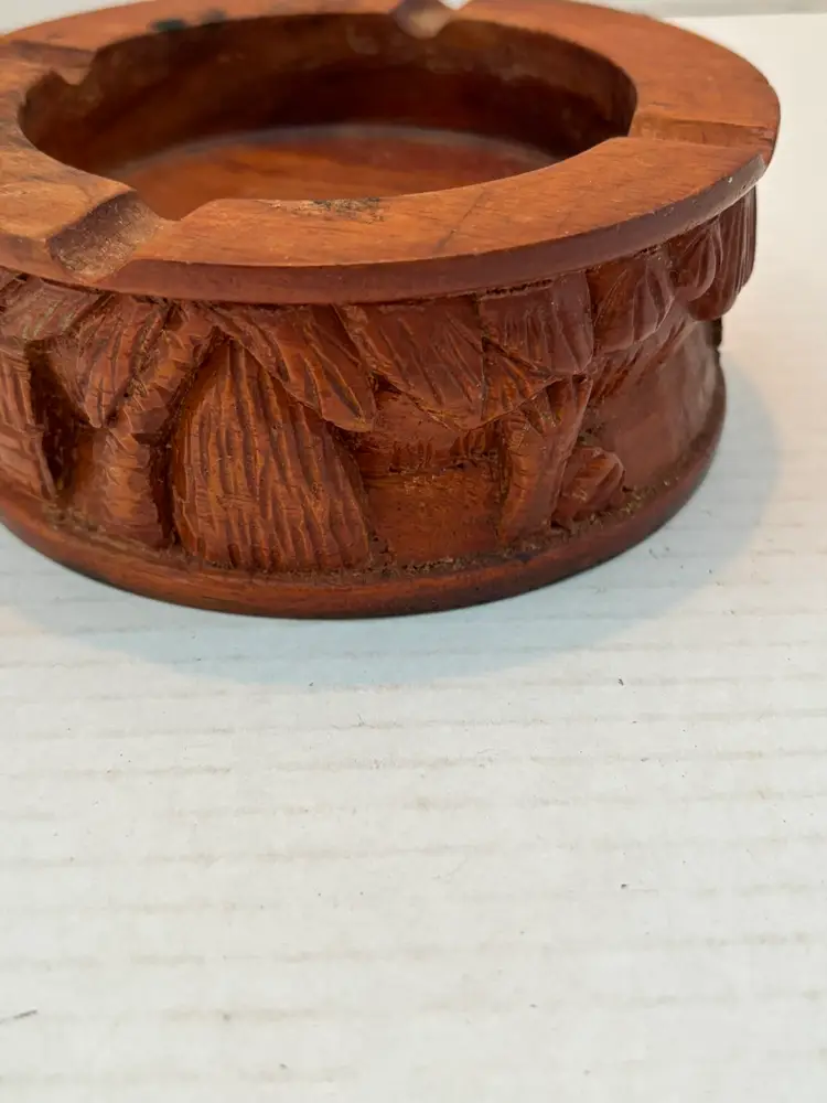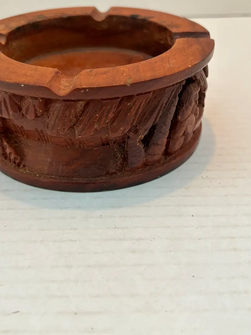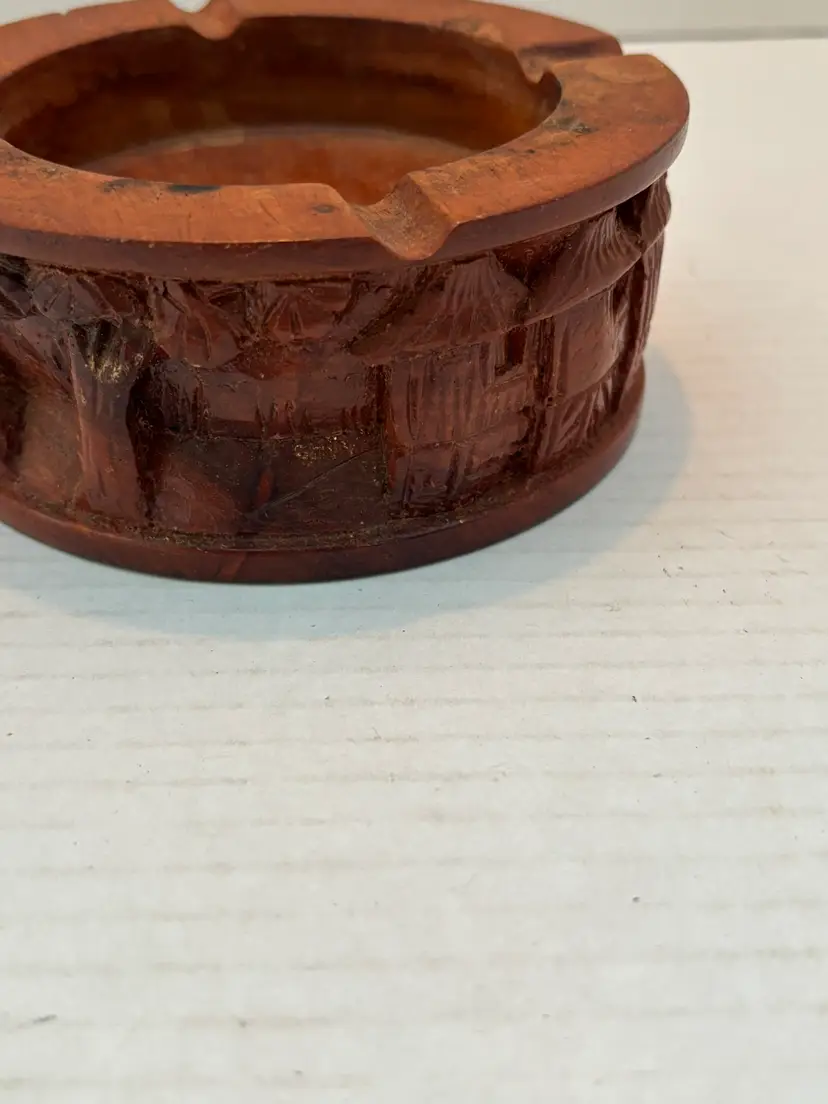 Crafted with meticulous attention to detail, this vintage wooden ashtray is a testament to the artistry of its era. The piece features intricate hand-carved designs depicting village life in relief on its sides, with a dark wood finish that exudes a timeless charm. Its origins are shrouded in mystery, adding an air of intrigue, but its quality and craftsmanship speak volumes of its value as a collectible. This ashtray is not just a functional item but a conversation piece that captures the essence of traditional craftsmanship.