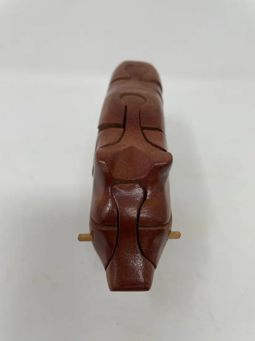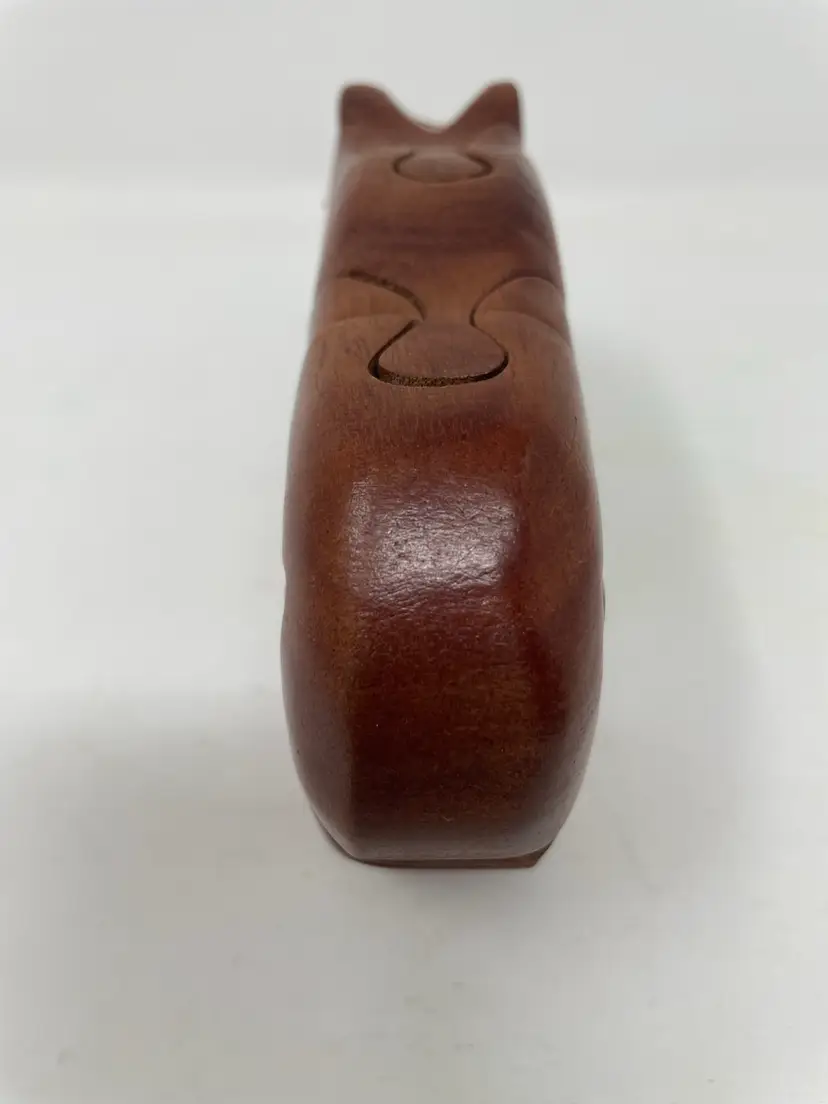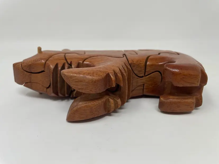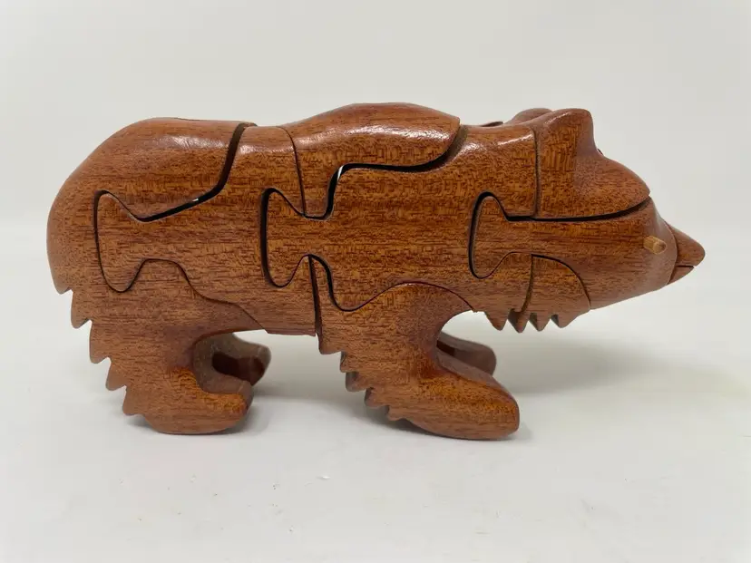 This bear puzzle is handcrafted and nicely done! Pieces are pretty snug so gently owned and beautifully finished! The bear has nicely round curves with a warm brown stain. No hidden treasure nor is it signed but very much like the Peter Chapman style!