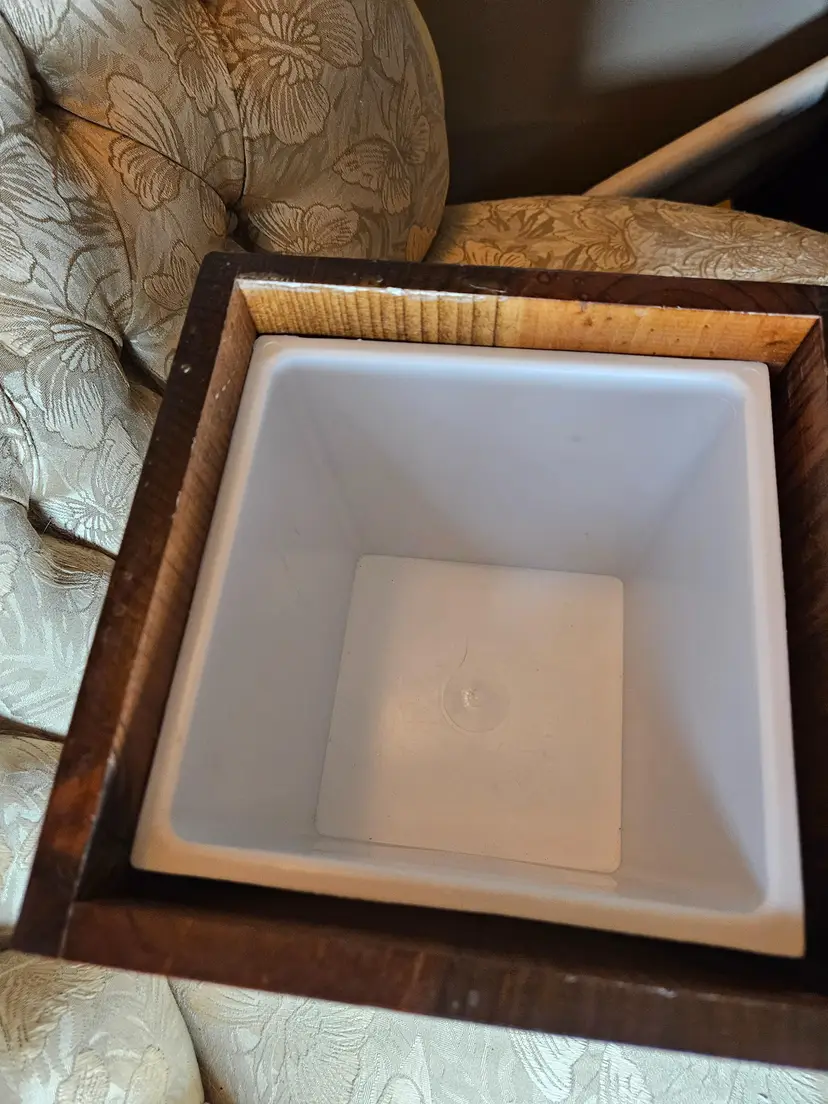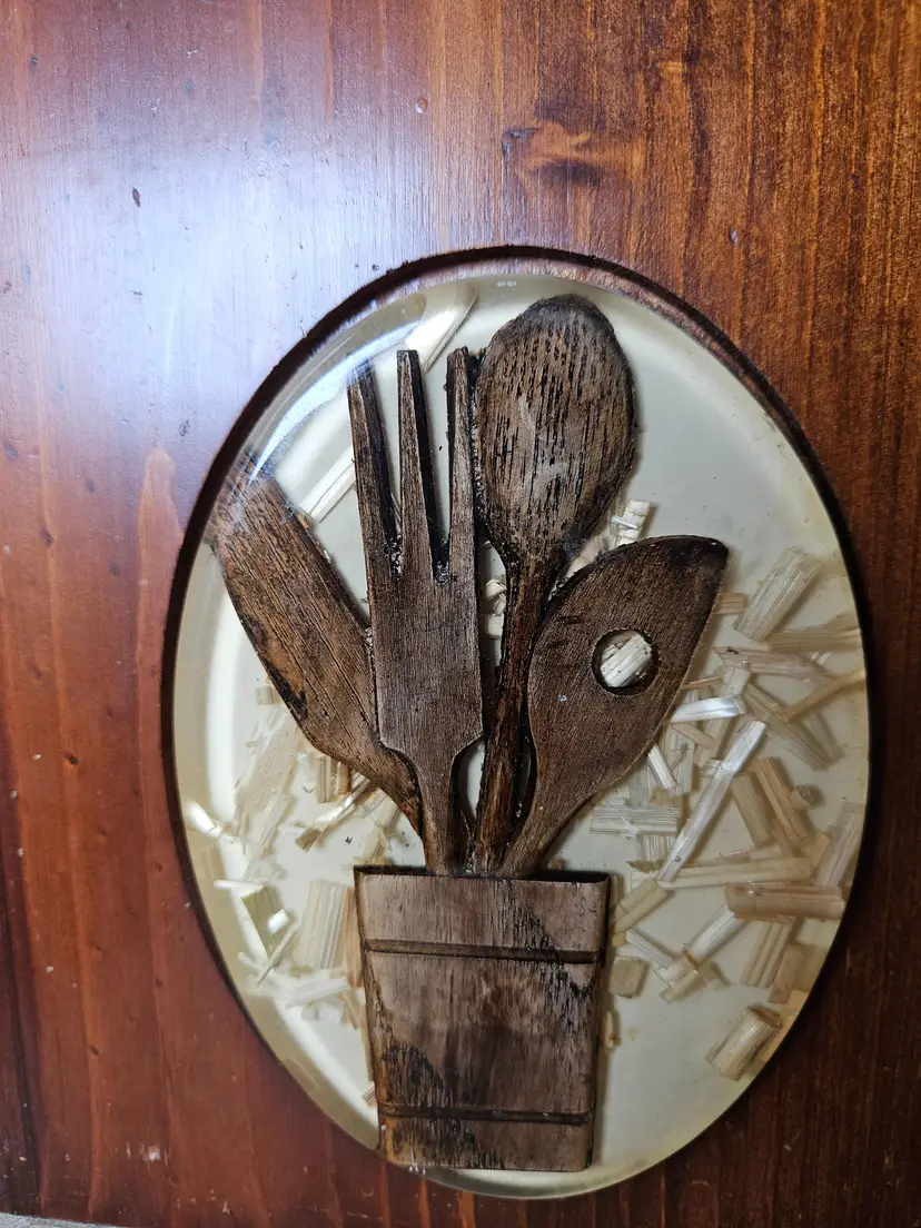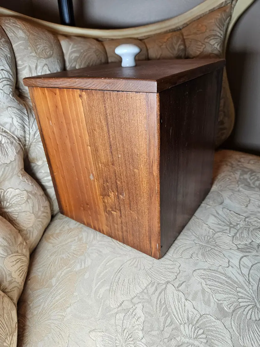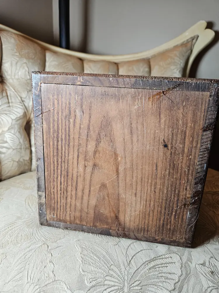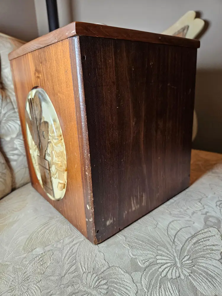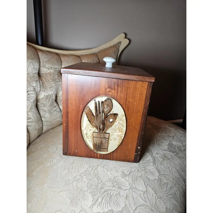 Charming wooden bread box featuring a quaint farmhouse kitchen scene. Perfect for adding a rustic touch to your kitchen. Gently used with a warm patina.