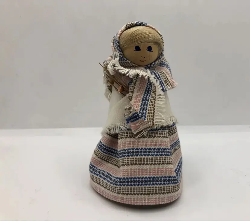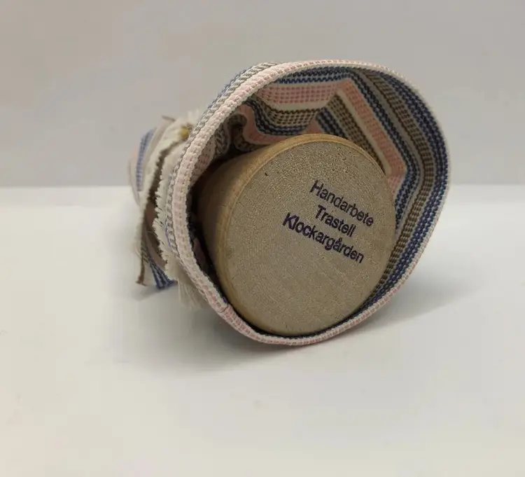 Vintage Wooden Doll Hand Made In Sweden, Handarbete Trasrell Klockargarden 4”. Year made us unknown. It is stamped on bottom. See photos. Collectible mini wood doll.