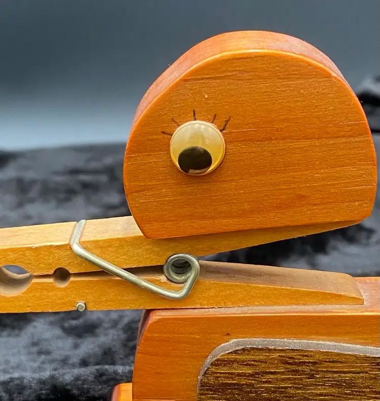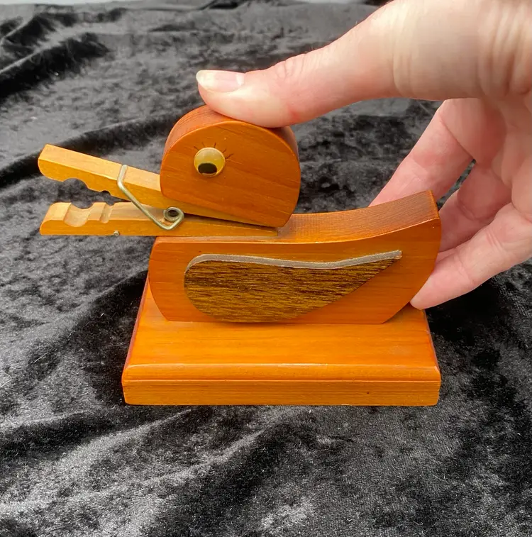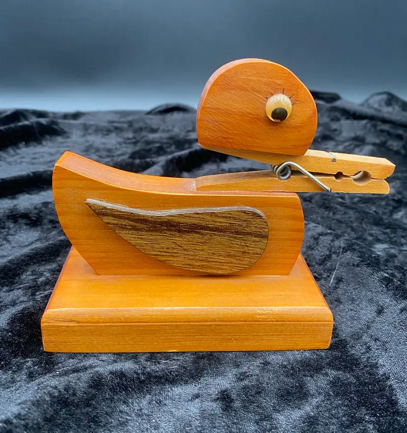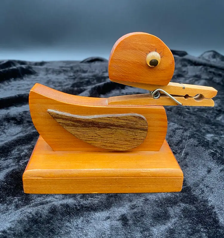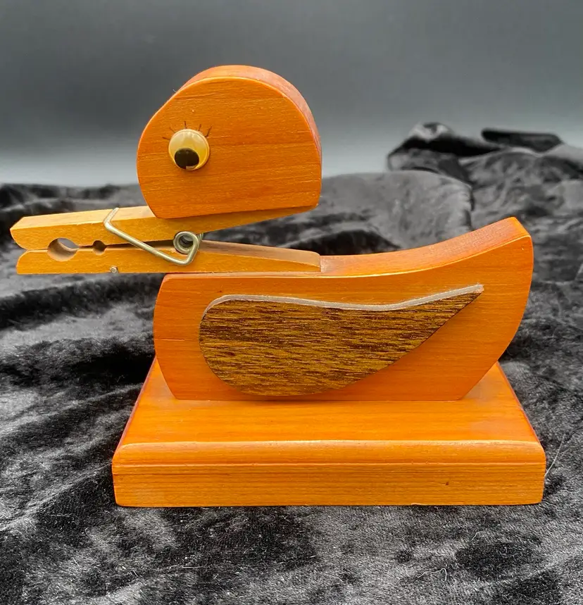 Add a touch of whimsy to your home with this vintage Wooden Clothespin Duck Holder. Perfect for holding letters, notecards, and recipes, this delightful piece features a farmhouse style that is sure to delight. Measuring at 5.75 inches in length, 4.4 inches in height, and 2.7 inches in width, this holder is just the right size for your kitchen or entryway. Crafted from polished wood with googly eyes and cute black eyelashes, this free-standing letter holder is a charming addition to any home decor.