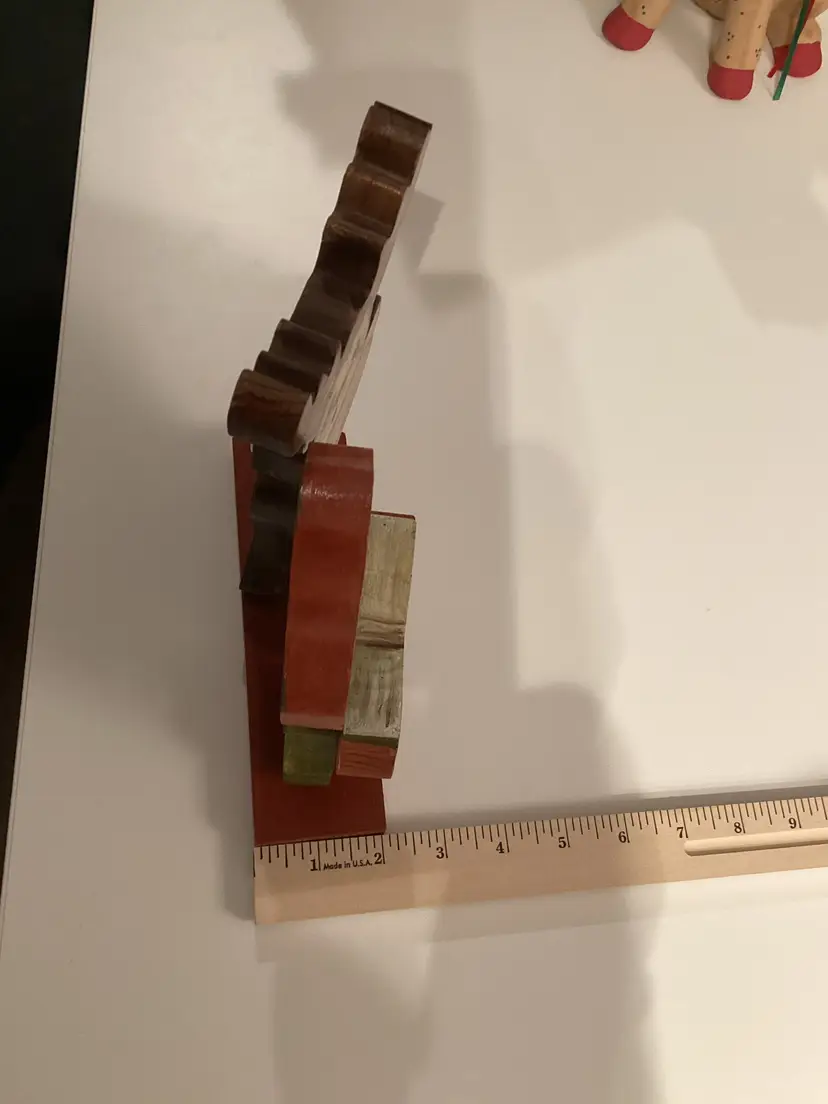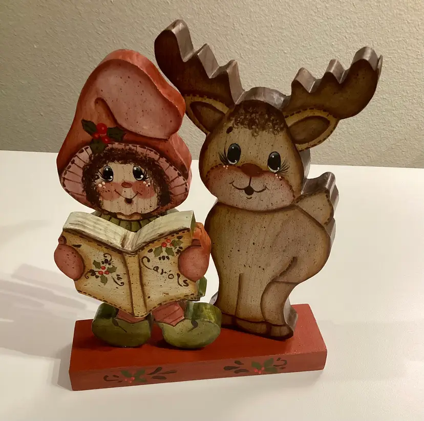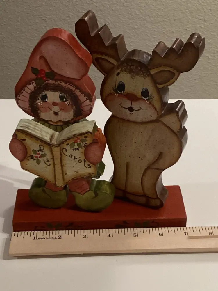 This vintage wooden hand-painted Christmas figurine in the shape of a reindeer and folk art caroller is a charming collectible from 1991. The asymmetrical figure features a traditional Christmas theme and is adorned with multicolor paint, making it a unique addition to any holiday decor collection. Handmade in the United States, this original reideer collection piece showcases intricate details and a festive design that captures the spirit of Christmas in a creative and nostalgic way. Perfect for adults looking to add a touch of seasonal artistry to their home during the holiday season.
