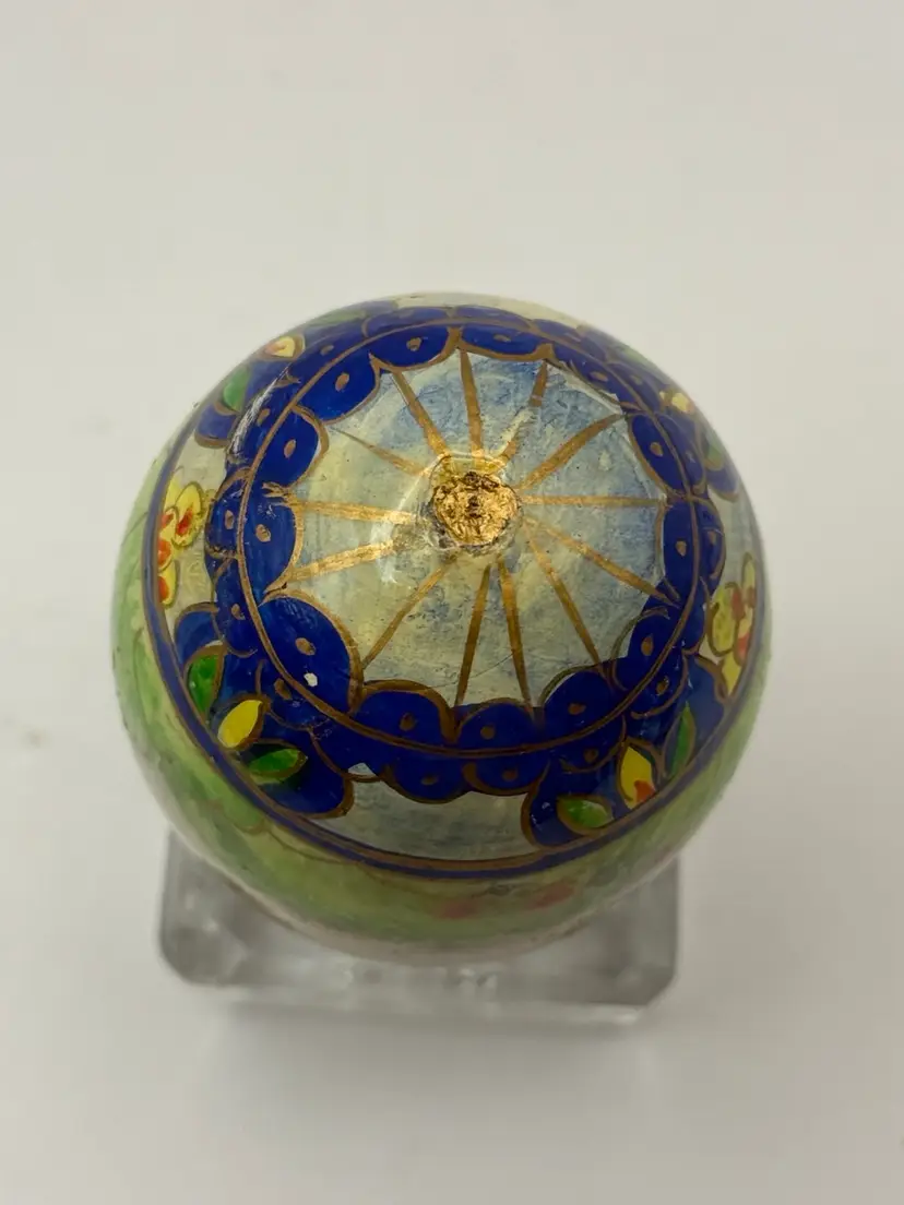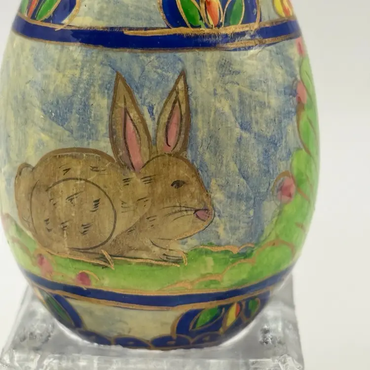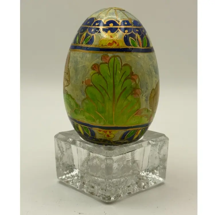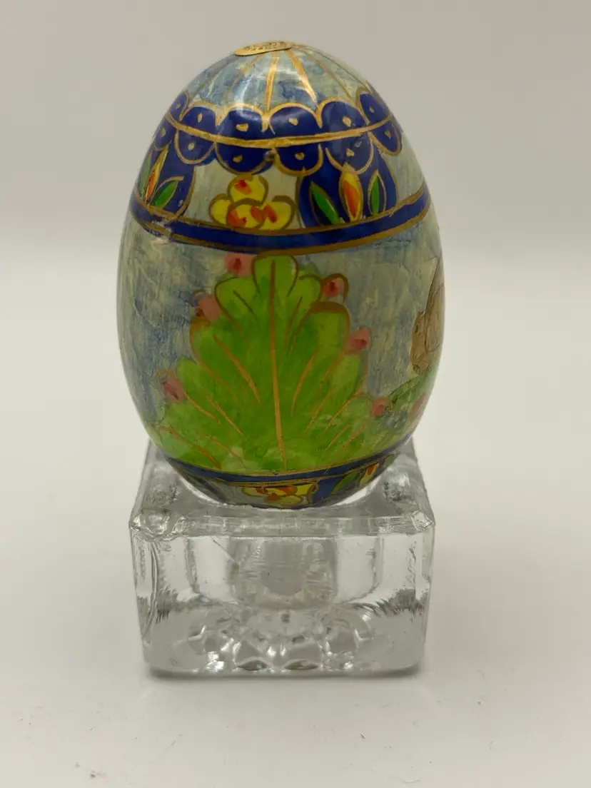 Hand painted Easter egg with original Foreside Company's sticker on bottom. Made in USA. Very nice detailing of bunny rabbit and floral decor with a cloisonné design. Measures approximately 2 1/2 inches long and 2 inches wide. In excellent condition. Does not come with stand.