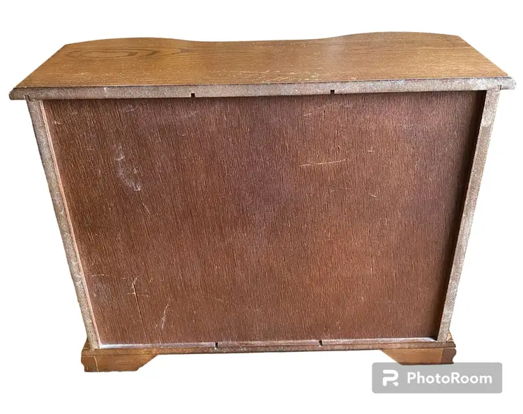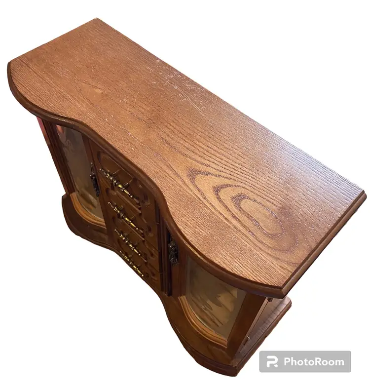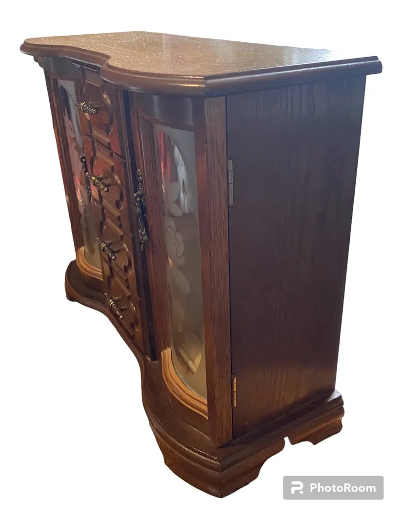Very nice vintage wooden jewelry box dresser display case, in great condition. It features 2 glass doors and 4 drawers to store your items. It has pretty frosted roses etched on the doors, interior has mirrors and little places to hang or organize necklaces and rings. The felt material on inside is pretty clean with no apparent stains. It has normal signs of wear from usage, a few signs of usage/ light scratches on the top but overall really nice condition. I believe this is from the early-mid 90s most likely. Very cool piece for anyone wanting a vintage item to display all of their jewelry items. Thanks!