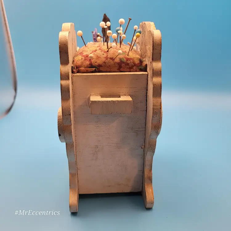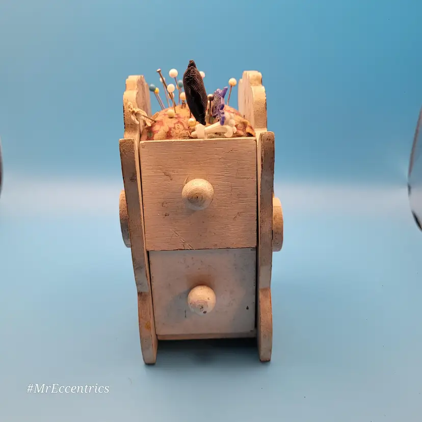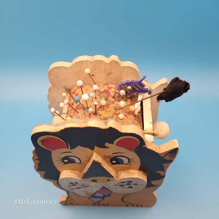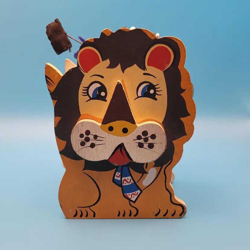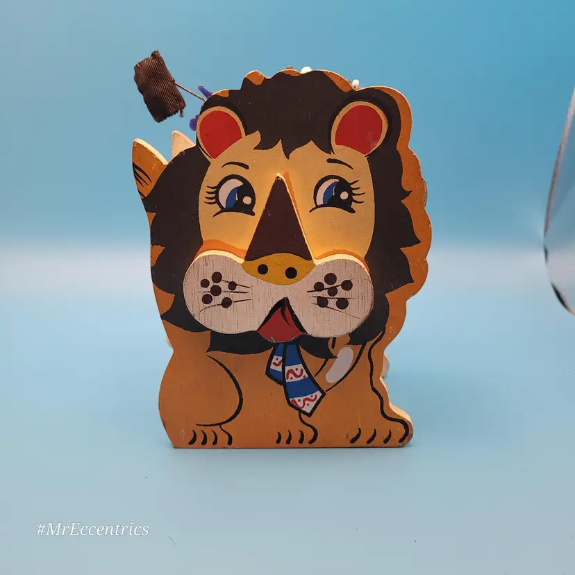 Adorable vintage wooden lion sewing caddy featuring a playful design with a cute bow tie. Has 2 small drawers and scissor holder Perfect for adding a touch of whimsy to your decor or as a charming gift. Shows some signs of wear, adding to its nostalgic appeal. 💝 All items are packaged with care to ensure safe delivery. #nosadmail ✴️ Follow my Facebook page & IG for more curated vintage treasures! ⚡️ #MrEccentrics #vintagecurator #vintagedecor