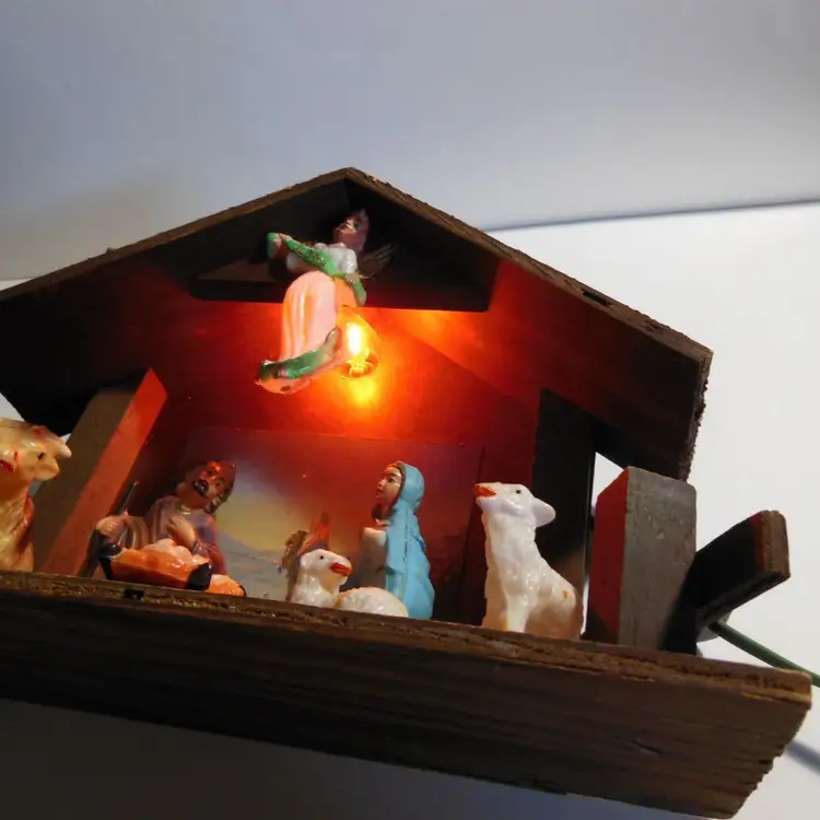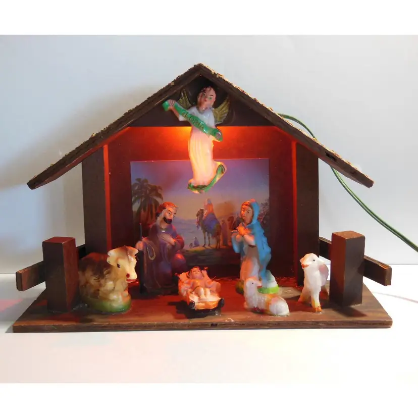 This is a Wonderful Vintage Wooden & Plastic Light Up Nativity. IT WORKS! The figures are all glued down and there is a scenic background of Bethlehem. It measures: 11.75" long 8.5" high. It is in great condition. You may wish to rewire it for safety if you intend to use it lit. Please see all pics, as they are part of the description. #Vintage #Nativity #Jesus #Manger #Christmas