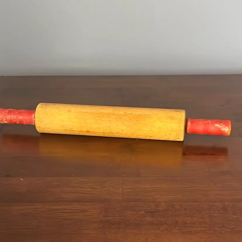 This particular rolling pin, with its painted red handles, suggests a common household item from the mid-20th century. While not a rare antique, such pieces are often sought after for their rustic charm and functionality in farmhouse or vintage-themed kitchens. Their enduring simplicity makes them a testament to practical design that has stood the test of time.