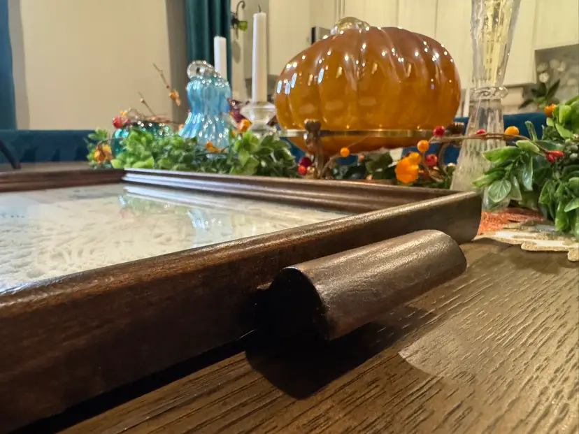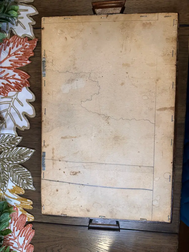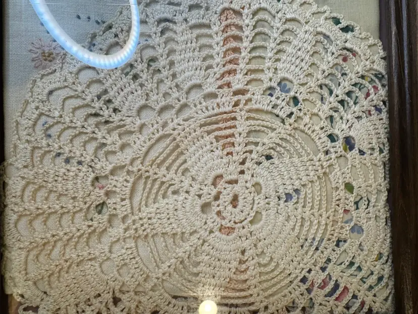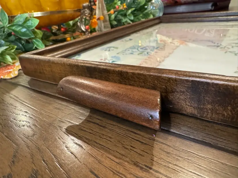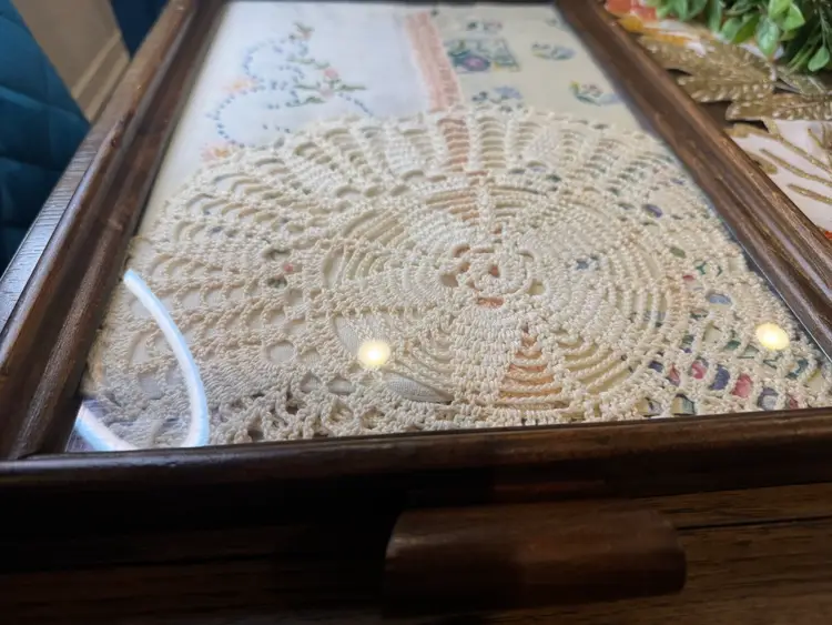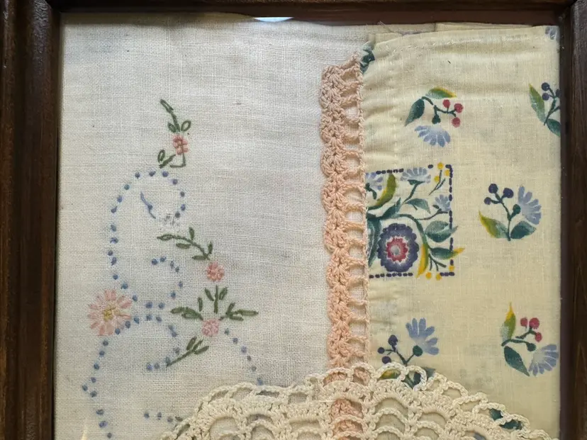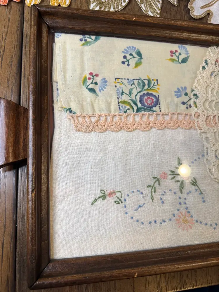 Someone’s grandma/mom made this beautiful piece. Vintage wooden serving tray with various vintage linens, including a crocheted doily and embroidered fabric pieces, displayed under a glass cover. This style of display is often used to preserve and showcase vintage textiles. The items appear to be a collection of handkerchief, doily, and other small embroidered piece. They added two hangers in the back so you can hang. This is one of a kind and so beautiful. Wish I knew the story behind the tray and everything displayed in it. Wall art!