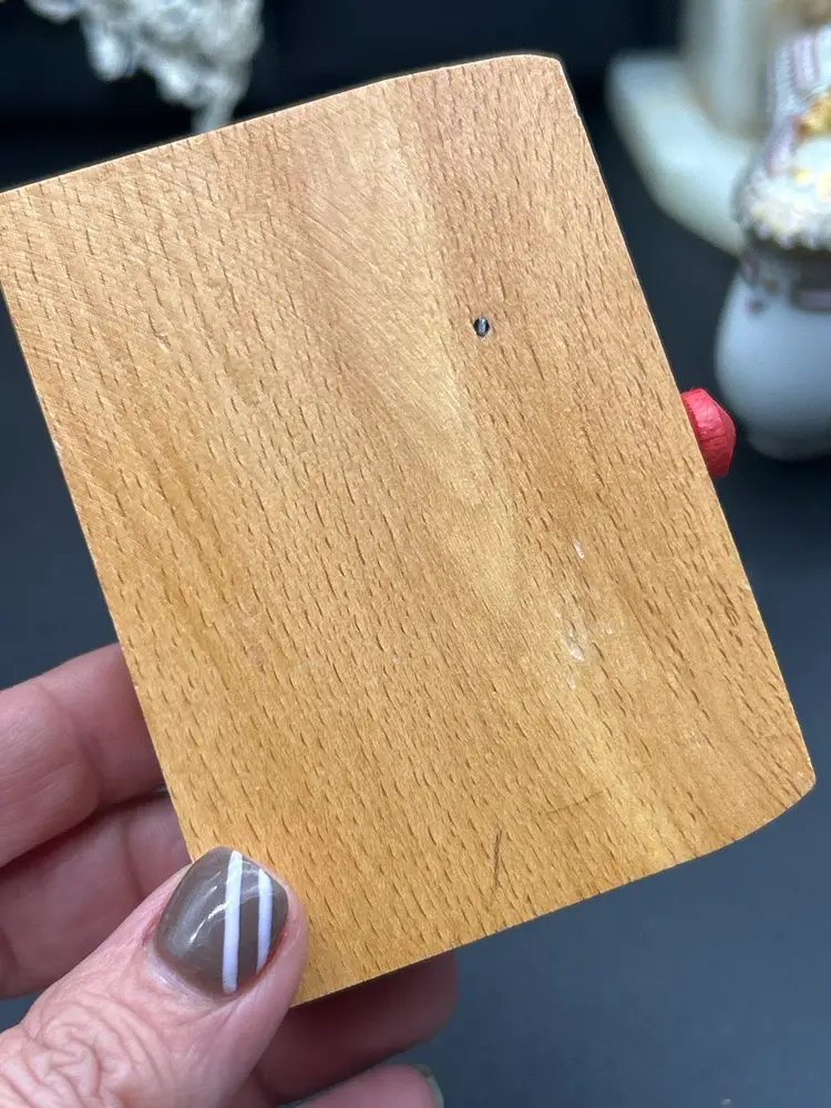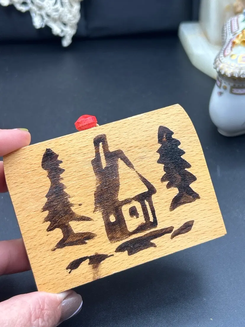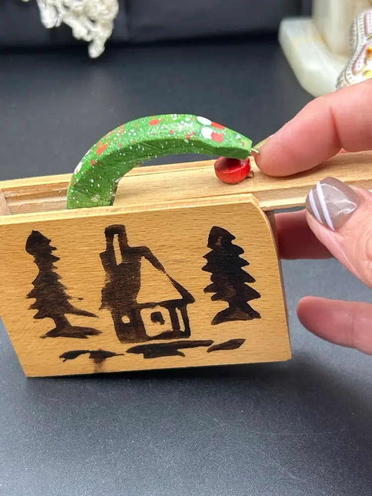 Notable Details: • Hand-carved wooden box with burned chalet & tree design • Hidden spring-loaded snake inside, hand painted in green with red/white details • Red wooden knob opener • Dimensions: approx. 3.25” long • Likely mid-20th century, European origin • Great working condition, ready to surprise!