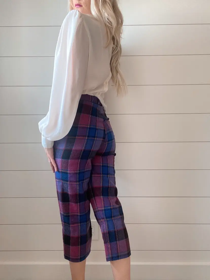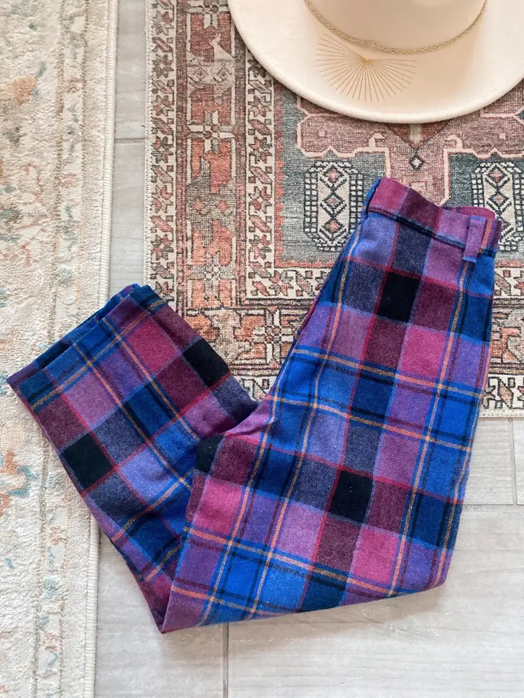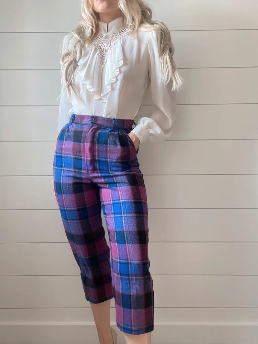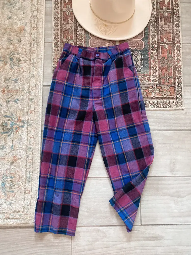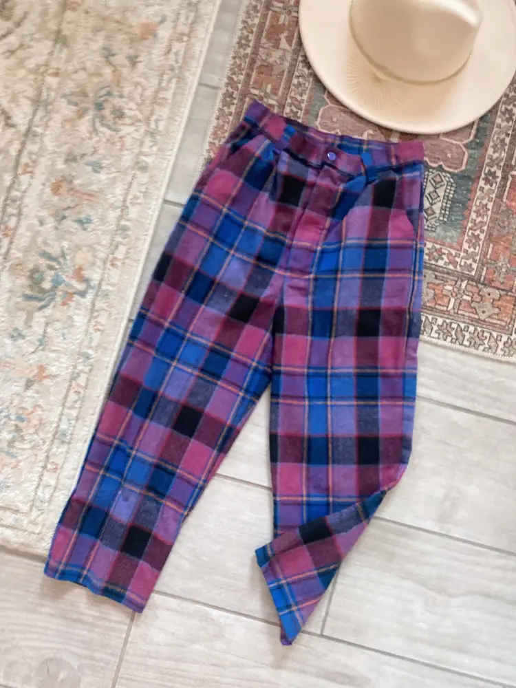 Super cute slim fitting cropped wool pants. These ones are unlined and are a high rise style. They have petite front pockets and notches for a belt. They have an alternation around the knee where stitching was added to gather the fabric~ unsure if this was done for the pants as is or if they were going to be further cropped at some point.