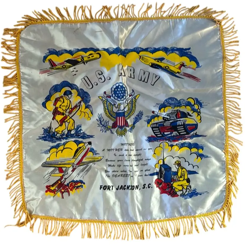 Vintage World War II WWII Satin Fringed Pillow Case Army Fort Jackson, S.C. Mother