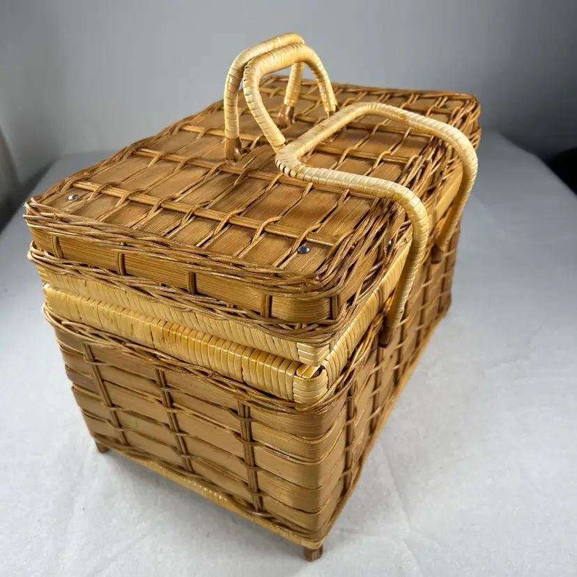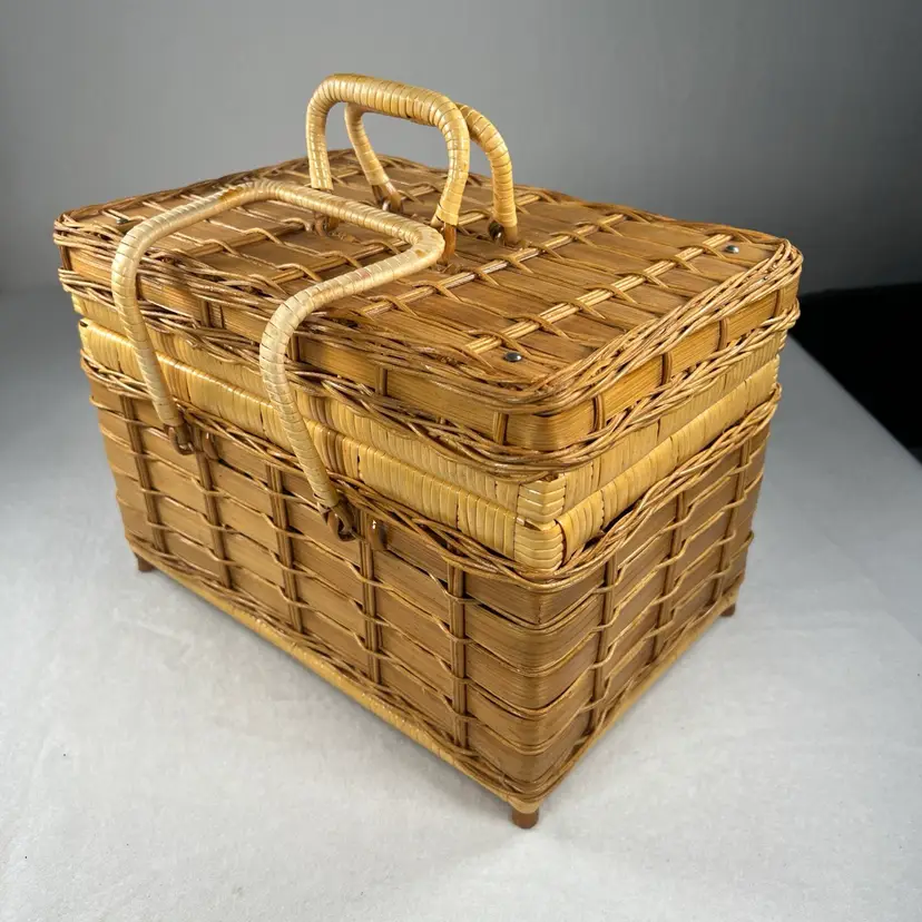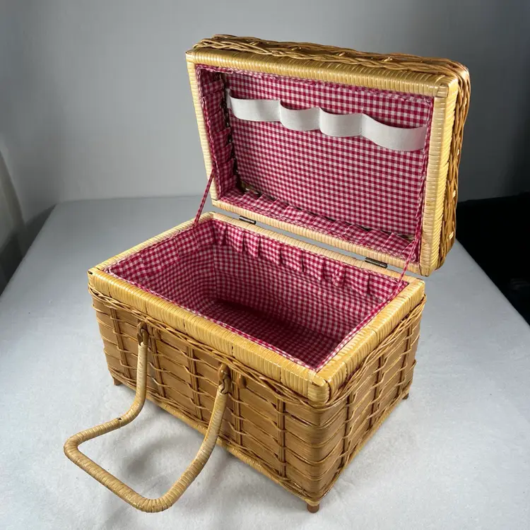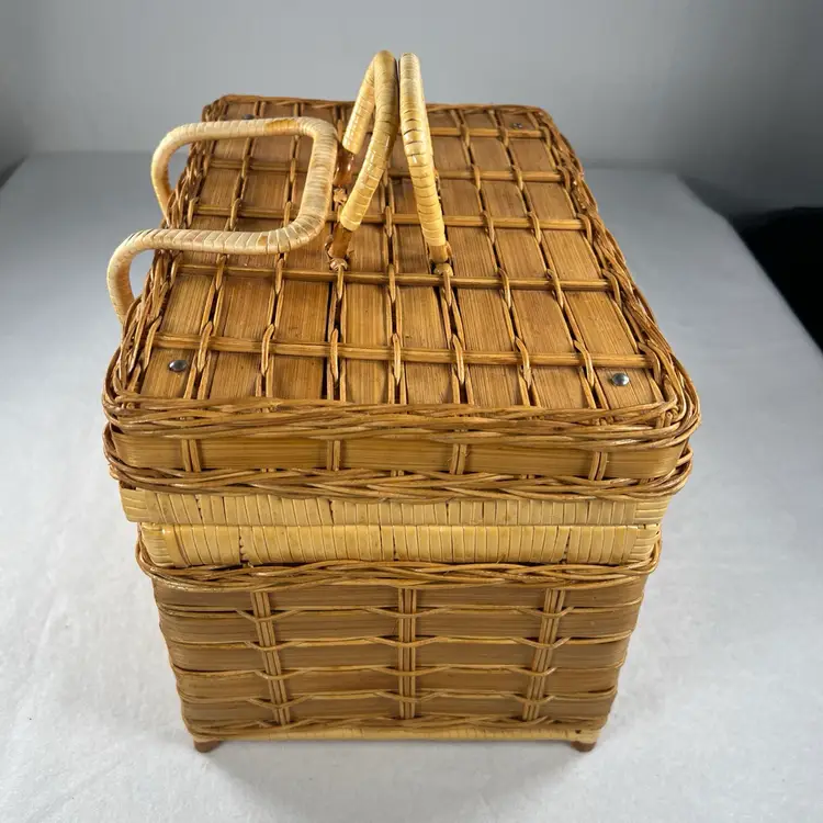 This vintage picnic basket is perfect for any occasion, whether it's a family outing or a romantic date. It's made of durable bamboo material and features a woven pattern with a stained finish. The basket is lined and has dual handles for easy carrying.