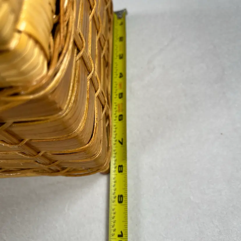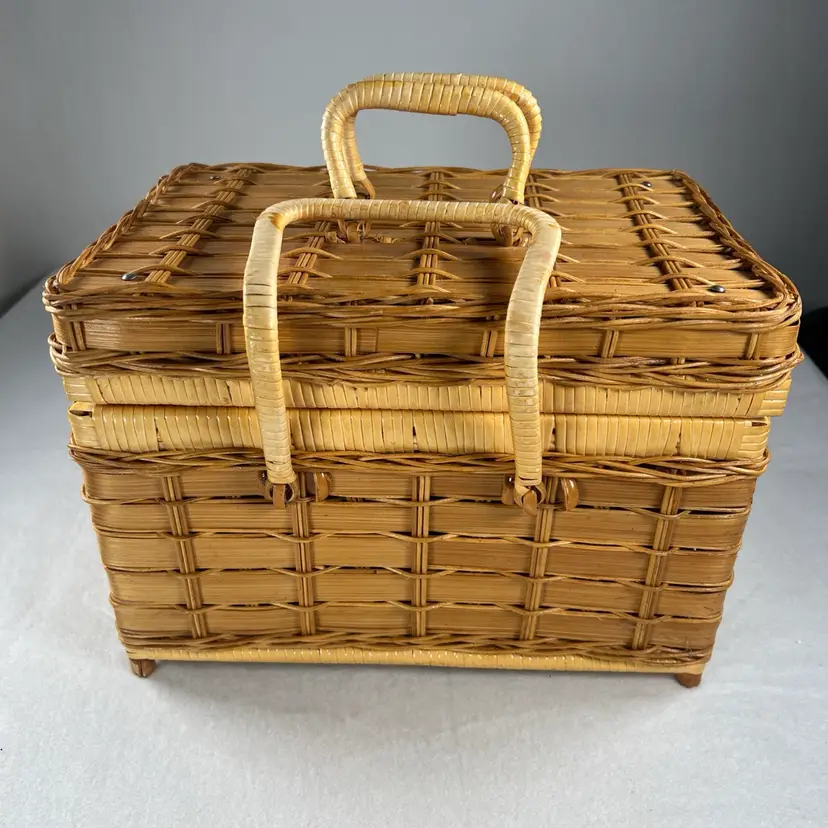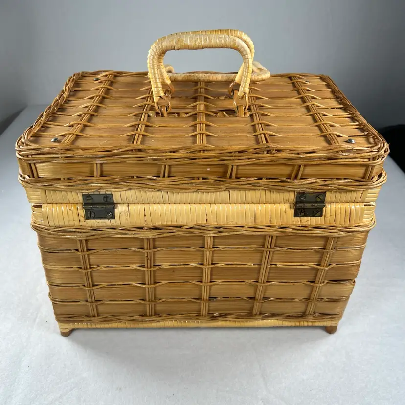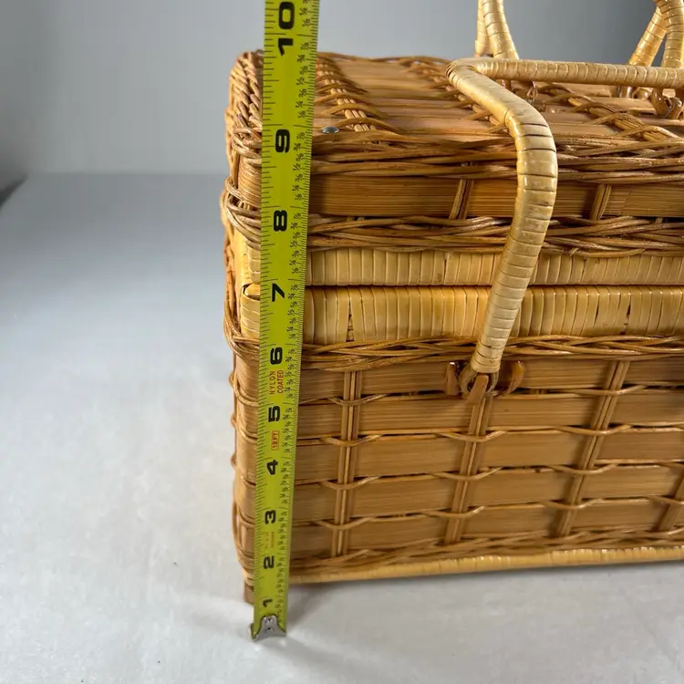 Measuring 12"x8"x9", this large basket is ideal for carrying all your picnic essentials. It comes with a lid and has a textured feel to it. The basket is in excellent used condition and is a great addition to any collection.