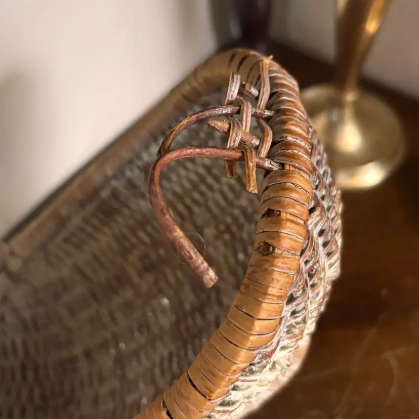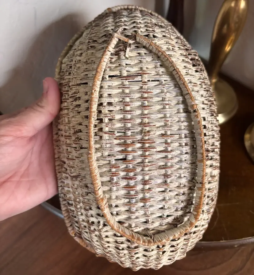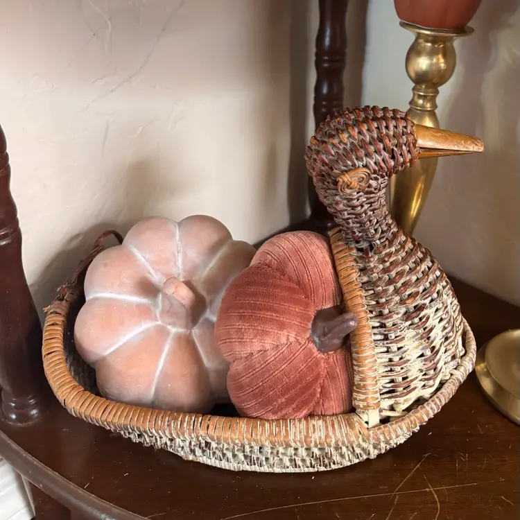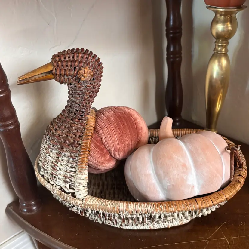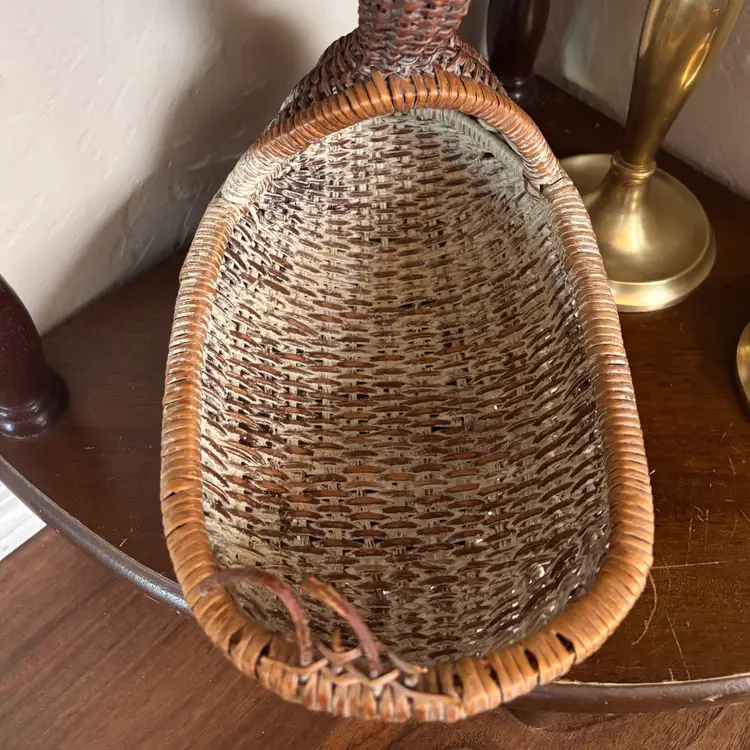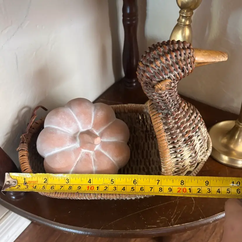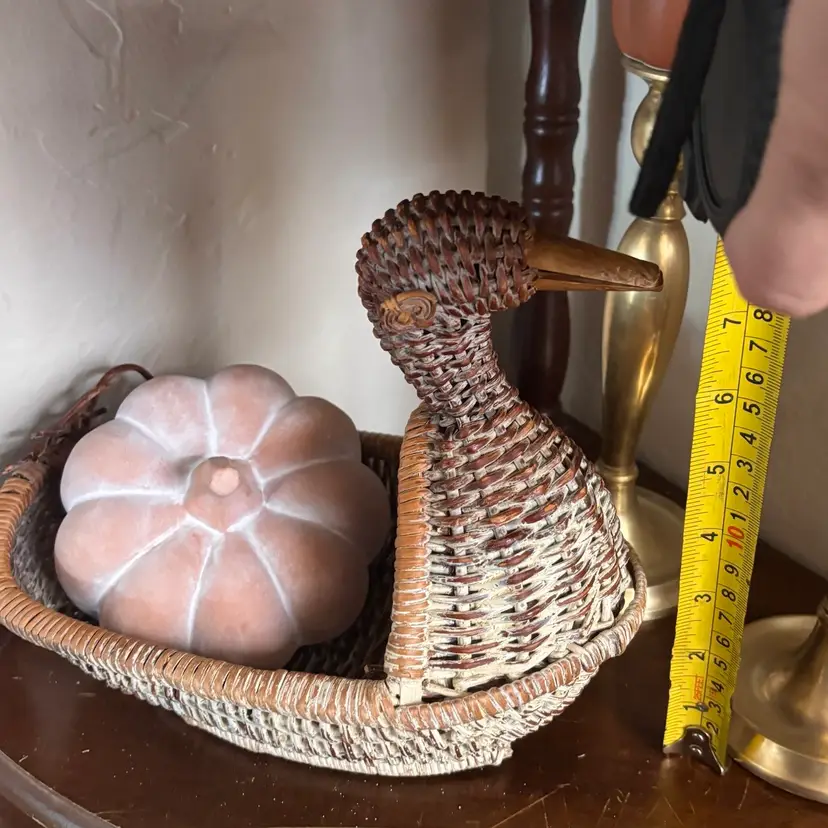 Adorable duck basket w/wooden beak 8”tall x 9”long x 6”wide Vintage wear as shown- paint loss, tail is coming apart and bottom rim is loose