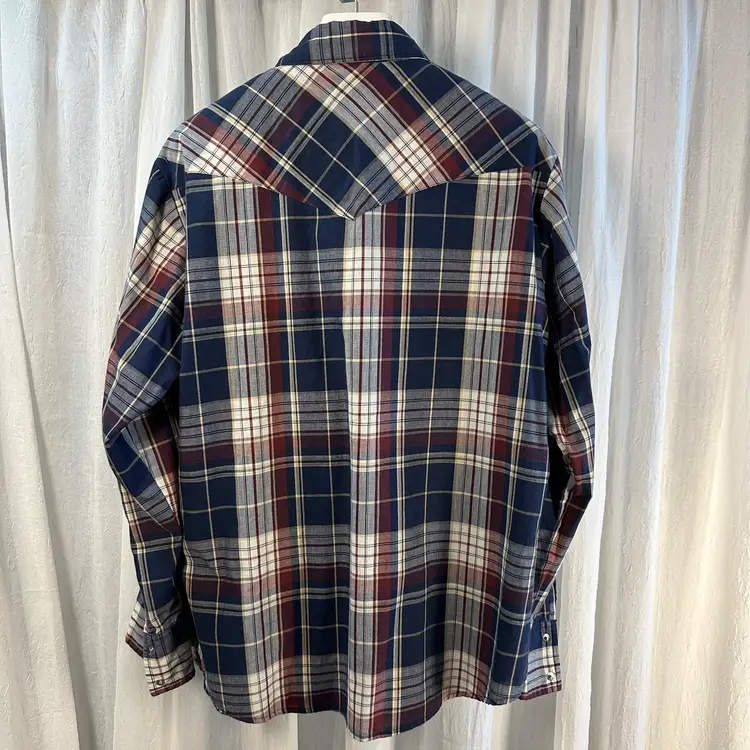 Vintage Wrangler Shirt Mens Large Button Up Pearl Snap Long Sleeve Blue Plaid