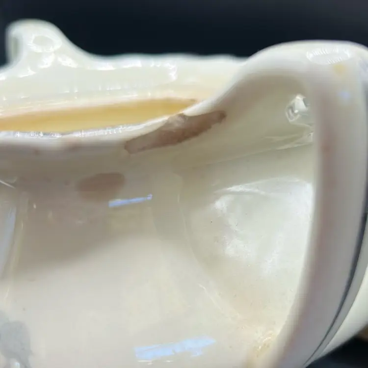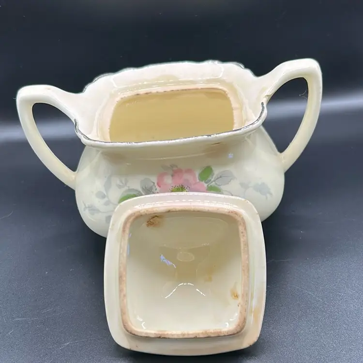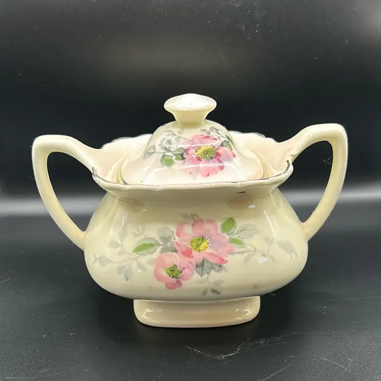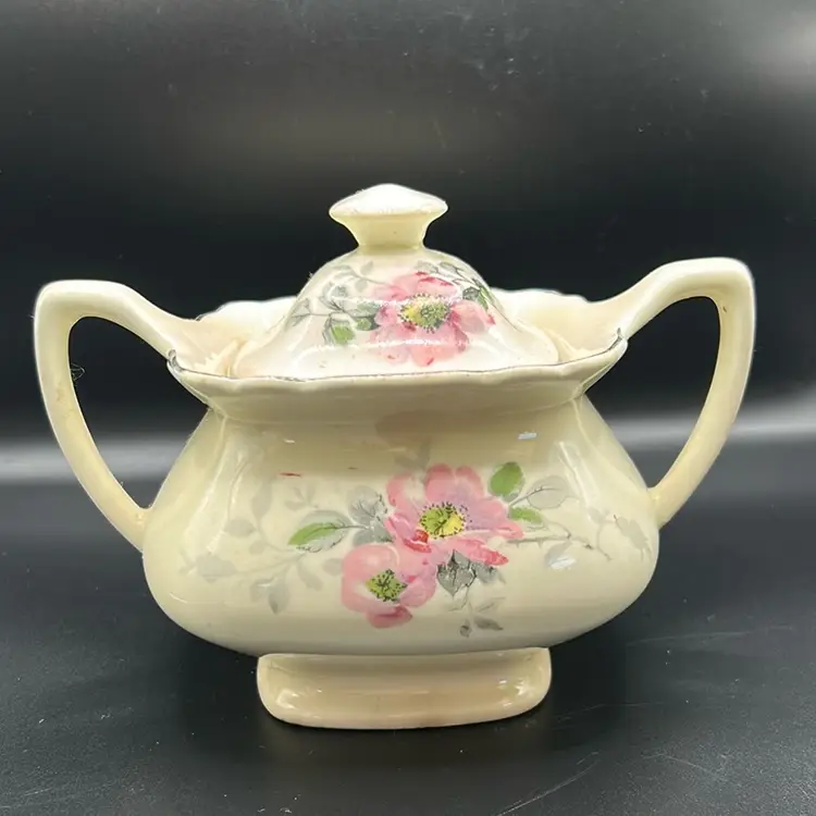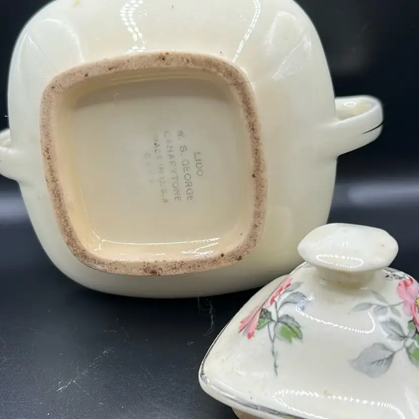 This is a WS George Lido Canary time sugar bowl it features pink floral designs with gray leaves just from the mid 20th century. There is one flaw as shown in the last picture has a small chip near the near the handle it stands. 4 1/2 inches tall and 6 inches across including the handles.