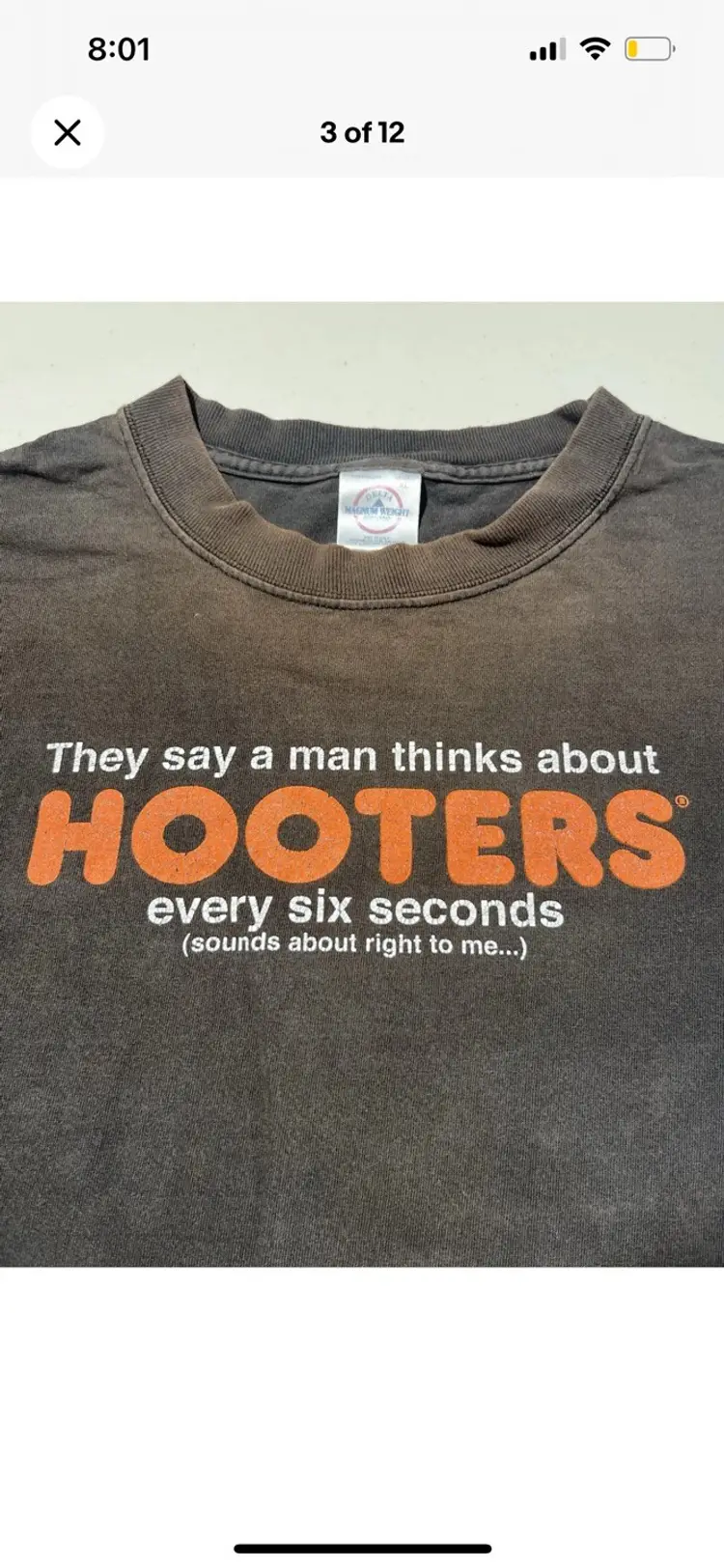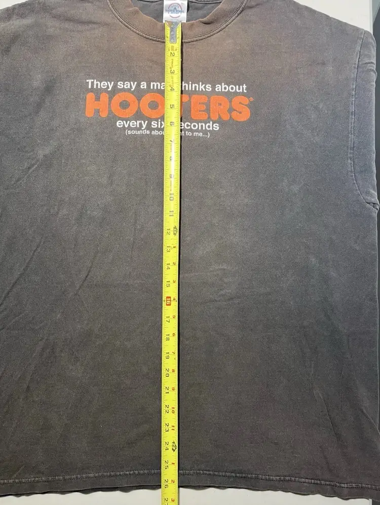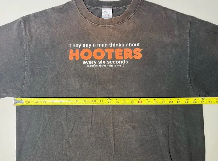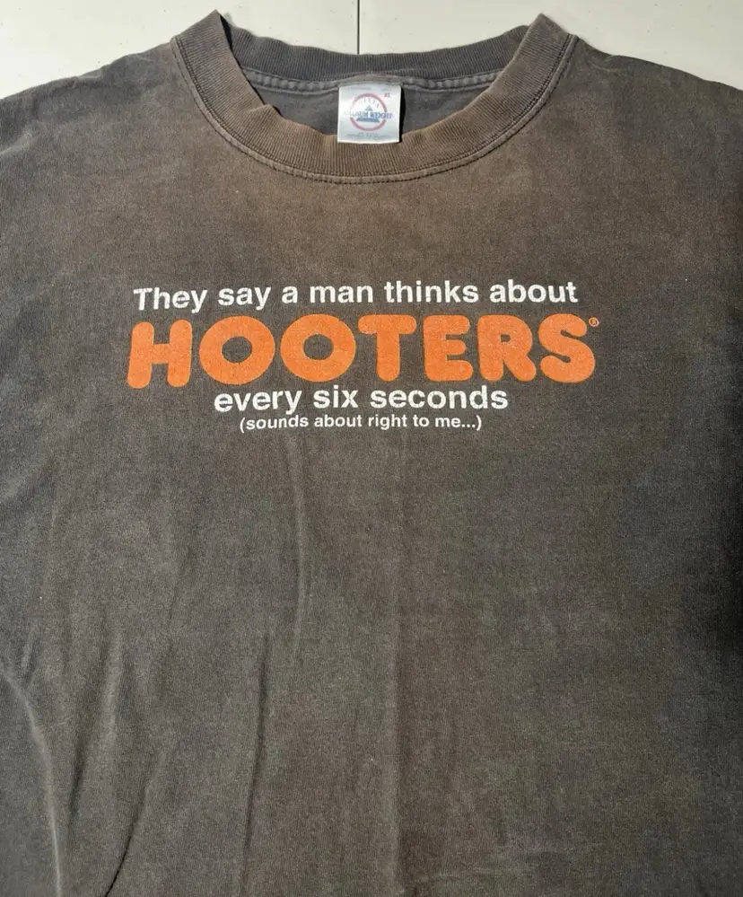 See all photos for condition. Distressed/discolored Y2K Hooters T-shirt. Men’s size, XL delta magnum weight tag made in the US. Lettering on shirt has cracks from wear and wash. Short is discolored from washing and poor storage. Selling as is in distressed condition. Rare funny novelty Hooters T-shirt